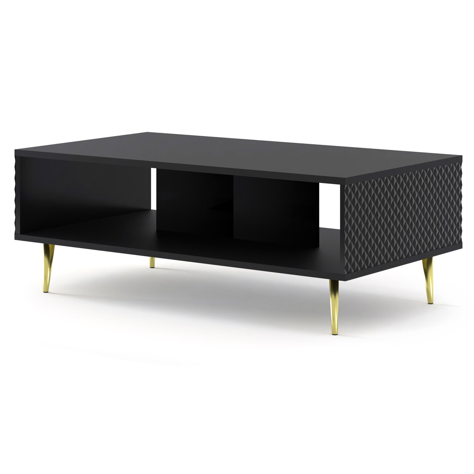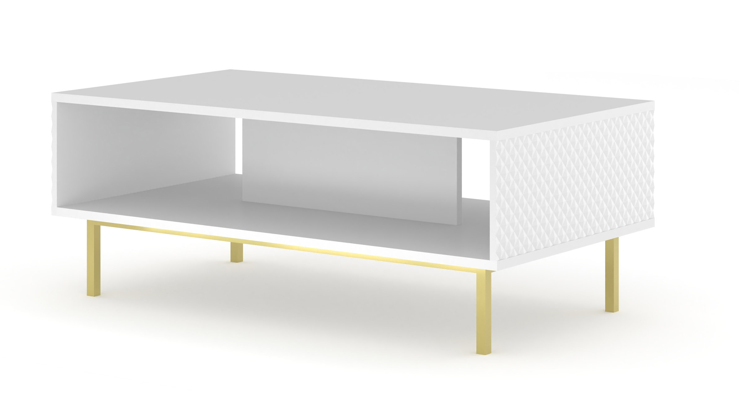 Kolekcja Ravenna w wersji ze złotymi detalami to propozycja dla osób, które pragną stworzyć wnętrze pełne blasku i finezji. Prezentowany stolik kawowy to idealne dopełnienie luksusowego salonu, gdzie każdy element ma przyciągać wzrok. Najbardziej spektakularnym detalem mebla jest boczny front wykonany z płyty MDF z precyzyjnym frezem typu diament. Lśniące wykończenie w wysokim połysku sprawia, że biała powierzchnia efektownie odbija światło, wydobywając trójwymiarowość geometrycznego wzoru, co nadaje strefie kawowej unikalnego sznytu w stylu modern glamour.