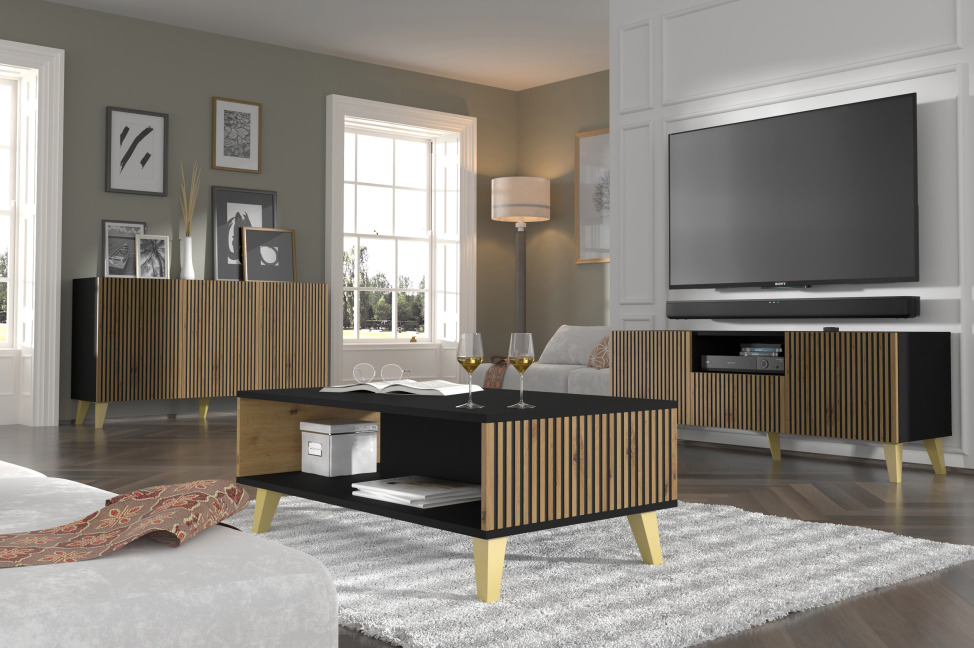 Stolik kawowy Ravenna to designerskie centrum Twojej strefy wypoczynku, które łączy nowoczesną surowość z naturalnym detalem. Ten wyjątkowy mebel przyciąga wzrok nietuzinkową kolorystyką: głęboka czerń frontu została przełamana precyzyjnym frezowaniem w odcieniu dębu artisan, tworząc efektowny, graficzny kontrast. Prostokątna bryła osadzona na biżuteryjnych, złotych nóżkach oferuje nie tylko szeroki blat na filiżankę kawy, ale także praktyczną, przestronną półkę na ulubione czasopisma i piloty. Dzięki harmonii czerni, drewna i złota, ława Ravenna staje się luksusowym akcentem, który nadaje salonowi wyrafinowanego charakteru.