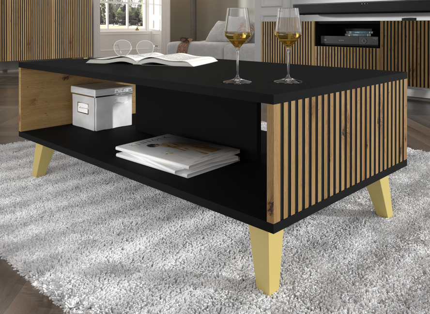 Stolik kawowy Ravenna F 90×60 czarny mat / dąb artisan szpilka złota plastikowa