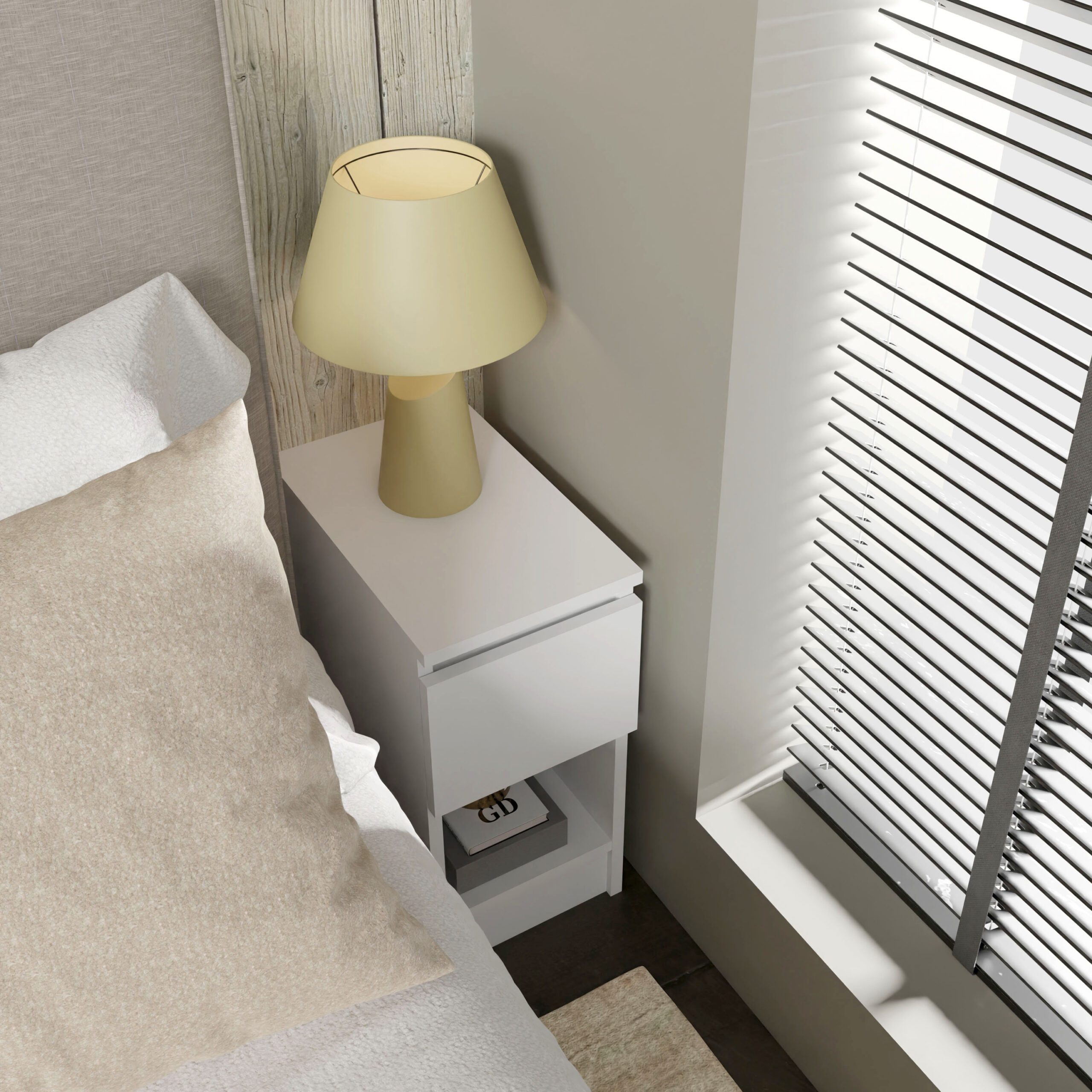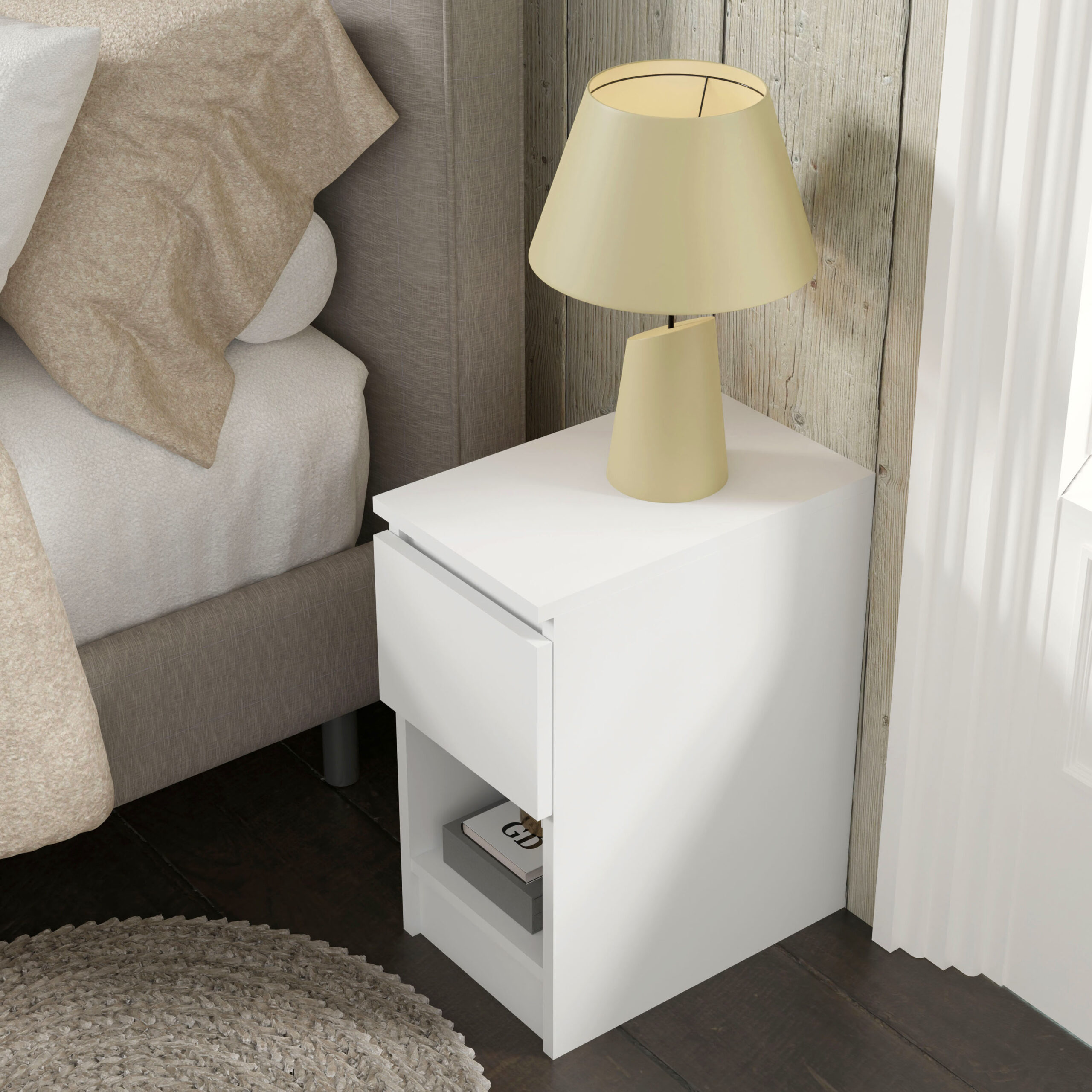 Szafka nocna z serii MAJA to idealne rozwiązanie dla osób, które cenią sobie spokój i estetykę w miejscu odpoczynku. Choć jest to najmniejszy element kolekcji, jego wpływ na funkcjonalność sypialni jest nie do przecenienia. Dzięki przemyślanej, kompaktowej formie, mebel ten idealnie wpasowuje się nawet w niewielkie przestrzenie przy łóżku, tworząc nowoczesną i uporządkowaną strefę relaksu. Białe, matowe wykończenie oraz prosta bryła wnoszą do wnętrza powiew świeżości i wizualną lekkość, która sprzyja wyciszeniu przed snem.