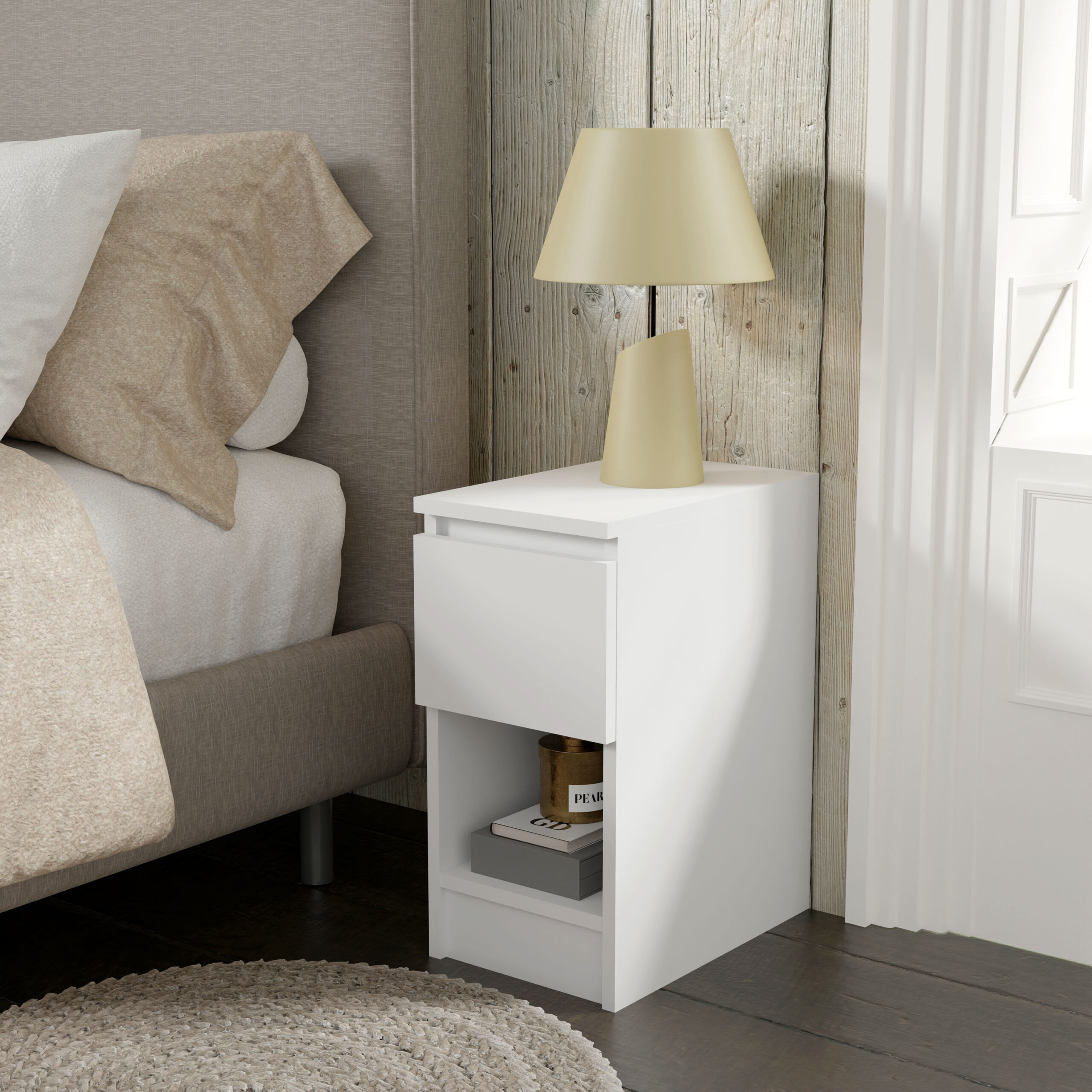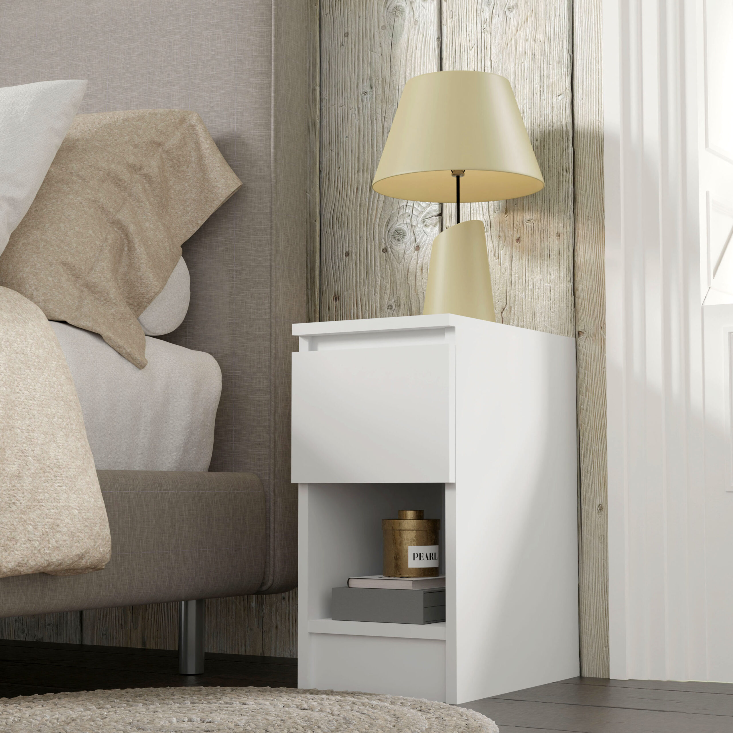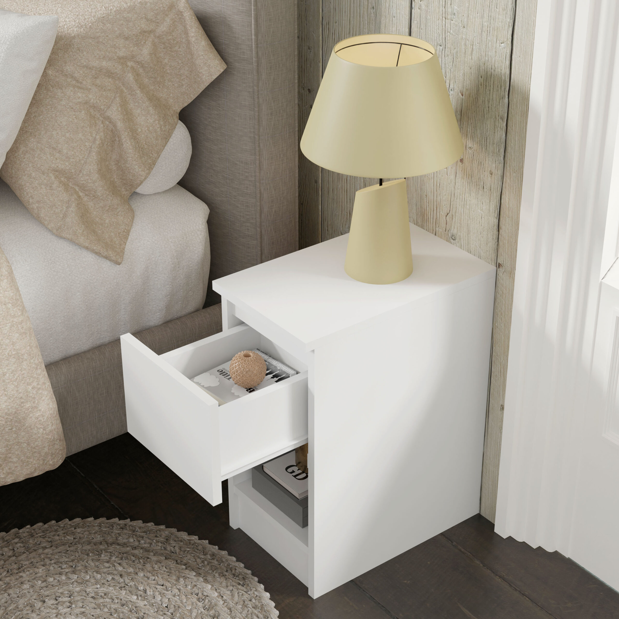 Decydując się na ten model, zyskujesz codzienną wygodę na wyciągnięcie ręki. Pojemna szuflada z innowacyjnym, bezuchwytowym systemem otwierania pozwala na dyskretne ukrycie książki, ładowarki czy kosmetyków, dzięki czemu blat szafki pozostaje wolny od zbędnych przedmiotów. Gładki front bez tradycyjnych uchwytów nie tylko podkreśla minimalistyczny charakter mebla, ale również ułatwia utrzymanie go w nieskazitelnej czystości. To subtelny akcent, który sprawia, że Twoje otoczenie staje się bardziej harmonijne i spójne stylistycznie.