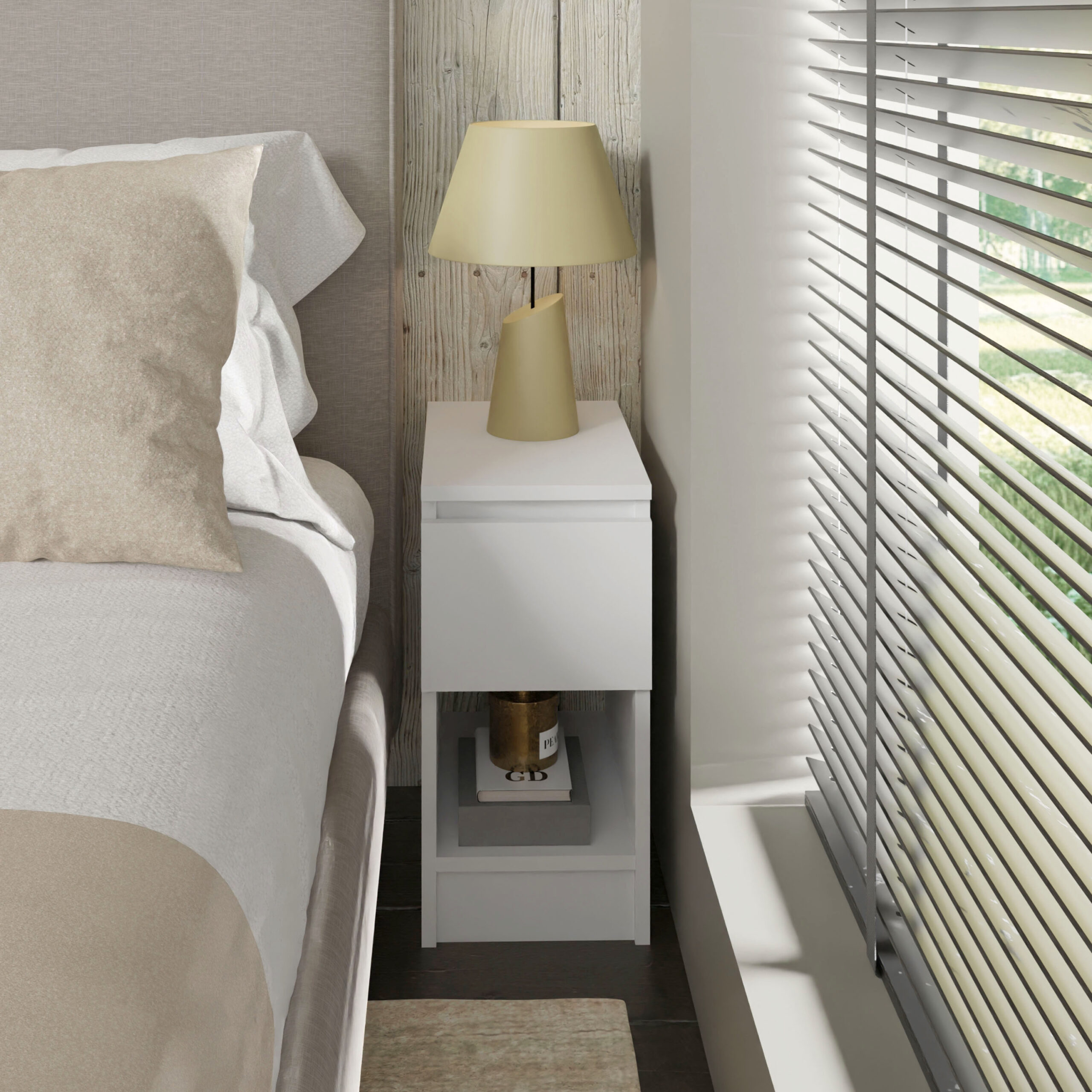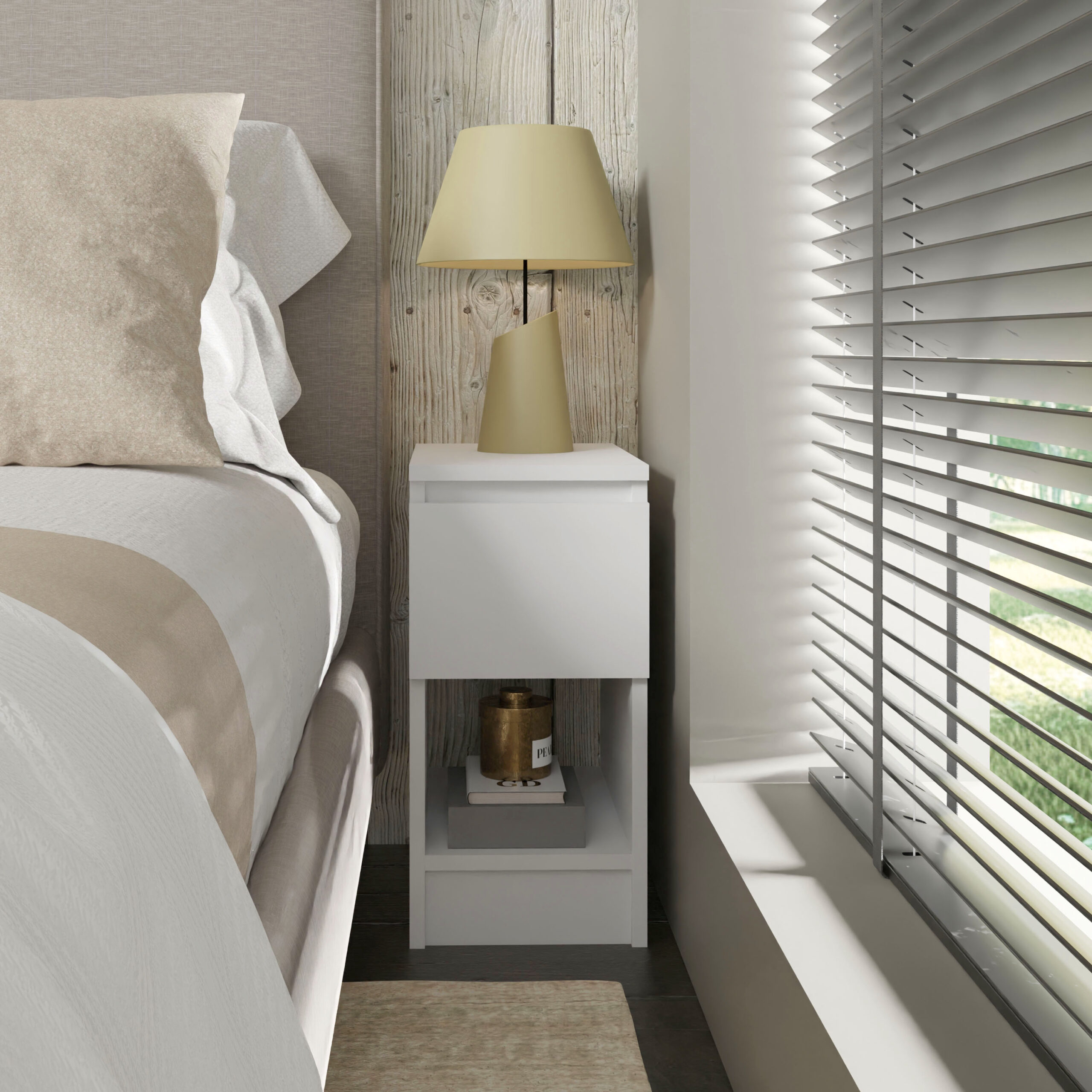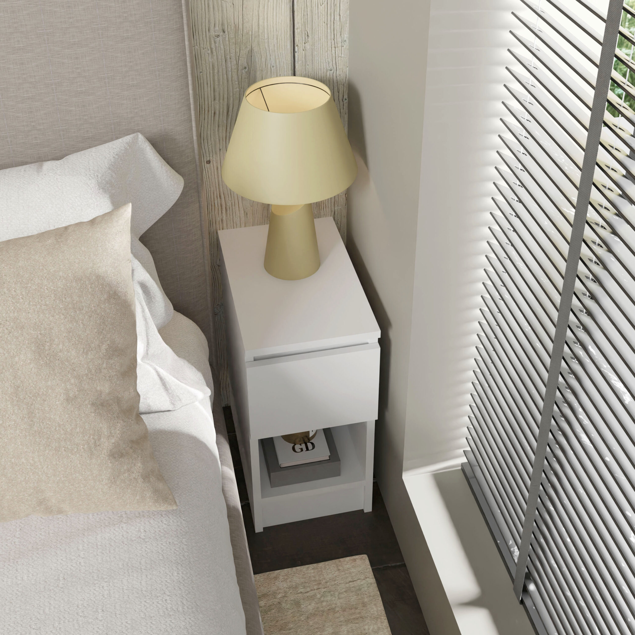 Decydując się na ten model, zyskujesz codzienną wygodę na wyciągnięcie ręki. Pojemna szuflada z innowacyjnym, bezuchwytowym systemem otwierania pozwala na dyskretne ukrycie książki, ładowarki czy kosmetyków, dzięki czemu blat szafki pozostaje wolny od zbędnych przedmiotów. Gładki front bez tradycyjnych uchwytów nie tylko podkreśla minimalistyczny charakter mebla, ale również ułatwia utrzymanie go w nieskazitelnej czystości. To subtelny akcent, który sprawia, że Twoje otoczenie staje się bardziej harmonijne i spójne stylistycznie.