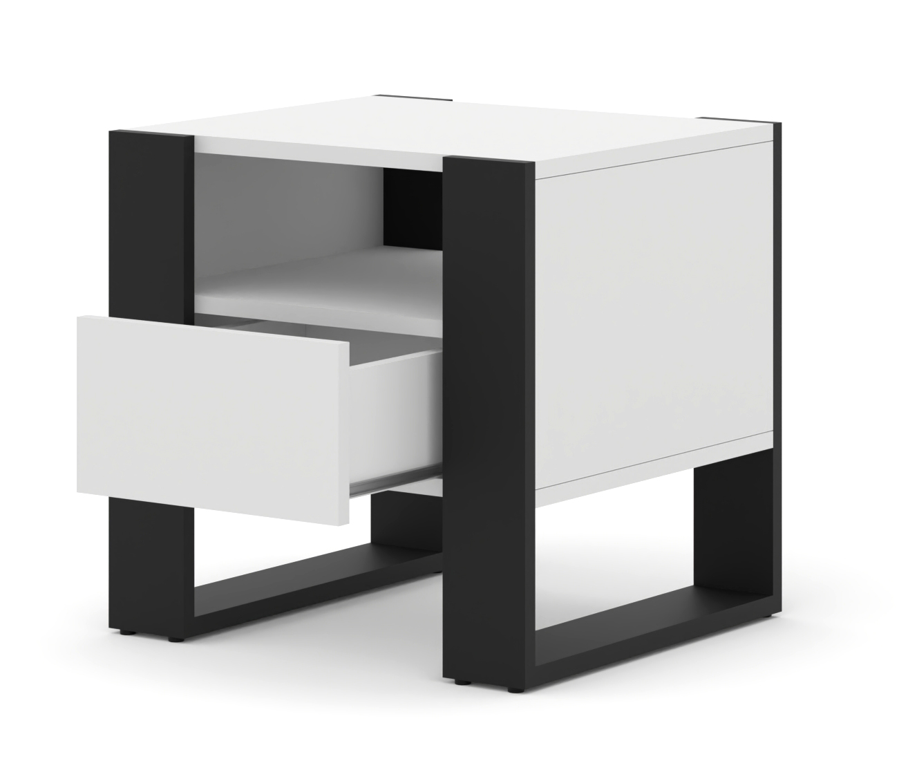 Szafka nocna Mondi to wyrazisty akcent, który wnosi do sypialni nowoczesny minimalizm i architektoniczny porządek. Połączenie nieskazitelnego, białego matu z surową, czarną ramą nóg tworzy efektowny kontrast,