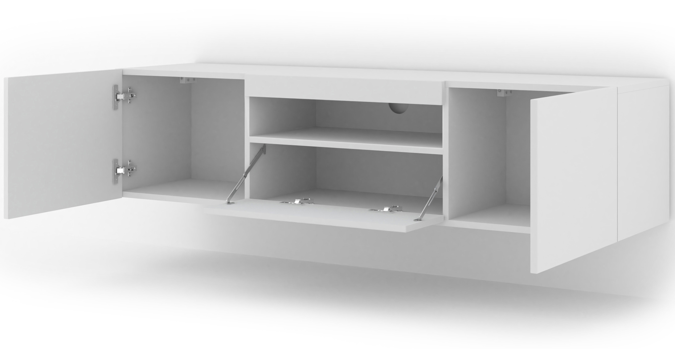 Twoja domowa elektronika w końcu znajdzie swoje stałe, uporządkowane miejsce. Aura oferuje inteligentny system przechowywania, który łączy otwarte przestrzenie z dyskretnymi schowkami. Centralna, otwarta wnęka to idealna przestrzeń na dekoder czy konsolę, zapewniająca swobodny dostęp do urządzeń i cyrkulację powietrza. Dodatkowo trzy zamykane szafki – dwie otwierane na boki oraz jedna uchylana ku dołowi – dają Ci mnóstwo miejsca na ukrycie akcesoriów, kolekcji gier czy dokumentów. Wszystko to, czego nie chcesz trzymać na widoku, zostaje bezpiecznie schowane za gładkimi, bezuchwytowymi frontami.