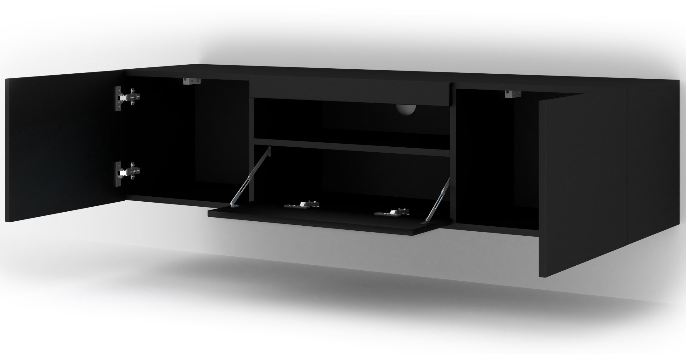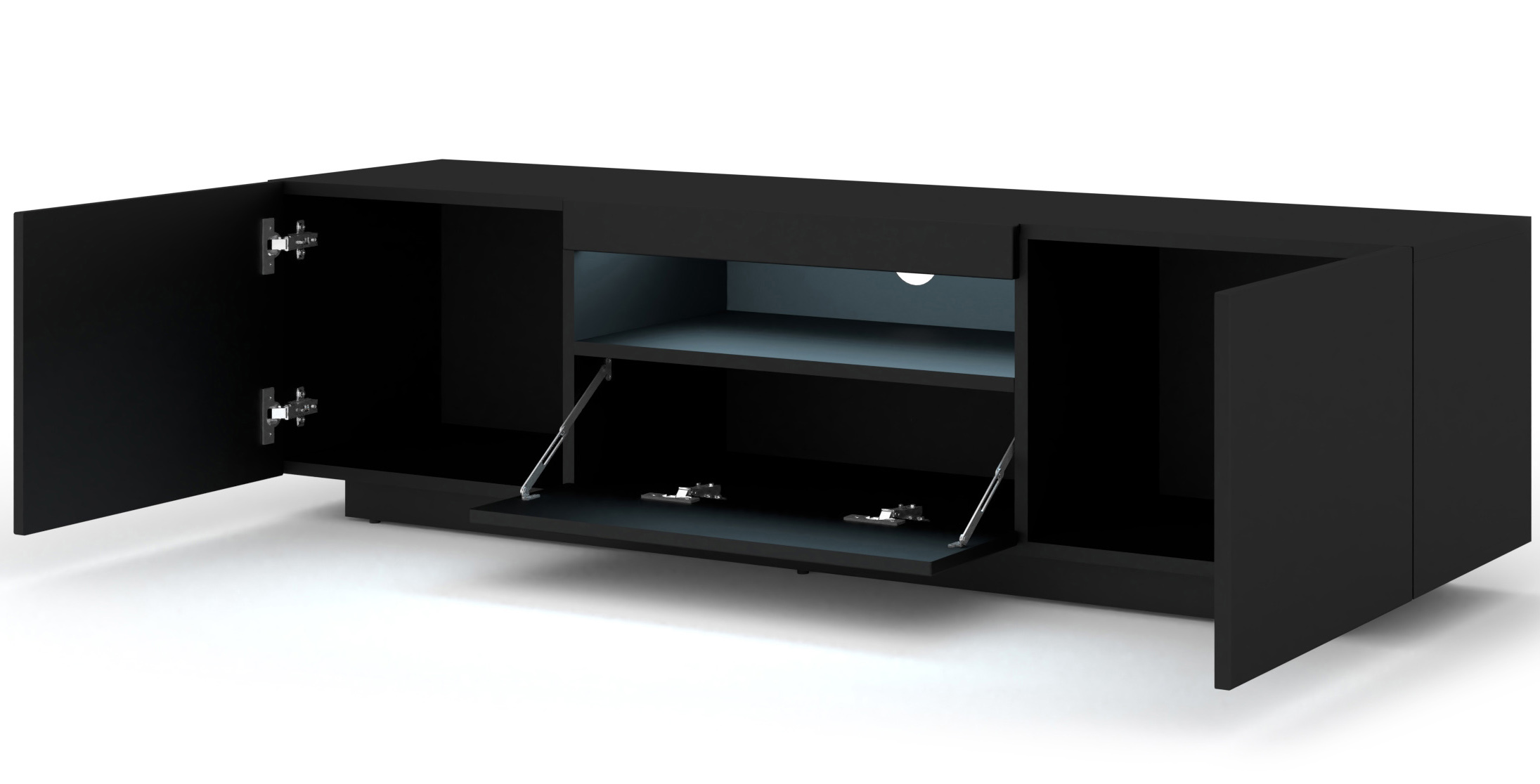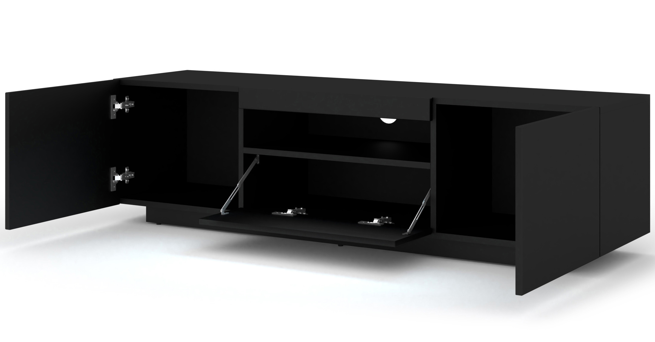 Wnętrze szafki zostało zaprojektowane tak, aby sprostać wymaganiom każdego fana technologii. Centralna, otwarta półka to doskonałe miejsce na sprzęt multimedialny – dzięki brakowi zabudowy urządzenia mają zapewnioną idealną wentylację, a dedykowany otwór na kable pozwala ukryć całe okablowanie za plecami mebla. Dodatkowe trzy schowki (dwa otwierane na boki i jeden uchylny ku dołowi) to dyskretna przestrzeń na wszystko, co chcesz mieć pod ręką, ale poza zasięgiem wzroku. System bezuchwytowy sprawia, że fronty pozostają idealnie gładkie, co podkreśla minimalistyczny i luksusowy charakter szafki.