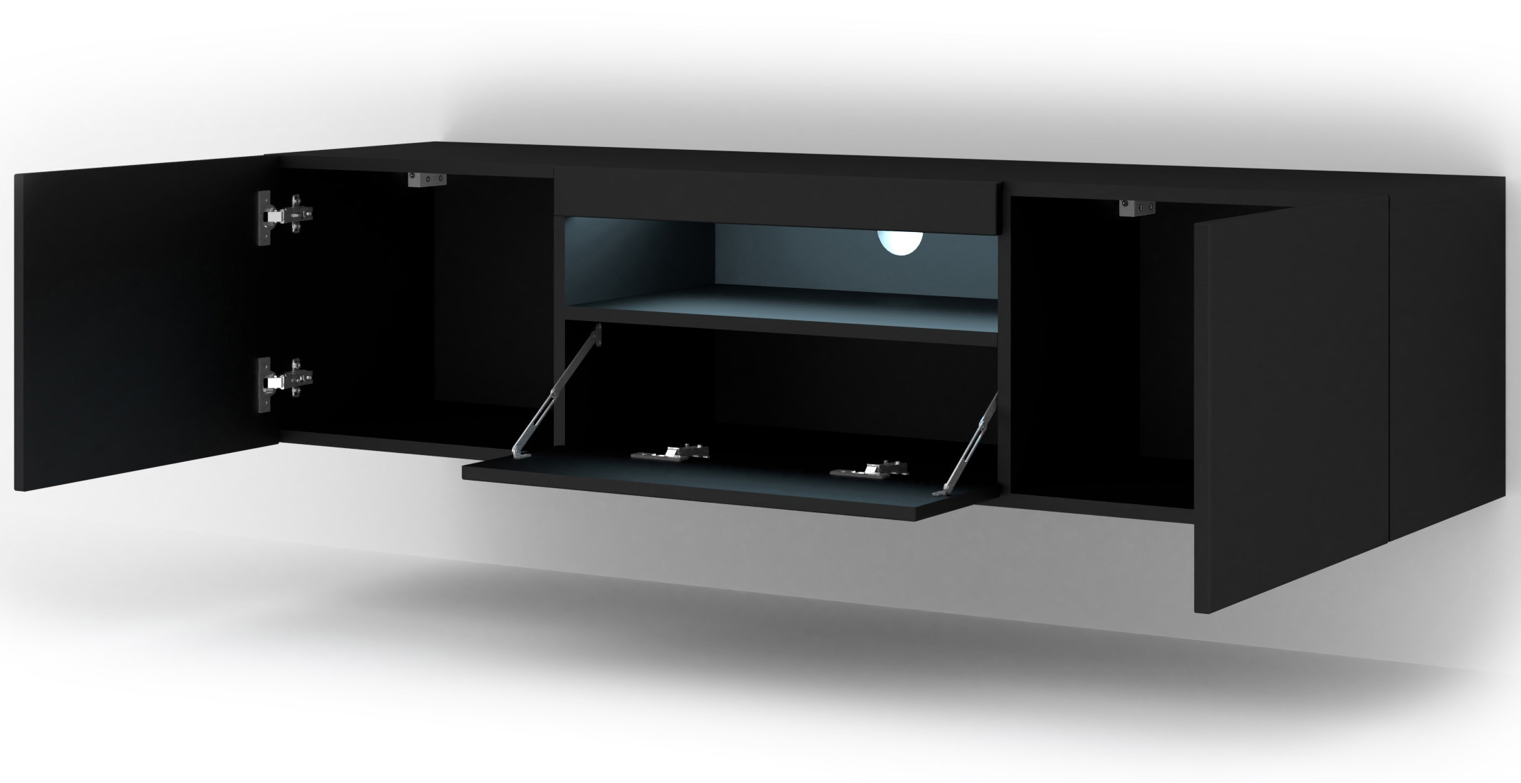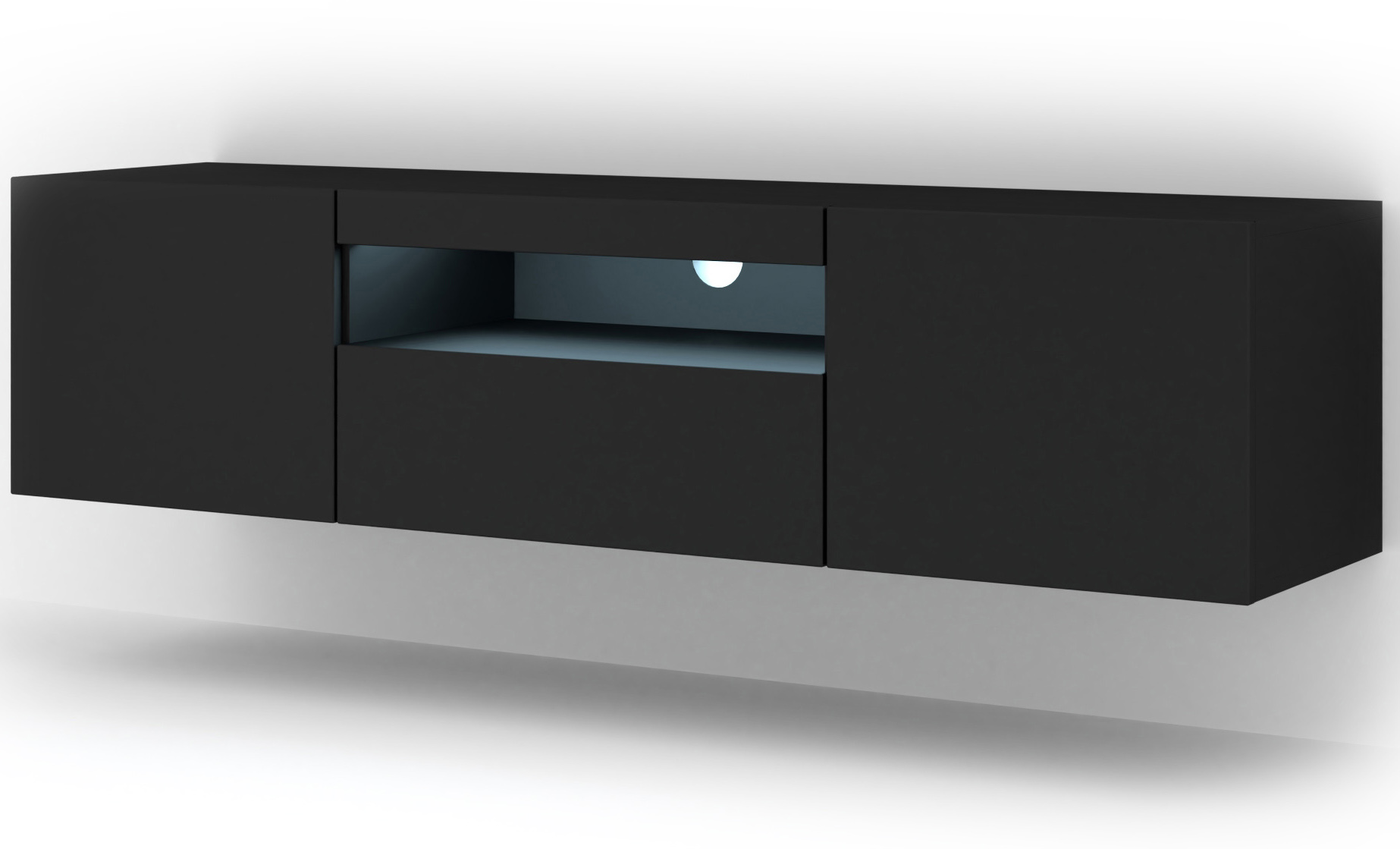 Zmień swój salon w prywatną salę kinową dzięki szafce RTV Aura w głębokim, czarnym macie z efektownym oświetleniem LED. Ta dwumetrowa bryła to połączenie odważnego designu z niezwykłą funkcjonalnością – zintegrowane światło podkreśla nowoczesną linię mebla, nadając mu luksusowego sznytu. Wybierz montaż wiszący, aby uzyskać efekt lewitującej, świetlistej ramy, lub postaw ją na solidnym cokole. Cztery pojemne schowki oraz otwarta wnęka z otworem na kable pozwolą Ci stworzyć idealnie uporządkowane i nastrojowe centrum domowej rozrywki.