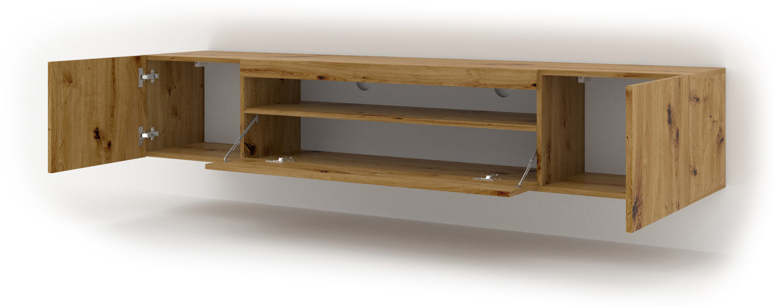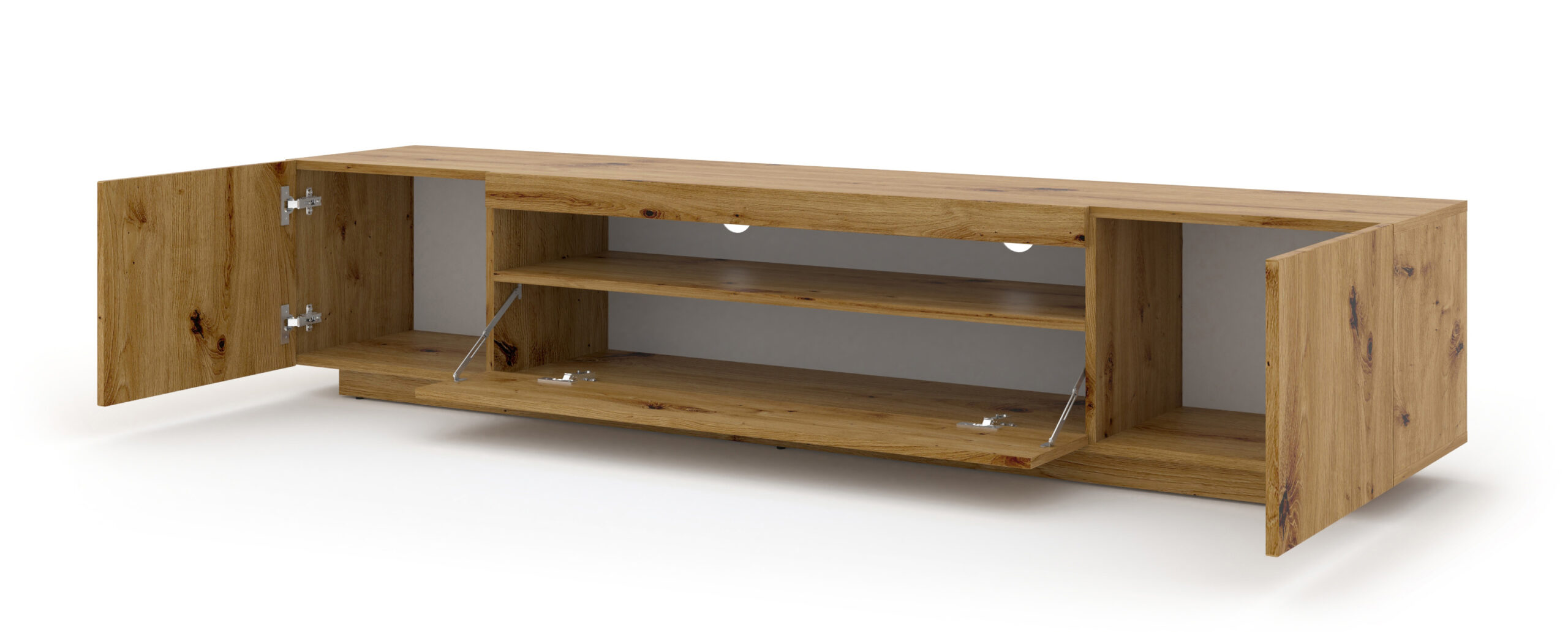 Projekt szafki Aura został zorientowany na maksymalną użyteczność. Centralny punkt mebla stanowi otwarta, metrowa wnęka, idealnie przystosowana do przechowywania soundbarów, konsol czy dekoderów. Tylna płyta posiada dedykowany otwór na kable, co pozwala na estetyczne ukrycie przewodów i zachowanie nienagannego porządku. Dopełnieniem funkcjonalności są trzy pojemne schowki: dwa otwierane bocznie oraz jeden z frontem uchylnym (otwierany do dołu). Taki układ pozwala na wygodne posegregowanie akcesoriów, gier i dokumentów, które mają pozostać niewidoczne dla gości.