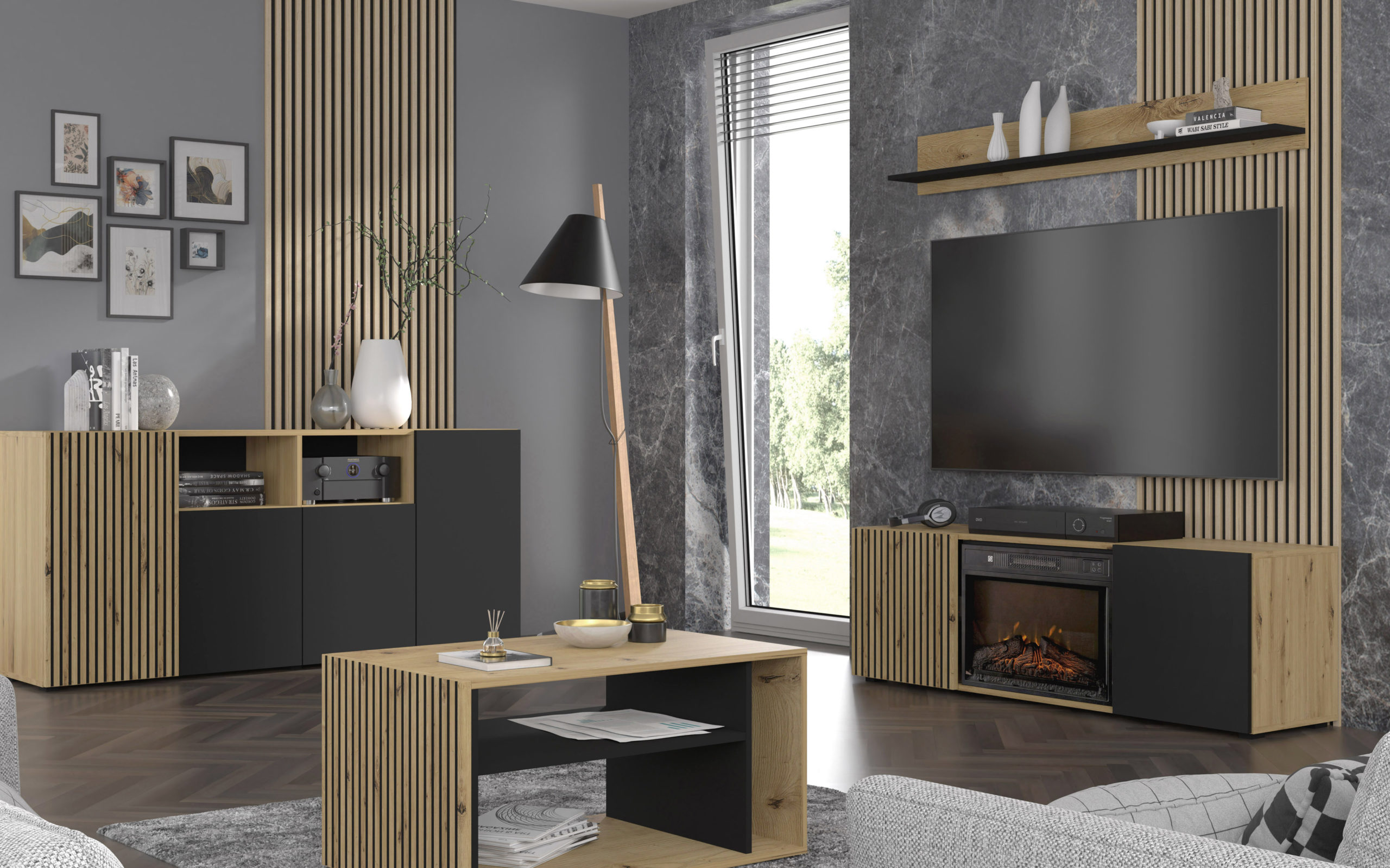 Mimo zaawansowanej technologii, Auris pozostaje meblem rzetelnym i praktycznym. Po bokach kominka znajdują się dwie pojemne szafki z systemem bezuchwytowym push to open, które pomieszczą elektronikę, dokumenty czy kolekcję filmów. Korpus szafki wykonano z trwałej płyty laminowanej o grubości 16 mm, a krawędzie zabezpieczono grubym obrzeżem ABS (0,6 mm), co chroni mebel przed uszkodzeniami i wilgocią. Dekoracyjne lamele z płyty MDF nadają całości unikalnej głębi, która wspaniale współgra z tańczącymi płomieniami.