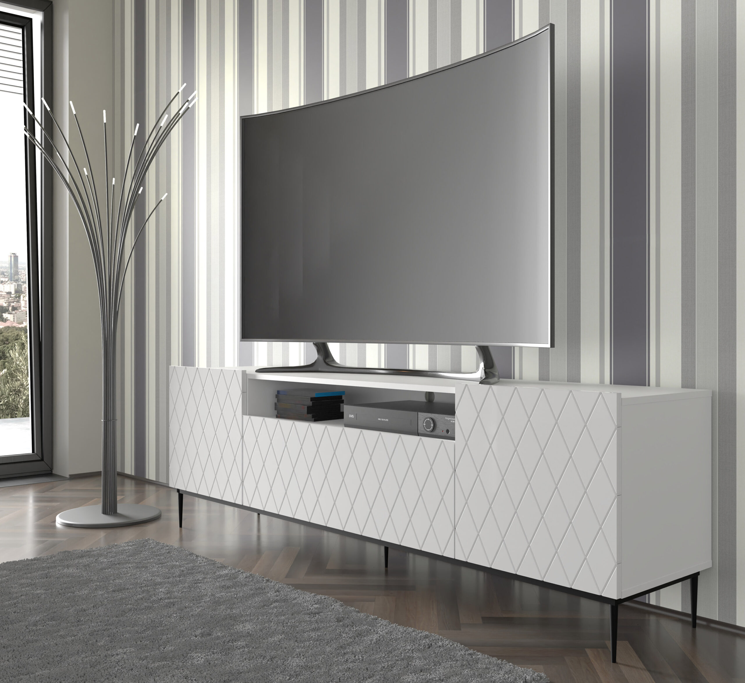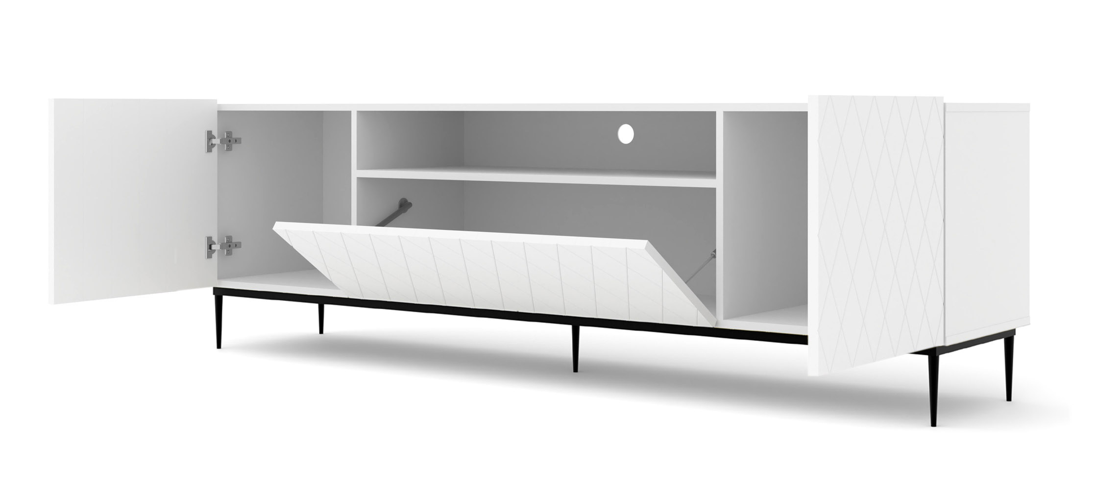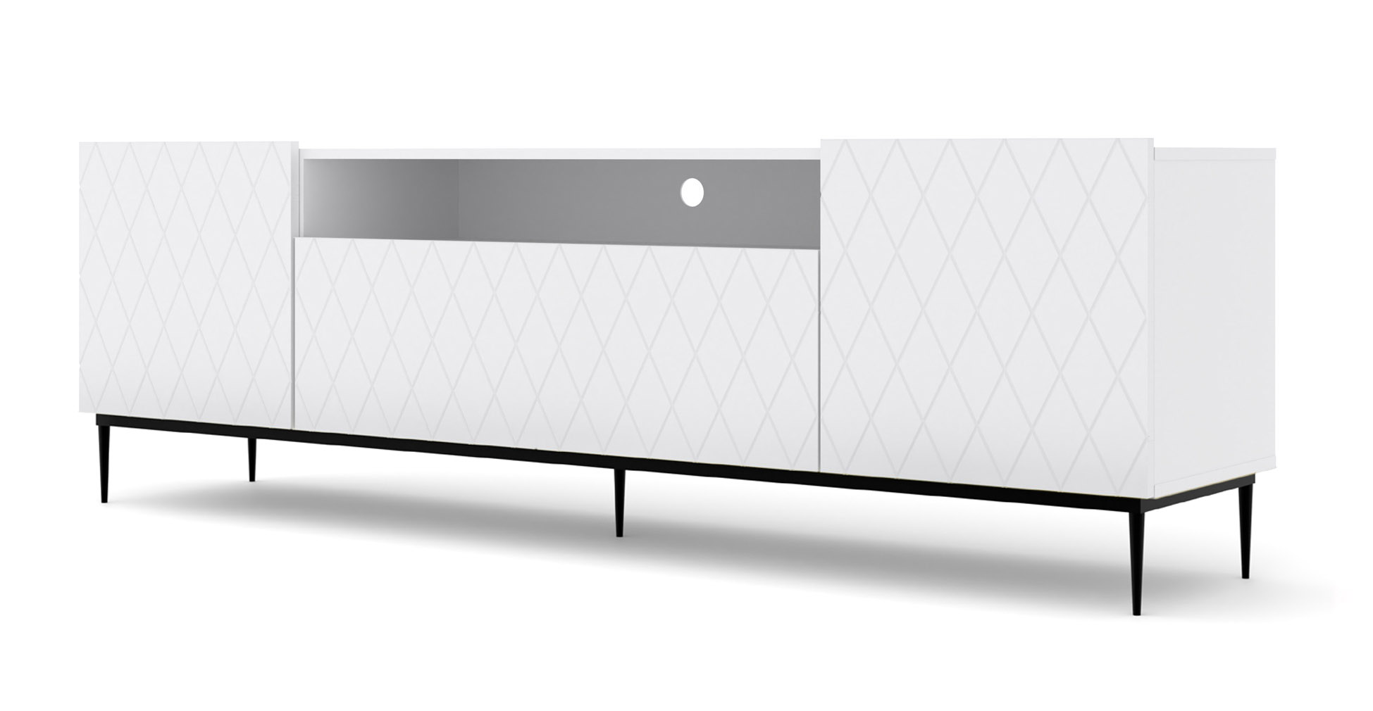 Wnętrze szafki zostało zaprojektowane z myślą o pełnej organizacji nowoczesnego sprzętu elektronicznego oraz domowych akcesoriów. Trzy niezależne, zamykane szafki oferują mnóstwo miejsca na przechowywanie kolekcji filmów, gier czy dokumentów, pozwalając ukryć je przed wzrokiem gości i zachować nienaganny porządek w pokoju dziennym. Rezygnacja z klasycznych uchwytów na rzecz nowoczesnego mechanizmu otwierania przez dotyk podkreśla minimalistyczny rodowód kolekcji. Dzięki temu fasada szafki pozostaje nieskazitelnie czystą płaszczyzną dekoracyjną, na której wzór rombów może wybrzmieć w pełnej okazałości, reagując na każdą zmianę oświetlenia w pomieszczeniu.