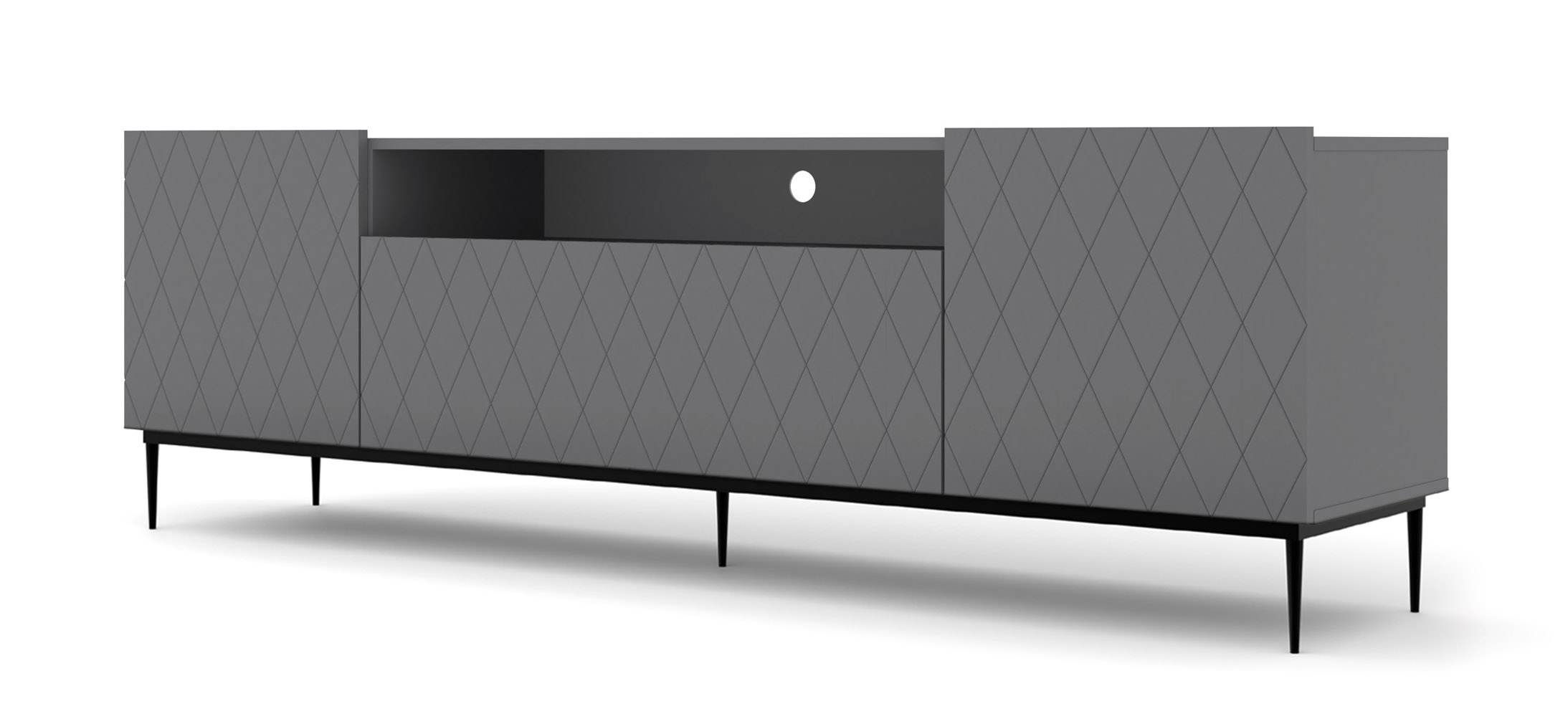 Grafitowa szafka RTV z kolekcji Diuna to wyrazisty akcent współczesnego salonu, który łączy w sobie surową elegancję matowego wykończenia z odważnym wzornictwem frontów. Jej unikatowy charakter definiują precyzyjne frezowania w kształcie rombów, które nadają bryle rzeźbiarskiej formy i wprowadzają do wnętrza nowoczesną dynamikę. Wyposażona w trzy funkcjonalne szafki oraz system bezuchwytowy push to open, szafka ta stanowi idealne i niezwykle stylowe centrum domowej rozrywki. Dzięki szerokości wynoszącej blisko 145 centymetrów, mebel ten doskonale odnajdzie się zarówno w mniejszych apartamentach, jak i przestronnych loftach, stając się ich najbardziej dekoracyjnym elementem.