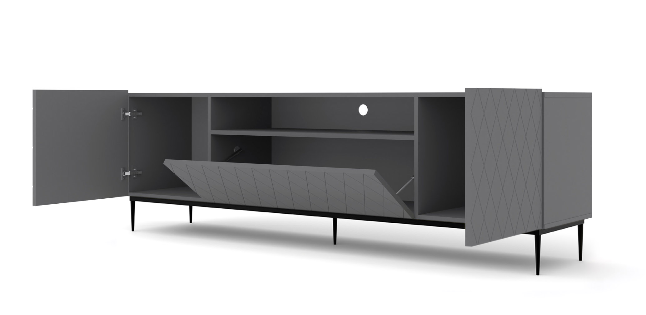 Jeżeli pragniesz urządzić strefę wypoczynkową, która wyróżnia się na tle standardowych projektów, grafitowa szafka pod telewizor z serii Diuna będzie wyborem idealnym. Wyrafinowany odcień matowego grafitu stanowi szlachetną alternatywę dla klasycznej czerni, nadając wnętrzu nowoczesny i dystyngowany charakter. Główną dekoracją mebla są kunsztownie frezowane fronty, których wzór w kształcie rombów sprawia, że fasada szafki staje się niemal trójwymiarowa. Ta unikatowa tekstura fascynująco reaguje na światło, tworząc subtelną grę cieni, która ożywia ścianę multimedialną i sprawia, że szafka staje się najważniejszym punktem dekoracyjnym w pomieszczeniu.