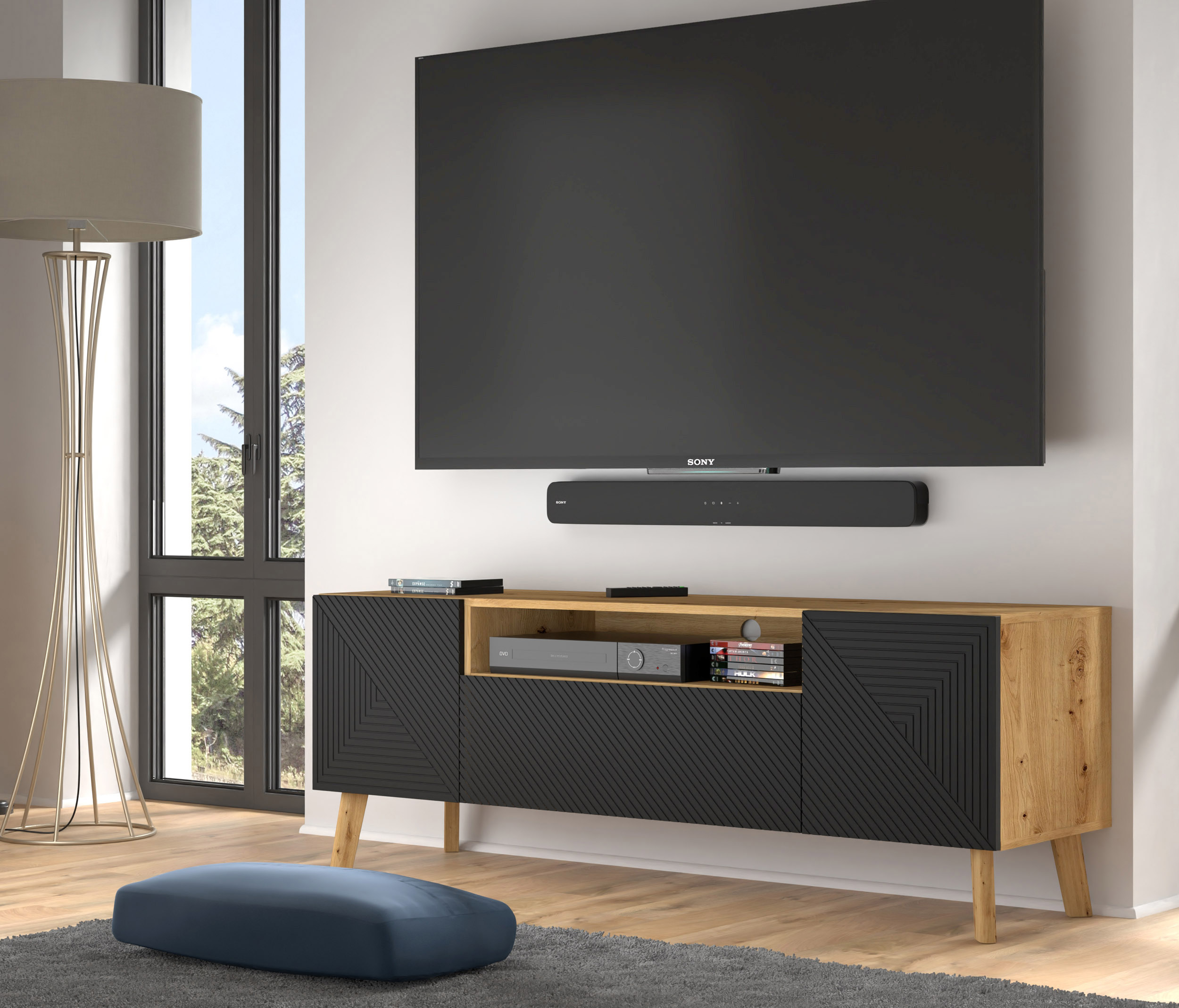 Projektując model Luxi, położono ogromny nacisk na ergonomię i porządek. W centralnej części mebla znajdują się dwie otwarte półki, idealne na konsolę, dekoder czy odtwarzacz. Fabryczne otwory na kable pozwalają na dyskretne wyprowadzenie przewodów, eliminując nieestetyczny chaos za urządzeniami. Po bokach oraz w sekcjach dolnych ukryto cztery zamykane schowki. Brak klasycznych uchwytów to ukłon w stronę minimalizmu – fronty otwierają się po delikatnym naciśnięciu dzięki innowacyjnemu systemowi push to open, co sprawia, że powierzchnia mebla pozostaje idealnie gładka i nowoczesna.