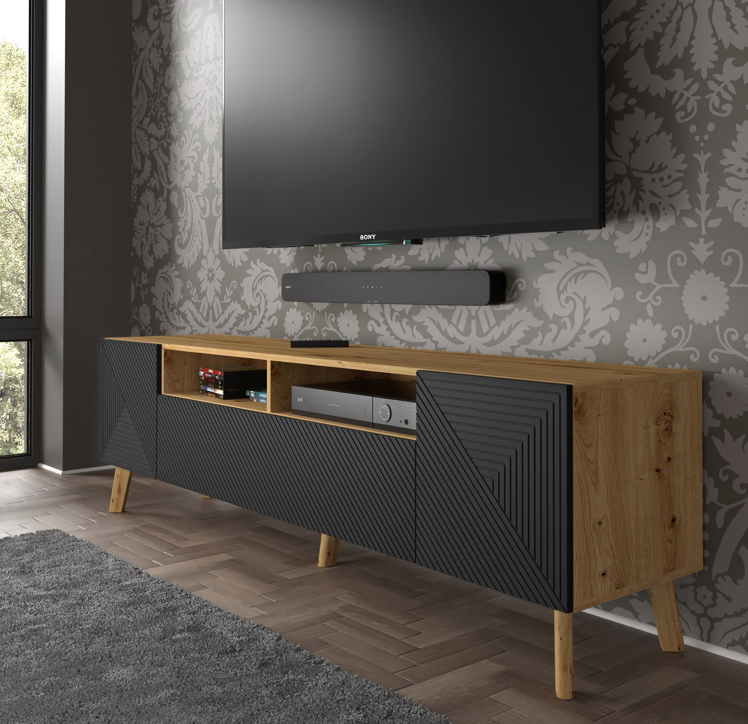 Nowoczesny kącik telewizyjny potrzebuje mebla, który udźwignie nie tylko wagę sprzętu, ale także wymagania estetyczne współczesnych wnętrz. Szafka RTV Luxi o szerokości 194,8 cm to projekt bezkompromisowy, łączący surowość loftowego stylu z ciepłem naturalnego dębu artisan. Matowe, czarne fronty z płyty MDF nadają bryle elegancji, a wysokie, skośne nogi z drewna wprowadzają skandynawski powiew świeżości. Dzięki takiemu zestawieniu, szafka staje się centralnym punktem salonu, przyciągając wzrok swoją niebanalną formą i starannym wykończeniem.