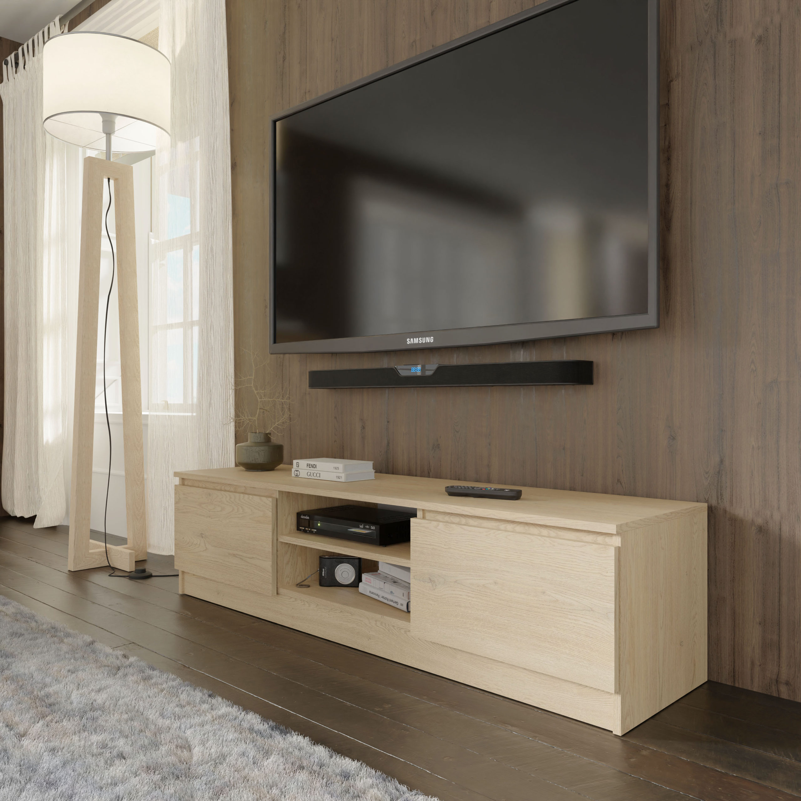 To, co wyróżnia ten model, to inteligentny podział funkcjonalny. Centralna sekcja składa się z dwóch otwartych półek, które są kluczowe dla urządzeń multimedialnych – zapewniają one naturalną wentylację oraz niezakłócony sygnał dla czujników podczerwieni. Zewnętrzne szafki, otwierane dyskretnie za krawędź frontu, pełnią rolę niewidocznych magazynów na wszystko, co mogłoby zakłócić porządek w salonie. Brak zewnętrznych okuć i uchwytów sprawia, że mebel prezentuje się jak spójny monolit, co ułatwia jego wkomponowanie zarówno w surowe lofty, jak i przytulne przestrzenie skandynawskie.