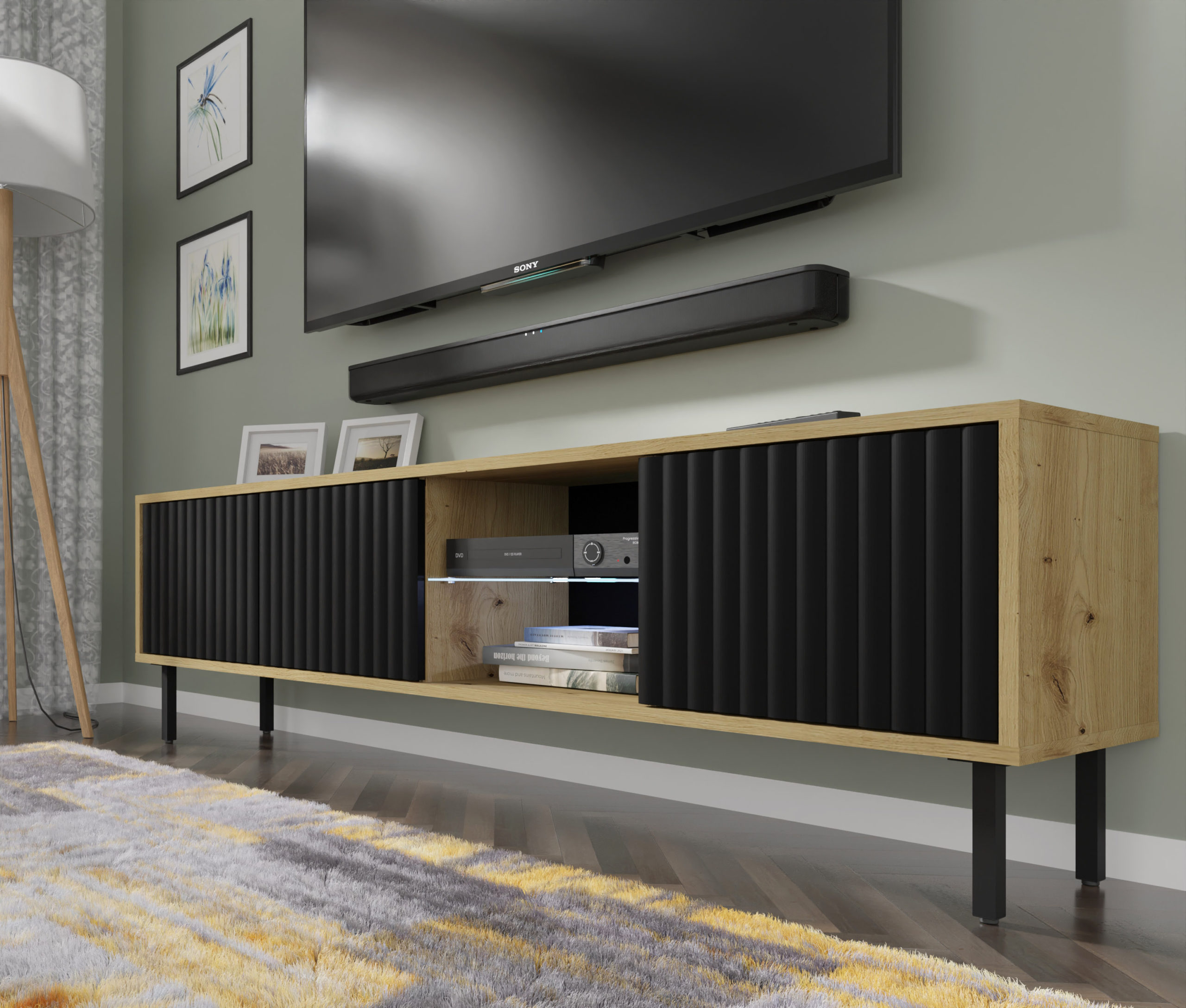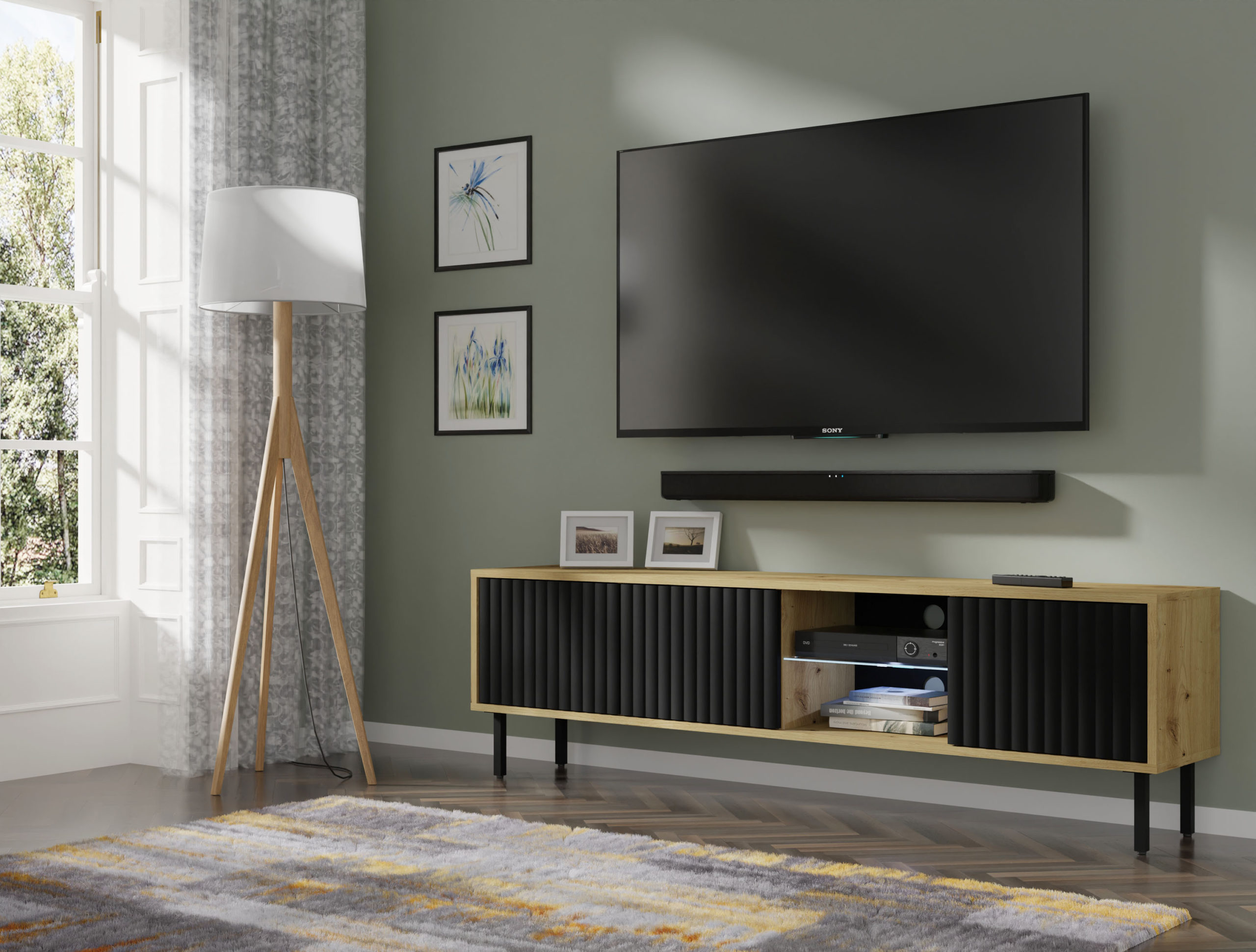 Szafka RTV MITA w wybarwieniu dębu artisan z czarnymi, frezowanymi frontami to kwintesencja stylu loftowego w nowoczesnym wydaniu. Połączenie ciepłej tekstury drewna z matową głębią czerni tworzy mebel o niezwykle silnym charakterze, który staje się centralnym punktem salonu. Trzydrzwiowa konstrukcja z wpuszczanymi frontami i centralną szklaną wnęką oferuje nie tylko prestiżowy wygląd, ale i inteligentną organizację multimediów. Dzięki systemowi PUSH TO OPEN oraz wiszącej formie, MITA łączy surowość industrialnych materiałów z lekkością i komfortem, jakich oczekuje się od współczesnych mebli premium.