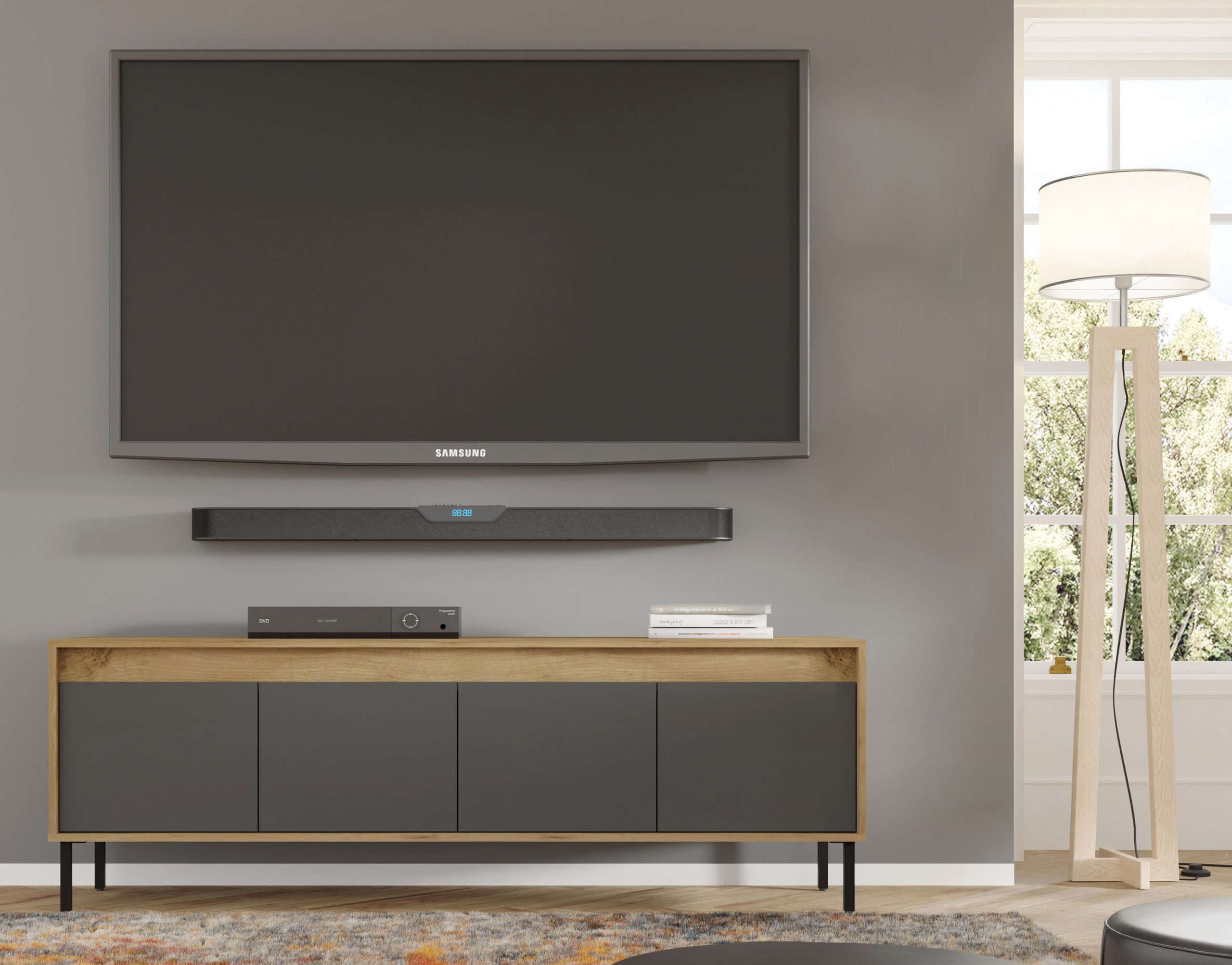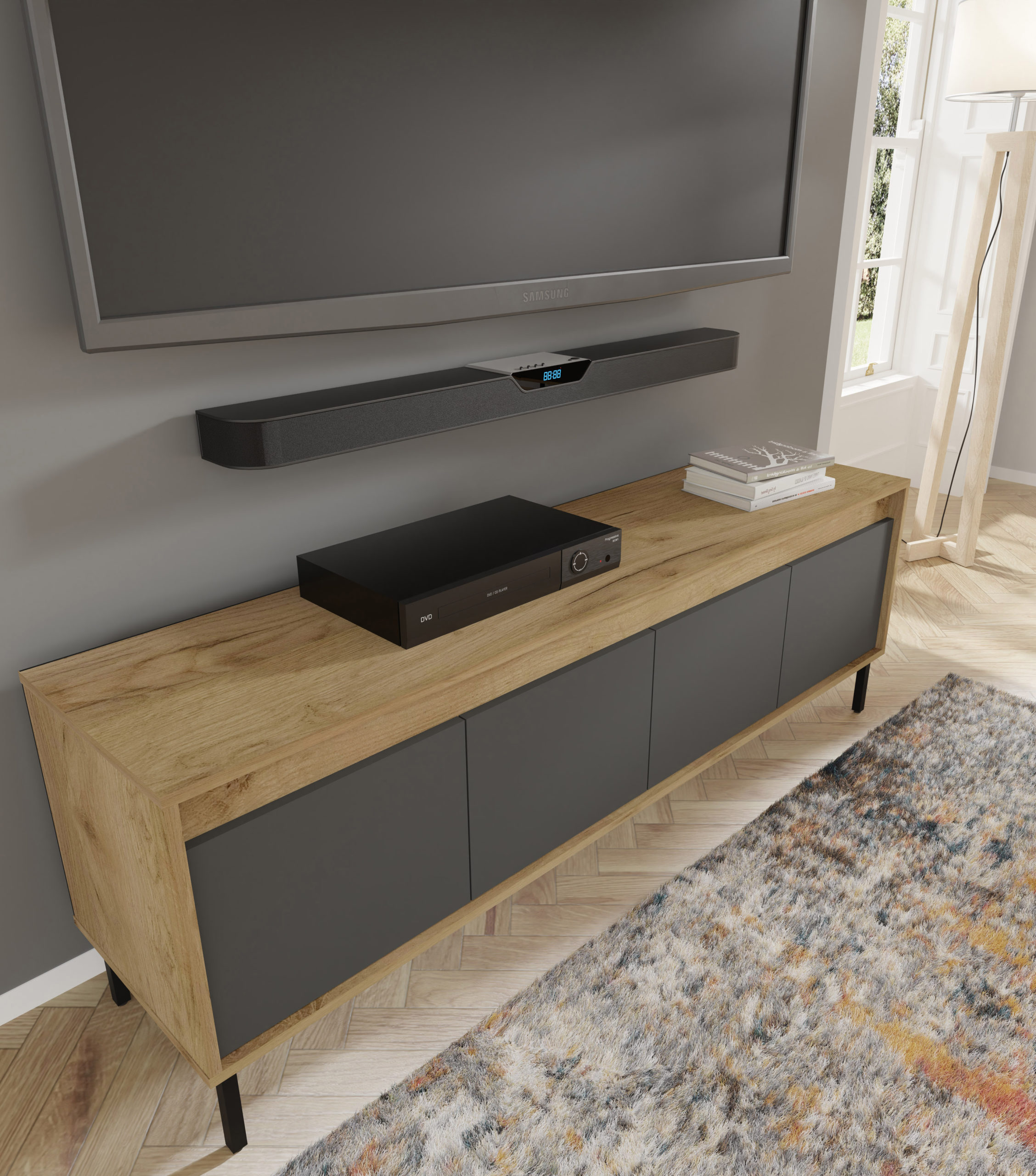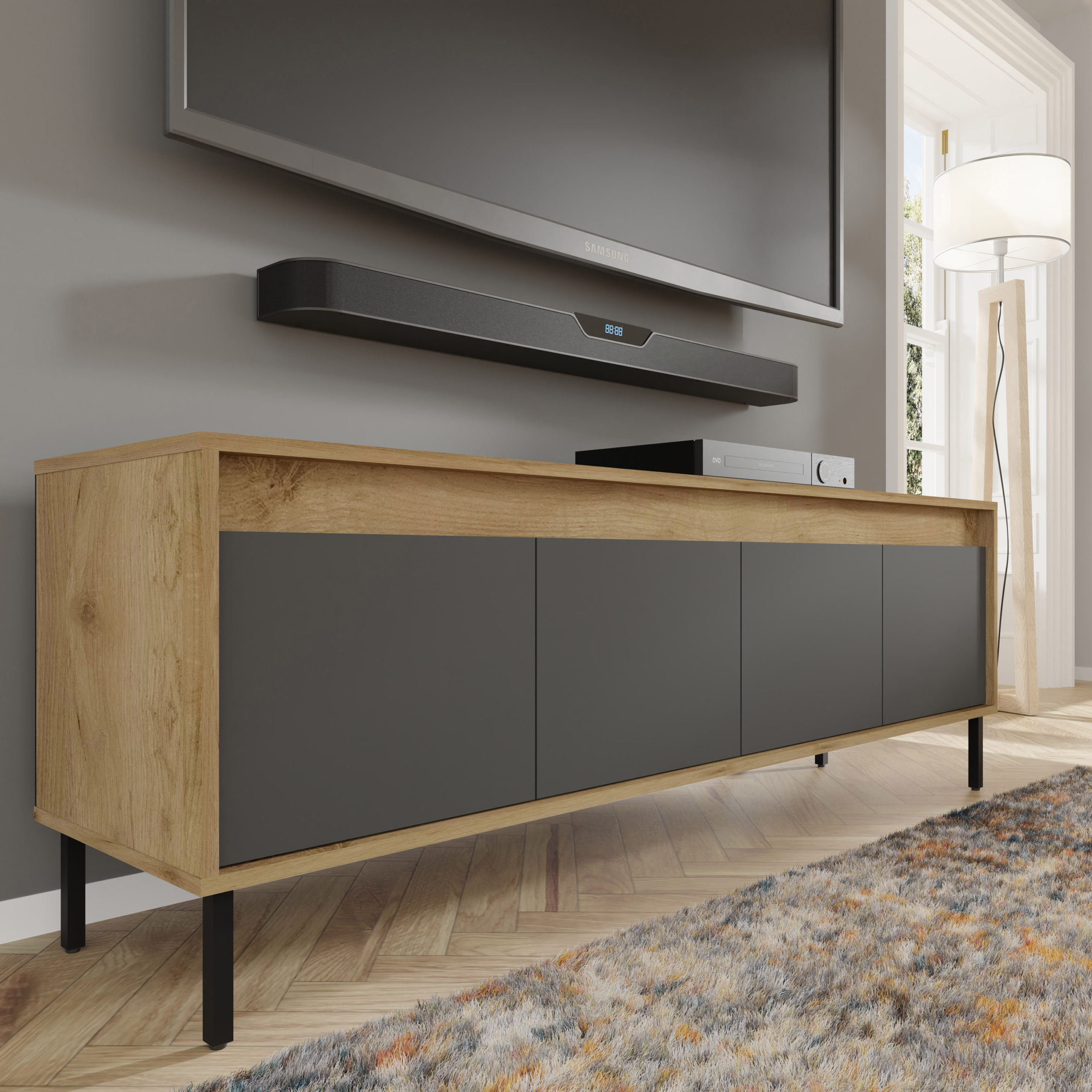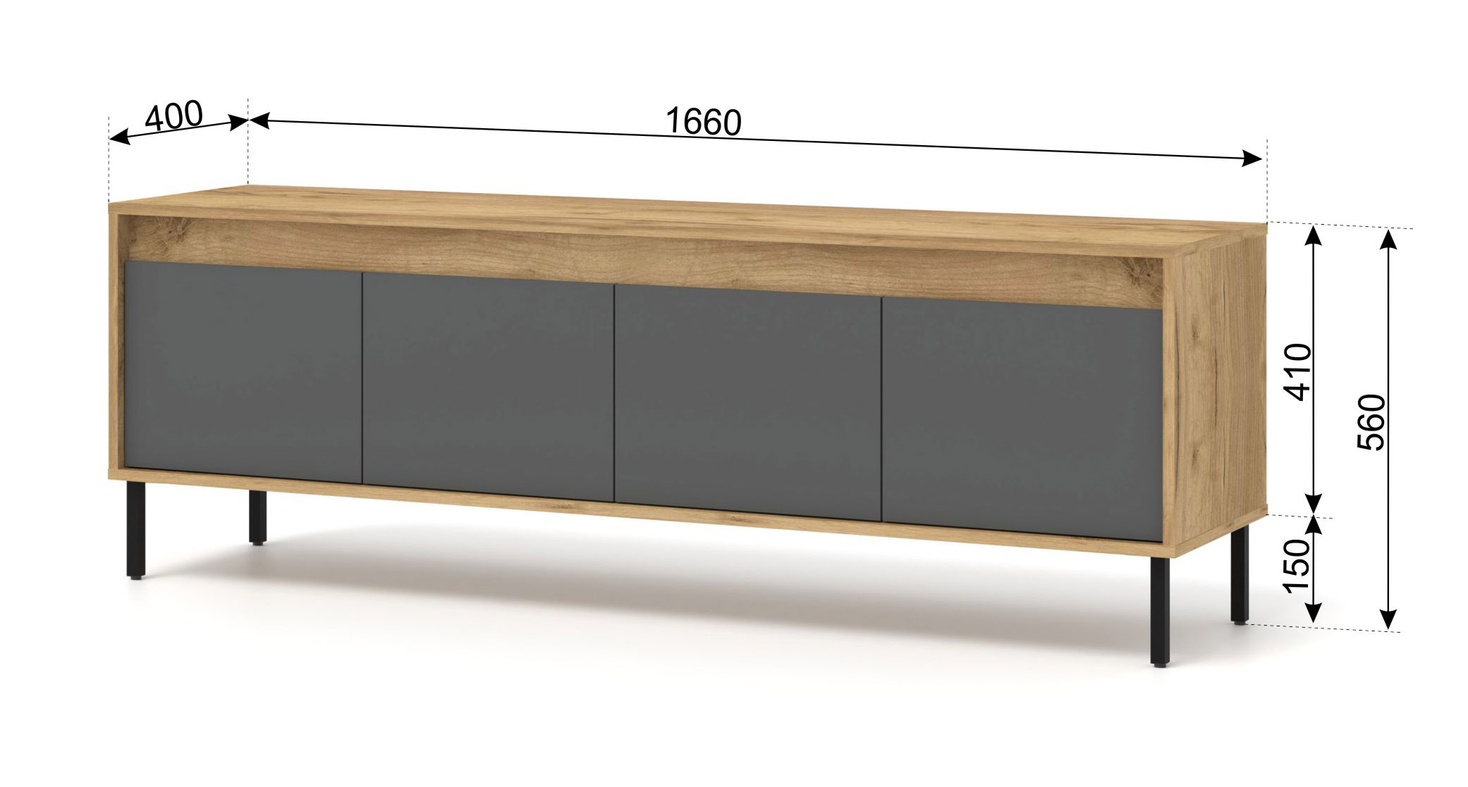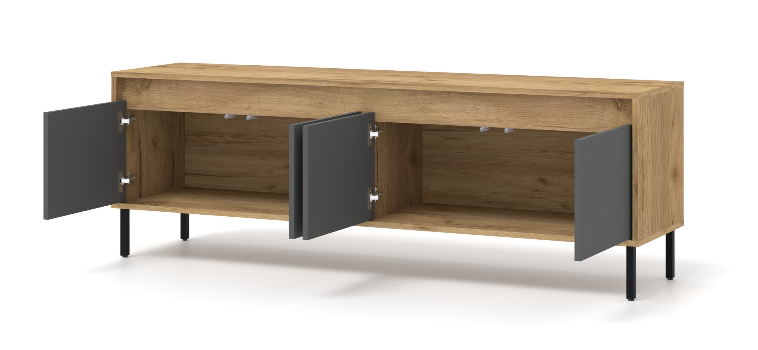 Funkcjonalność modelu Nesta została zaprojektowana z myślą o współczesnych użytkownikach. Czterodrzwiowe wnętrze skrywa dwie szerokie półki, które z łatwością pomieszczą konsole, dekodery, kolekcję płyt czy zapasowe okablowanie. Zastosowanie technologii push to open sprawia, że dostęp do zawartości jest szybki i wygodny – wystarczy lekki nacisk na front. Szeroki blat o długości blisko dwóch metrów to bezpieczna i stabilna podstawa pod telewizor o dużej przekątnej, a jego głębokość (40 cm) sprawia, że mebel nie przytłacza nawet węższych salonów.