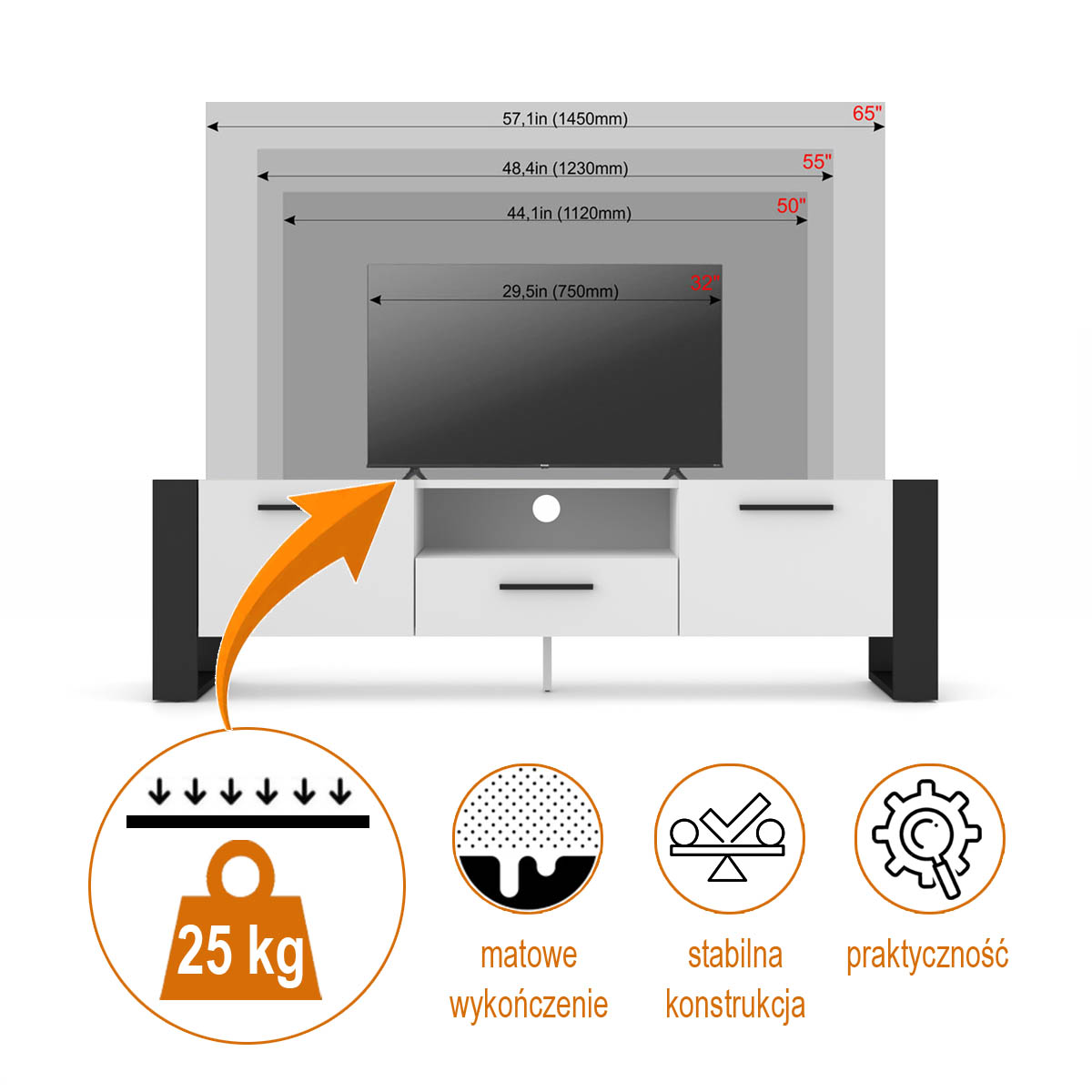 Szafka RTV Nuka została stworzona, by stać się centralnym punktem Twojej przestrzeni. Jej design to odważna opowieść o kontrastach – czysta biel korpusu rozjaśnia wnętrze, podczas gdy charakterystyczne, czarne nogi w kształcie ramy nadają całości industrialnego pazura. To mebel dla tych, którzy chcą, aby ich dom odzwierciedlał odwagę i niebanalny gust, zrywając z nudą i powtarzalnością standardowych aranżacji.