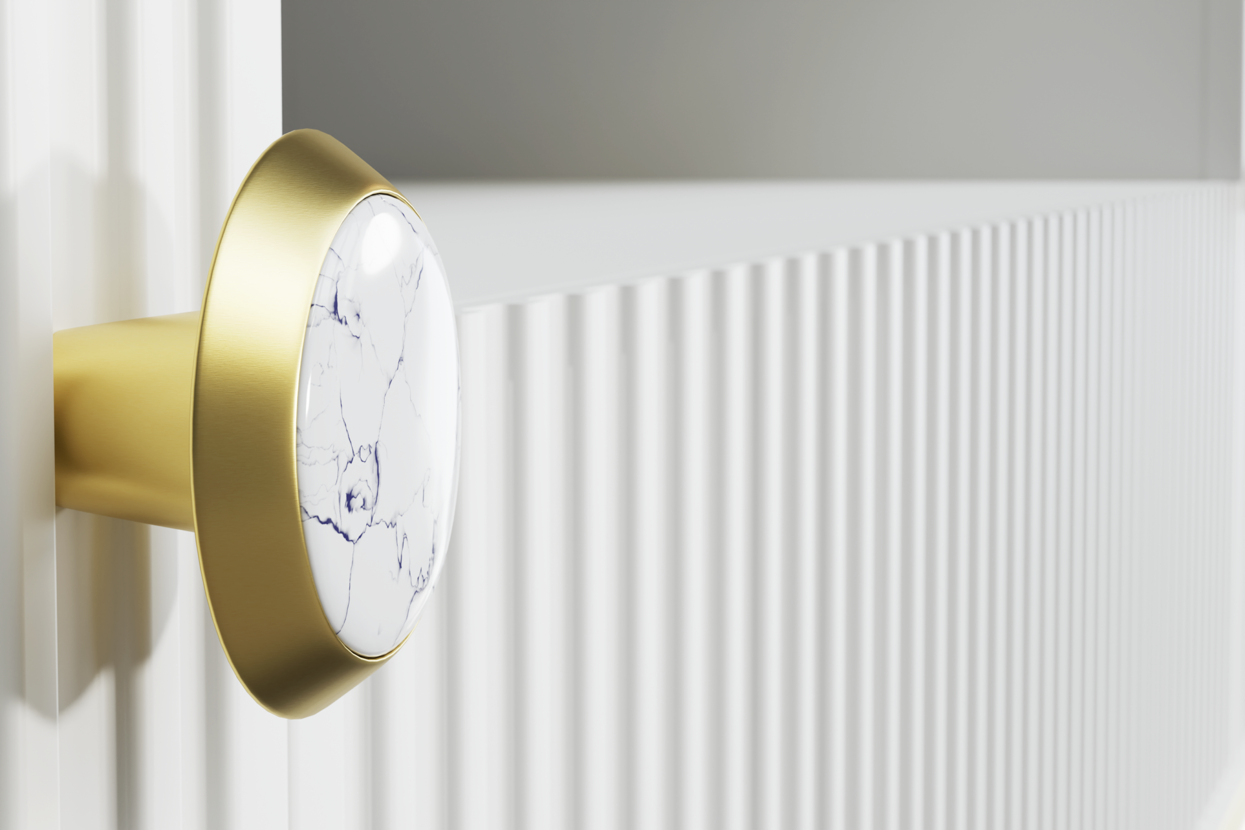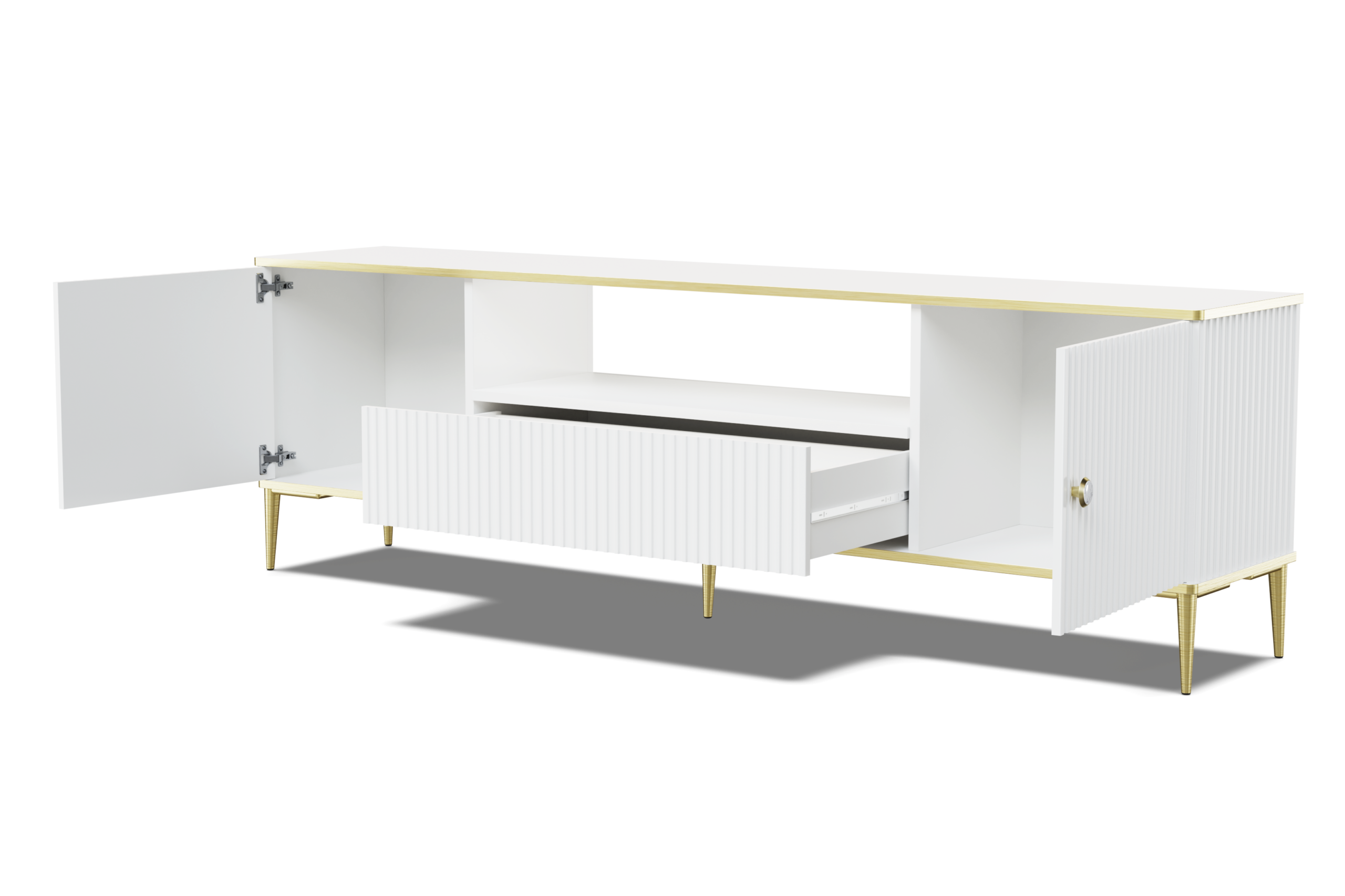 Szafka RTV PETRA 180 cm 2D1S frezowana biały mat na złotych nóżkach