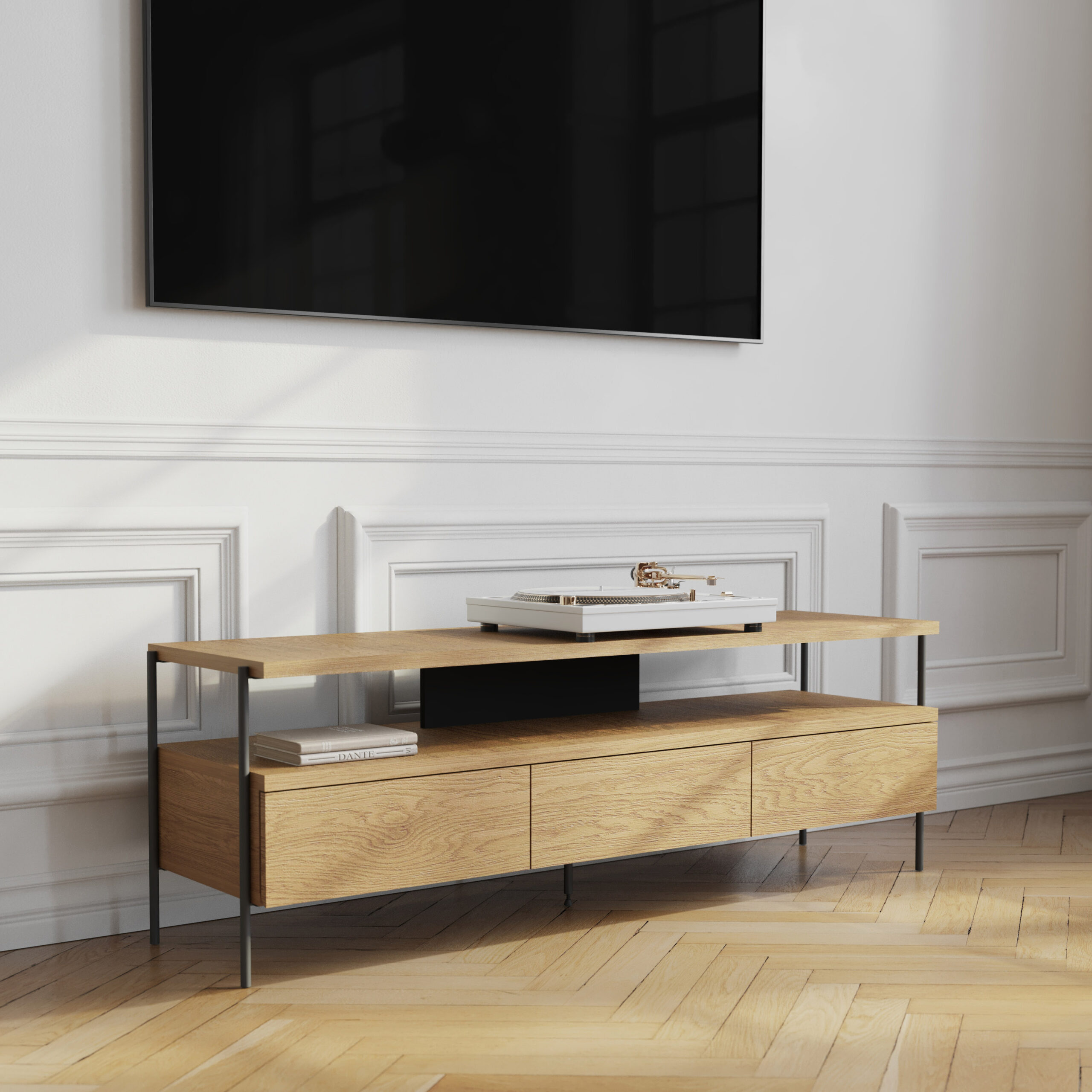 Głęboki ton orzecha nadaje konstrukcji powagi i dostojności, jednak osadzenie brył na filigranowych, czarnych profilach z metalu sprawia, że meble zdają się unosić w powietrzu. Ten kontrast wizualny wprowadza do salonu pożądany balans – mebel staje się silnym akcentem stylistycznym, który nie dominuje wnętrza, lecz dodaje mu elegancji i przestrzennego oddechu.