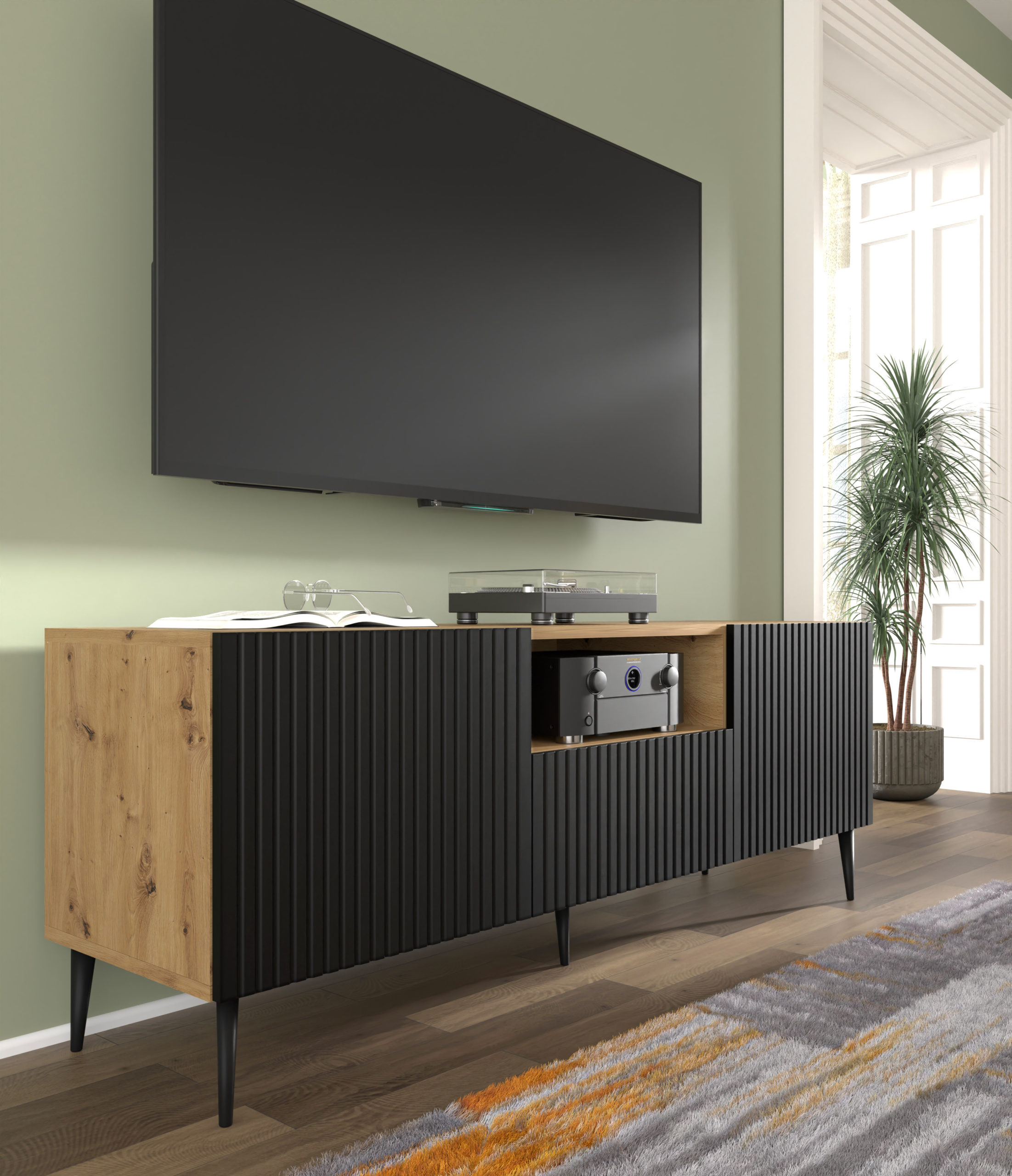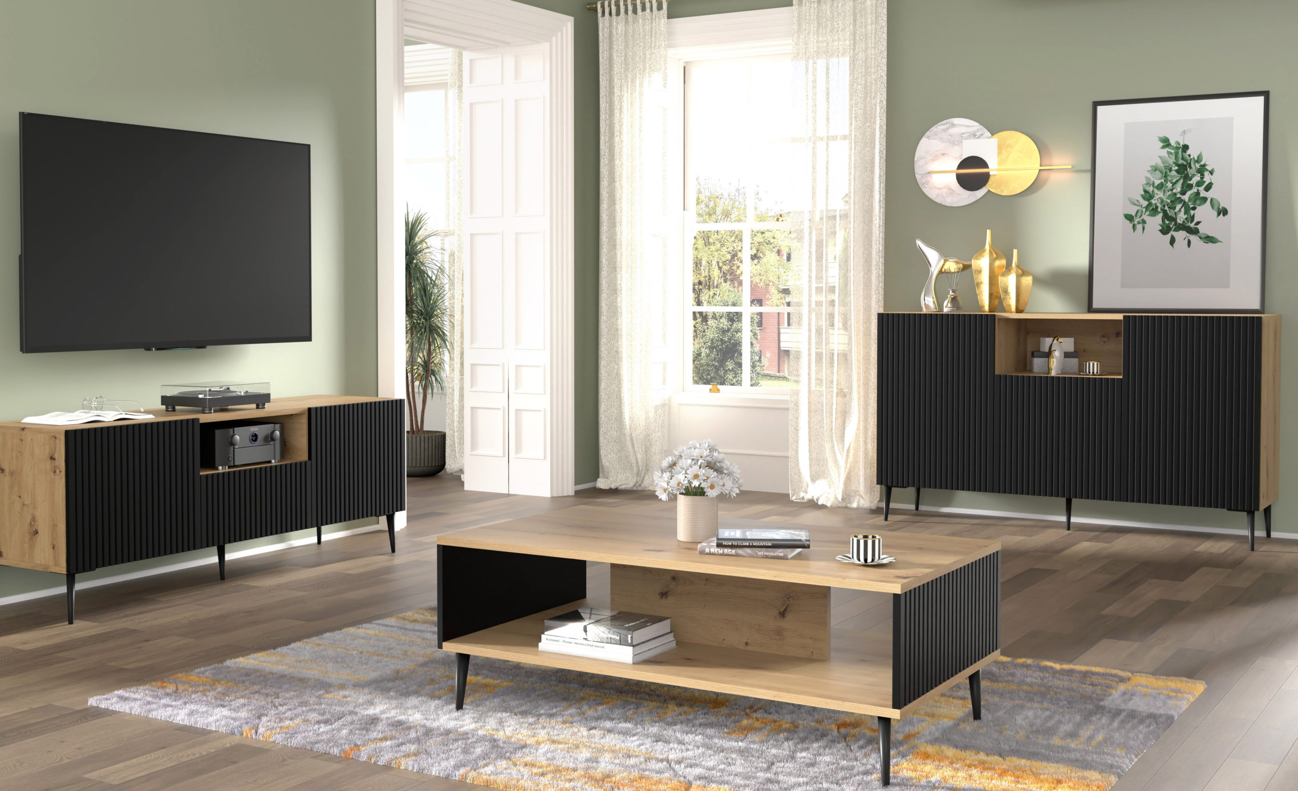 Szafka RTV Ravenna to biżuteryjny akcent w sercu Twojego salonu, który łączy surową elegancję czarnych, frezowanych frontów z ciepłem dębu artisan. Ten unikatowy mebel o szerokości 150 cm został zaprojektowany z myślą o najbardziej wymagających kącikach multimedialnych – oferuje dwie szafki, pojemną szufladę oraz otwartą wnękę z estetycznym przepustem na kable. Całość spoczywa na smukłych, metalowych szpilkach w kolorze złotym lub czarnym, które nadają bryle niespotykanej lekkości i prestiżu. Dzięki systemowi push to open oraz rzeźbiarskiej strukturze frontów MDF, Ravenna to kwintesencja włoskiego stylu w Twoim domu.