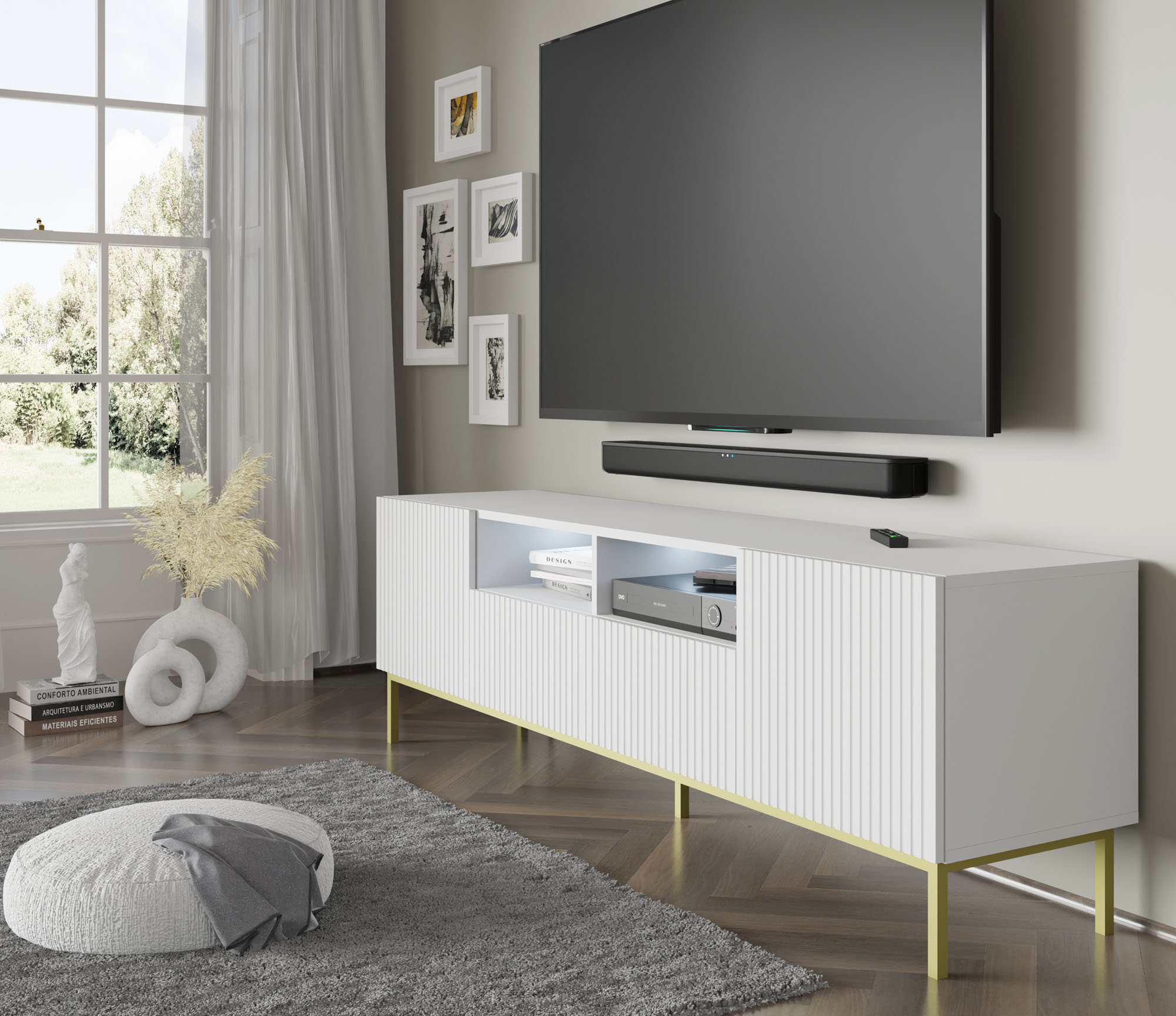 To, co nadaje szafce Ravenna wyjątkowego blasku, to wysoka na 17 cm złota metalowa rama. Stanowi ona nie tylko solidny punkt podparcia dla szerokiej bryły, ale przede wszystkim wprowadza element luksusu, kontrastując z bielą korpusu. Podstawa ta jest również niezwykle praktyczna – prześwit pod szafką umożliwia swobodną pracę robotom sprzątającym, co ułatwia zachowanie nienagannej czystości bez konieczności przesuwania ciężkiego sprzętu RTV. Blat o szerokości 200 cm to bezpieczna i stabilna podstawa pod największe odbiorniki TV, oferująca dodatkowo miejsce na designerskie głośniki czy dekoracje.