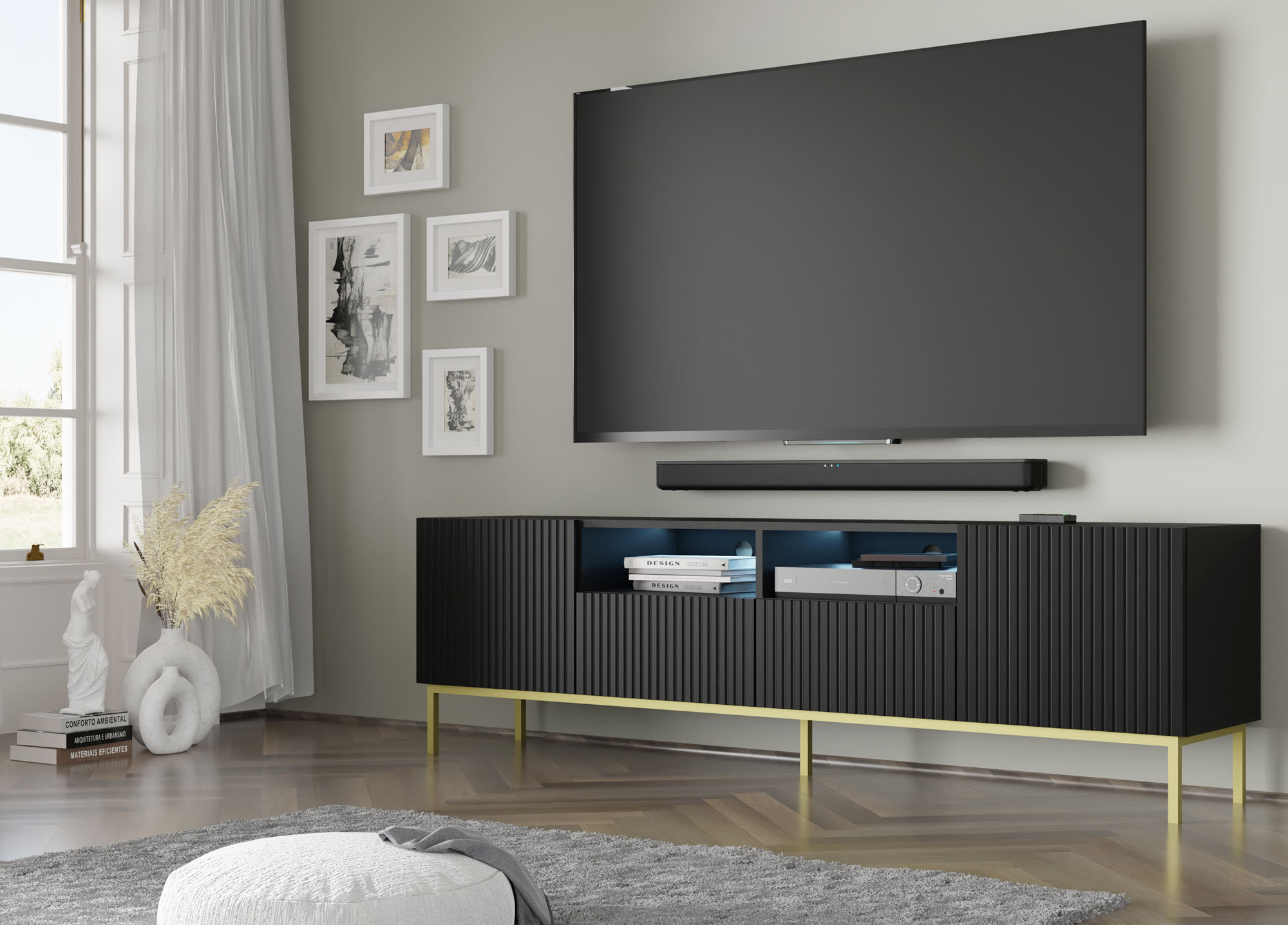 Szafka RTV Ravenna o imponującej szerokości 200 cm to kwintesencja nowoczesnego prestiżu, która zamieni Twoją strefę multimedialną w ekskluzywny salon kinowy. Unikalny charakter mebla definiują rzeźbiarskie, frezowane fronty MDF w kolorze głębokiego czarnego matu, które w połączeniu z biżuteryjną, złotą ramą tworzą kompozycję pełną klasy i wyrafinowania. Ta dwudrzwiowa bryła z dwiema szufladami i otwartymi wnękami oferuje potężną przestrzeń do przechowywania oraz perfekcyjną organizację sprzętu. Dzięki systemowi push to open i nienagannej formie, Ravenna to propozycja dla osób poszukujących mebli, które wyznaczają standardy luksusu we współczesnym designie.