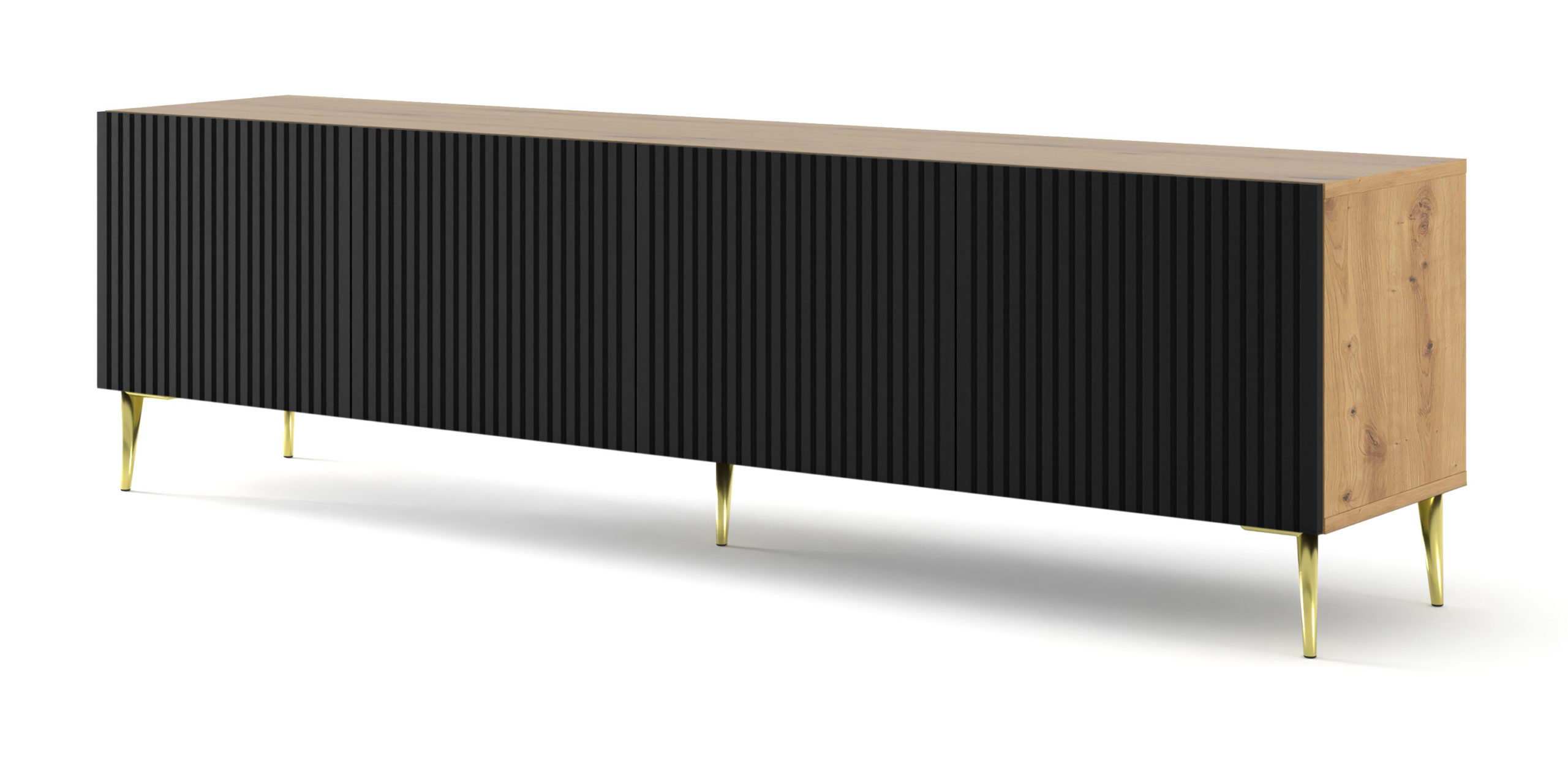 Szafka RTV RAVENNA B 200 cm 4D dąb artisan / czarny mat rama złota