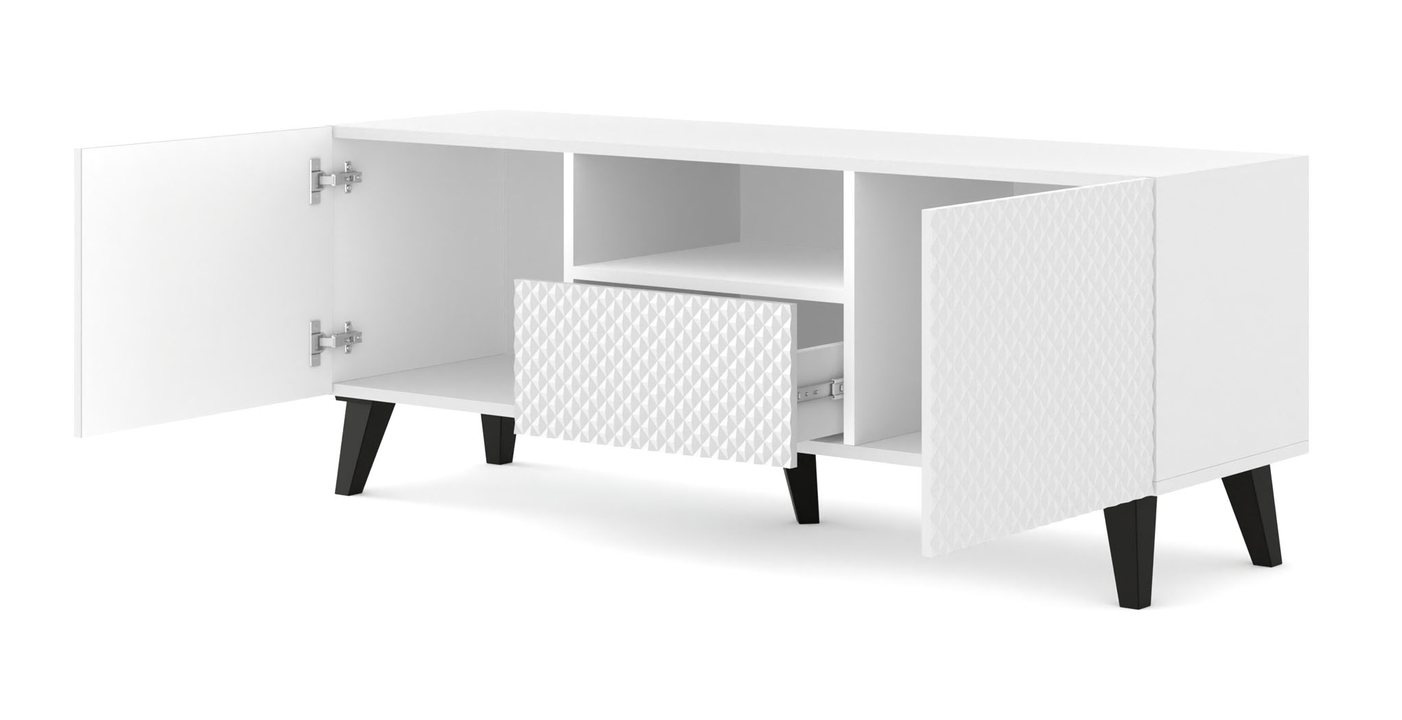 Szafka RTV Ravenna C to propozycja dla osób, które pragną wprowadzić do salonu powiew luksusu w czystej, białej formie. To, co wyróżnia ten model, to spektakularne fronty z płyty MDF, wykończone w wysokim połysku i ozdobione finezyjnym frezowaniem o wzorze diamentu. Biała bryła o szerokości 150 cm nie tylko optycznie powiększa przestrzeń, ale dzięki lśniącej powierzchni pięknie odbija światło, nadając wnętrzu prestiżowego charakteru. Wyposażona w dwie szafki, szufladę oraz otwartą wnękę, Ravenna C jest kompletnym centrum multimedialnym, które łączy włoską elegancję z nowoczesną funkcjonalnością systemu push to open.