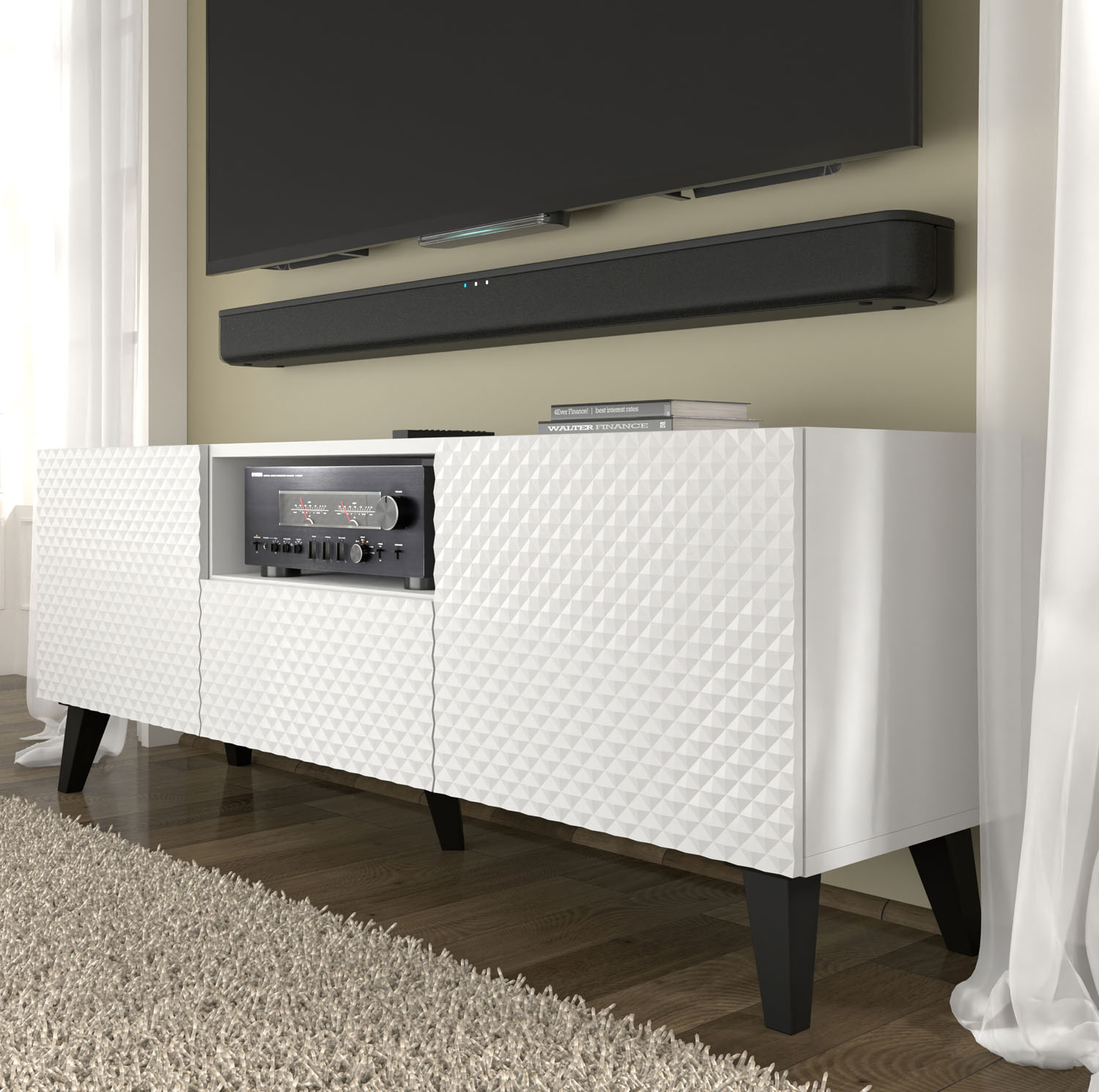 Pod biżuteryjną fasadą kryje się przemyślany układ, który zaspokoi potrzeby każdego użytkownika technologii. Szafka o szerokości 149,7 cm oferuje zróżnicowane strefy przechowywania: dwie boczne szafki idealnie nadają się na kolekcję płyt czy akcesoria, a pojemna szuflada pomieści przedmioty, które chcesz mieć zawsze pod ręką. Otwarta półka została stworzona specjalnie z myślą o konsolach i dekoderach, zapewniając im odpowiednią wentylację, a dedykowany otwór w plecach mebla pozwoli raz na zawsze uporządkować plątaninę kabli. Dzięki systemowi bezuchwytowemu „push to open”, fronty pozostają idealnie gładkie, co pozwala w pełni wybrzmieć diamentowemu dekorowi.