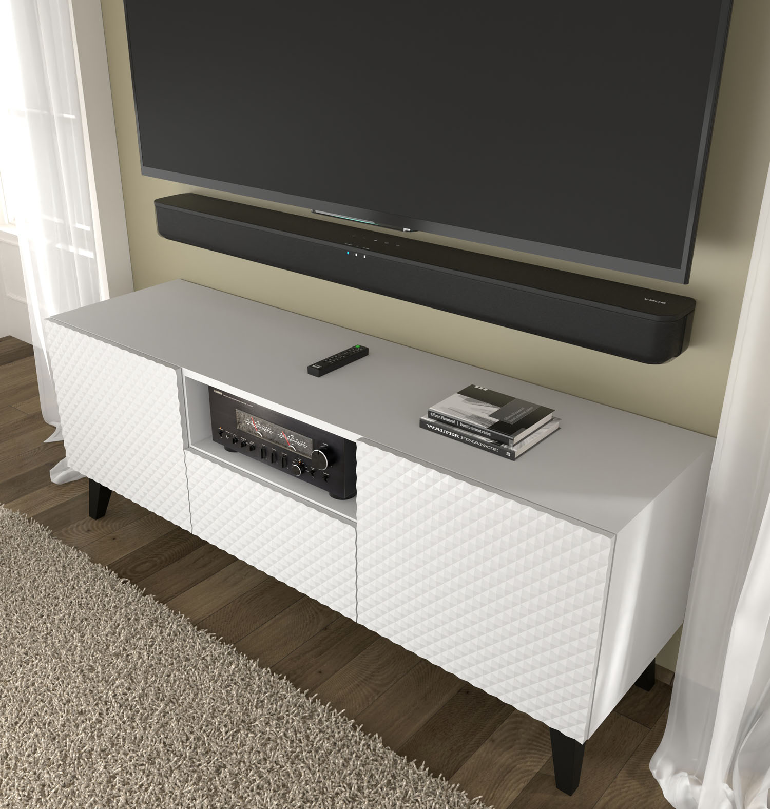 Zdecydowanym akcentem stylistycznym są solidne, czarne nóżki o wysokości 15 cm. Ich kontrastowa kolorystyka dodaje białej bryle wyrazistości i nowoczesnego, loftowego pazura. Wysoka podstawa pełni także niezwykle praktyczną funkcję – wolna przestrzeń pod szafką pozwala na swobodną pracę robotom sprzątającym, co przy białych meblach w wysokim połysku jest kluczowym atutem w zachowaniu sterylnej czystości. Szeroki blat szafki gwarantuje stabilną i bezpieczną podstawę nawet dla dużych odbiorników TV o przekątnej do 70 cali.