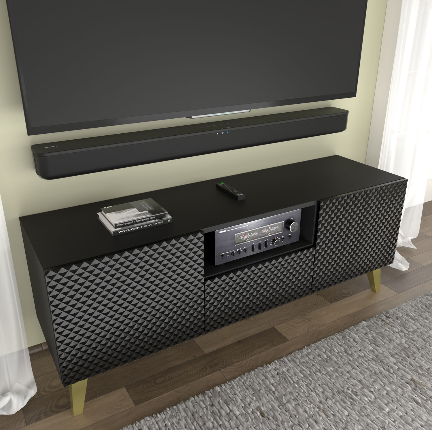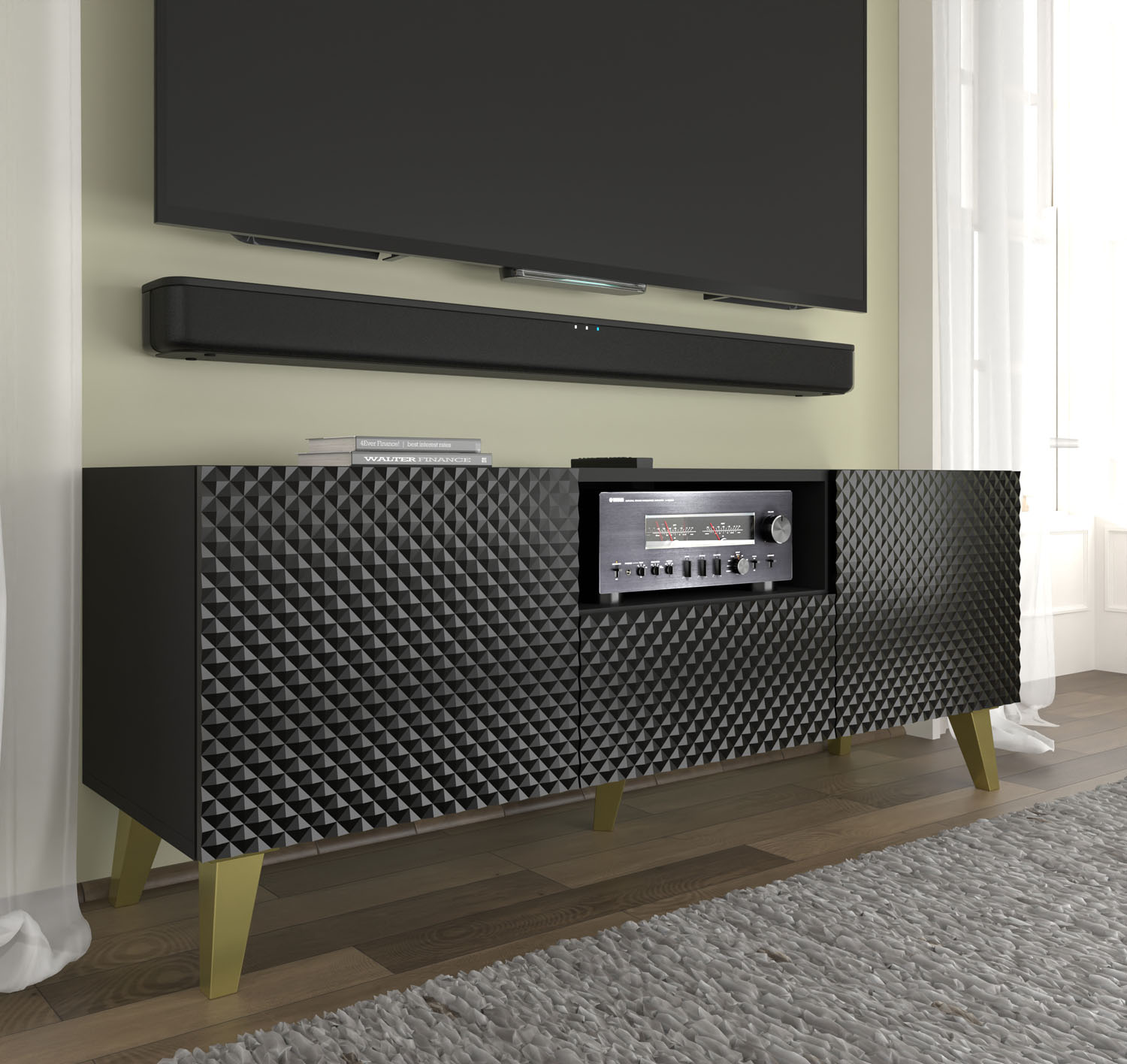 Szafka RTV Ravenna to kwintesencja nocnej elegancji i nowoczesnego luksusu. Jej unikalność opiera się na fascynującym połączeniu głębokiej, matowej czerni korpusu z frontami wykończonymi w wysokim połysku, które zdobi trójwymiarowy frez o wzorze diamentu. Ta szeroka na 150 cm bryła osadzona na biżuteryjnych, złotych nóżkach, stanowi nie tylko stabilną bazę pod telewizor do 70 cali, ale przede wszystkim rzeźbiarski element dekoracyjny. Dzięki systemowi push to open oraz przemyślanemu układowi z szufladą i otwartą półką na sprzęt, Ravenna tworzy prestiżowe centrum domowej rozrywki, które zachwyca luksusowym szlifem.