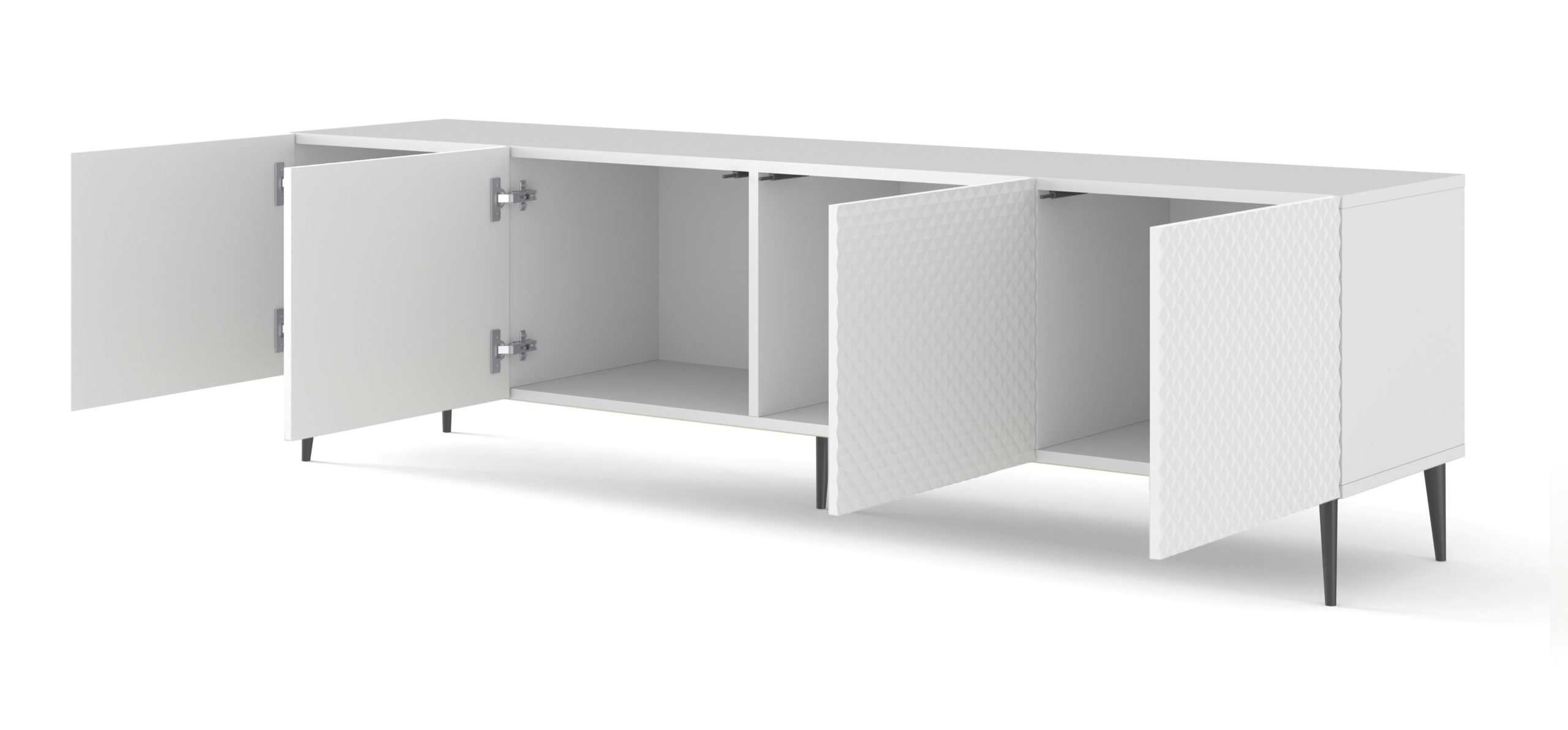 Szafka RTV Ravenna to monumentalna elegancja zamknięta w lekkiej, nowoczesnej formie. Szeroki na 200 cm blat w kolorze matowej bieli stanowi doskonałą bazę pod kino domowe, a fronty z głębokim frezowaniem typu diament w wysokim połysku dodają salonowi niespotykanego blasku. Cztery pojemne szafki z systemem push to open gwarantują mnóstwo miejsca na elektronikę, ukrywając ją za minimalistyczną fasadą. Osadzona na smukłych, metalowych nóżkach typu szpilka, szafka nie tylko zapewnia pełną stabilność, ale też ułatwia utrzymanie czystości, wprowadzając do wnętrza powiew luksusu i harmonii.