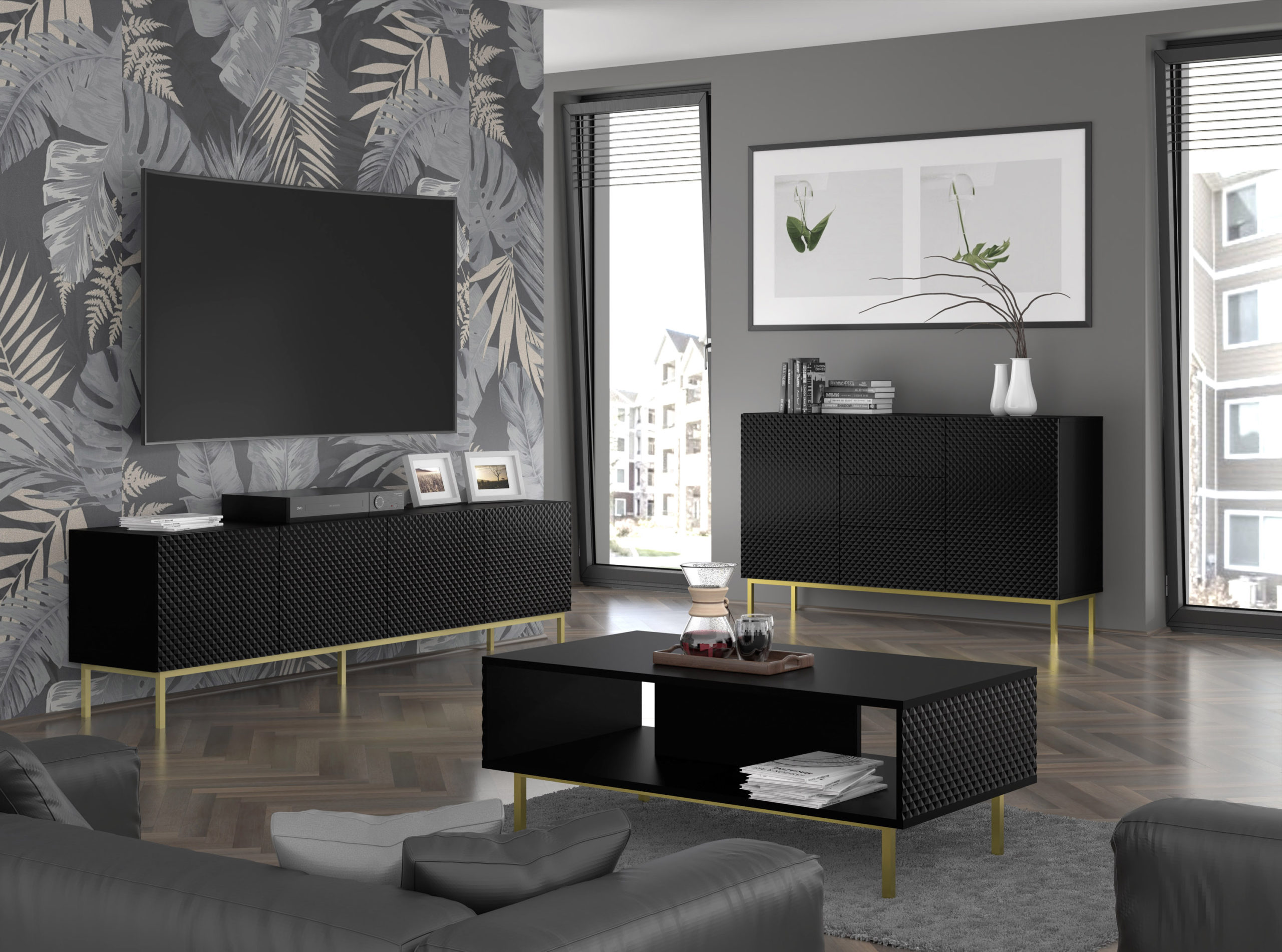 Czarna szafka RTV z kolekcji Ravenna to mebel stworzony dla osób, które nie uznają kompromisów w kwestii designu. Połączenie matowego korpusu z połyskującymi frontami tworzy wielowymiarowy efekt, który nadaje pomieszczeniu głębi i nowoczesnej elegancji. Najbardziej intrygującym elementem projektu jest diamentowy wzór frezowania, który sprawia, że światło tańczy na powierzchni mebla, podkreślając jego ekskluzywny charakter. To idealna propozycja do wnętrz urządzonych z rozmachem, gdzie włoskie inspiracje spotykają się z odważnym, współczesnym minimalizmem.