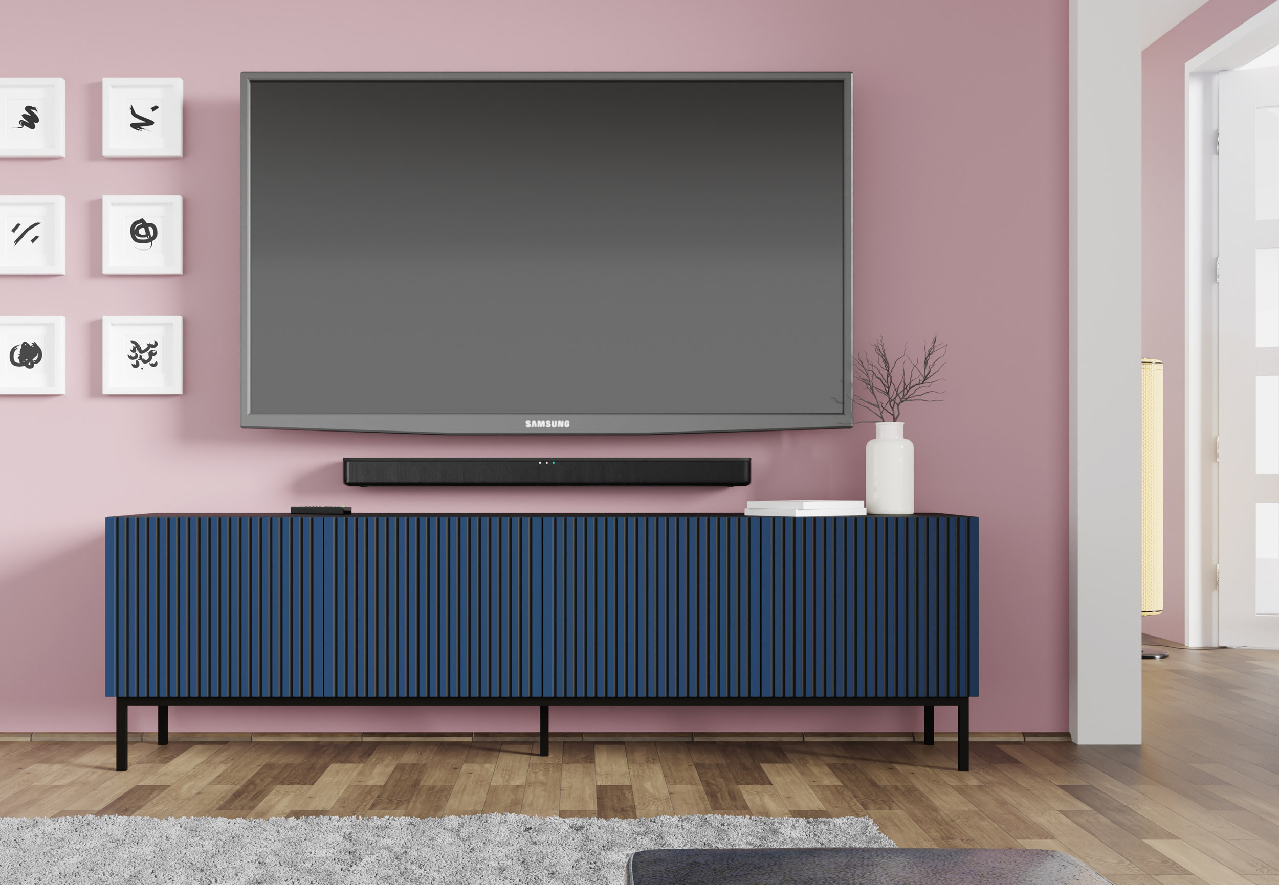 Projekt szafki Ravenna to mistrzowskie balansowanie między estetyką a funkcjonalnością. Cztery przestronne schowki, ukryte za bezuchwytowymi frontami, oferują ogromną przestrzeń na domowe centrum rozrywki. Dzięki zastosowaniu systemu push to open, fronty pozostają idealnie gładkie, co pozwala w pełni wybrzmieć rytmicznym żłobieniom na płycie MDF. Szeroki blat szafki to nie tylko bezpieczne miejsce na telewizor o dużej przekątnej, ale także przestrzeń na designerskie akcesoria, soundbar czy konsolę, które na tle granatu zyskują wyjątkową oprawę.