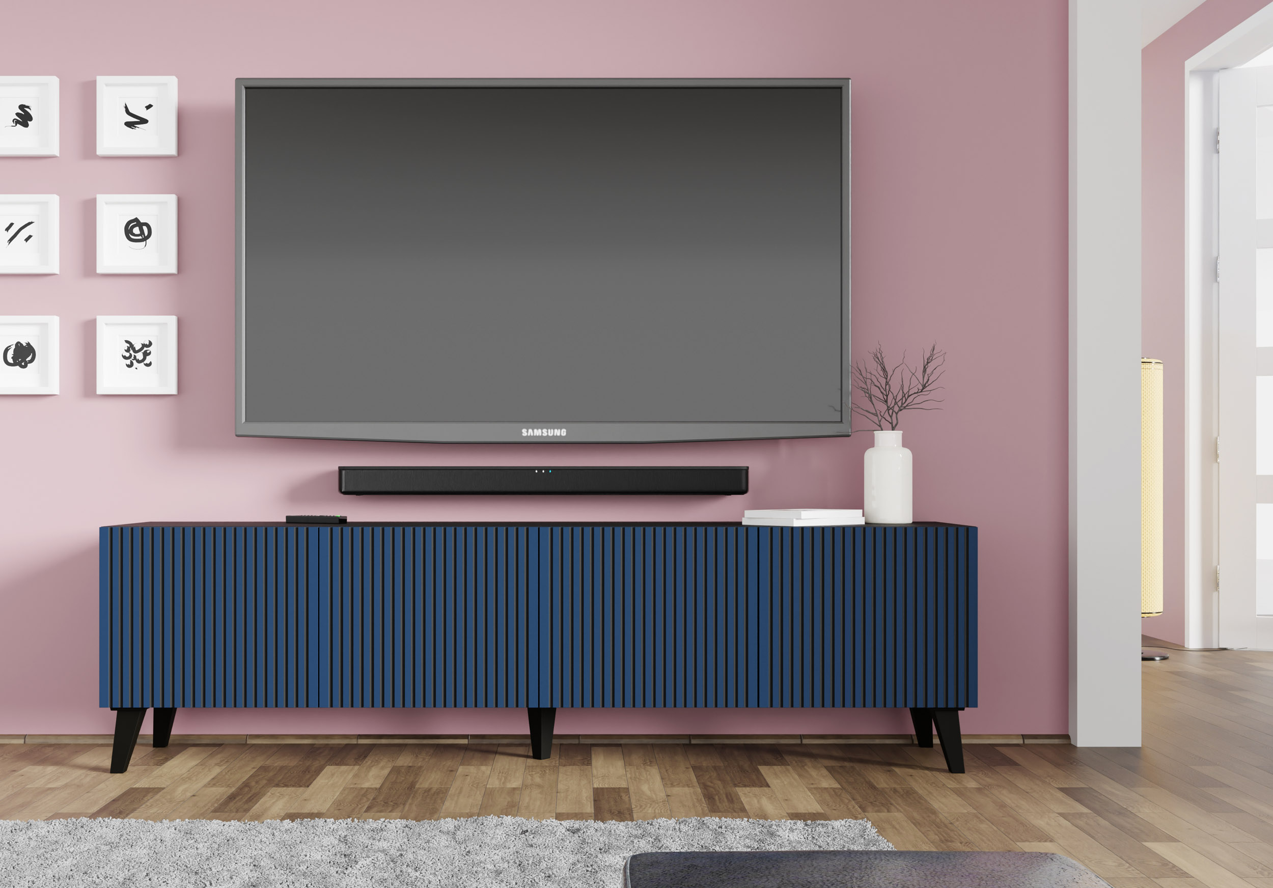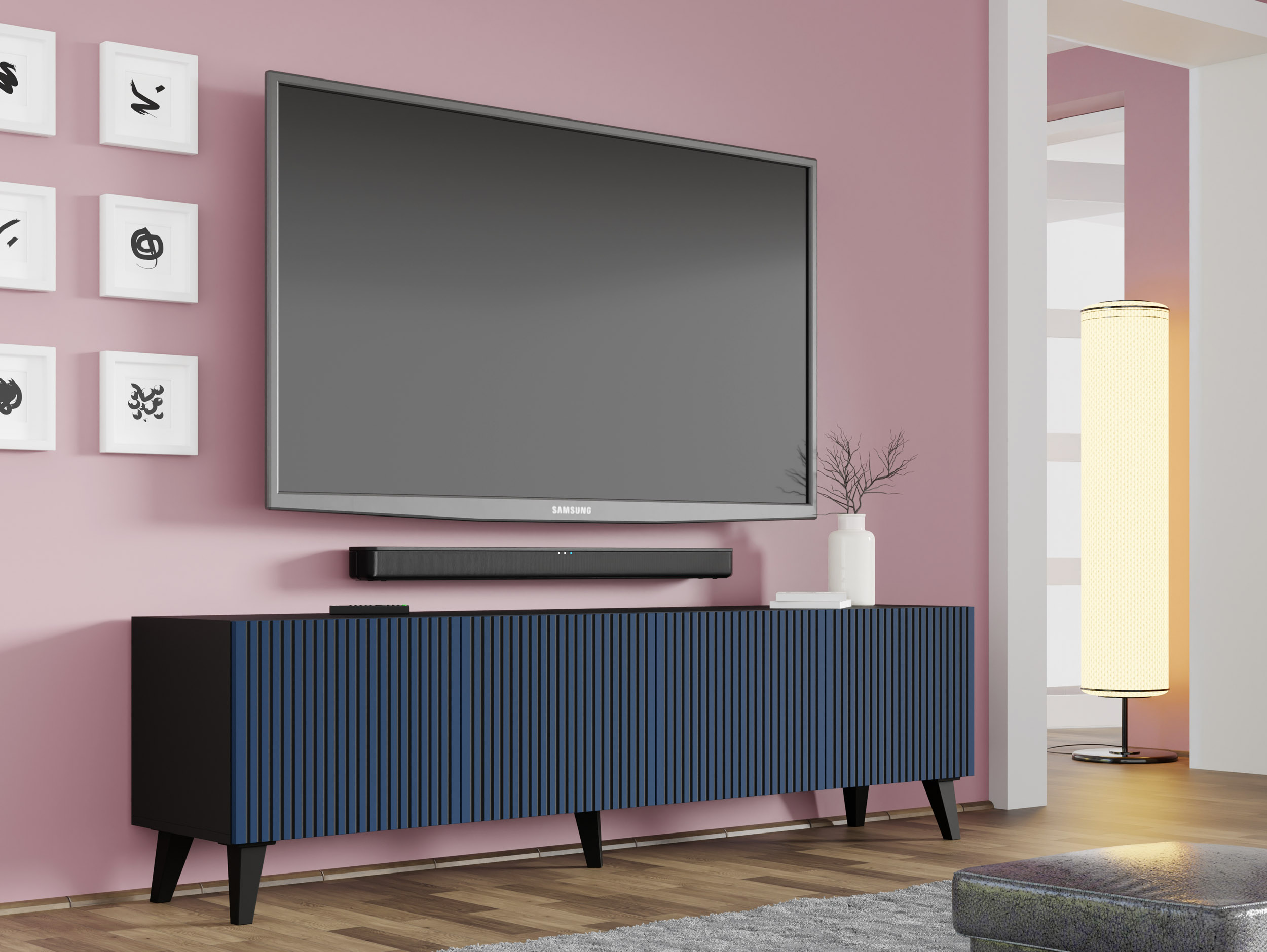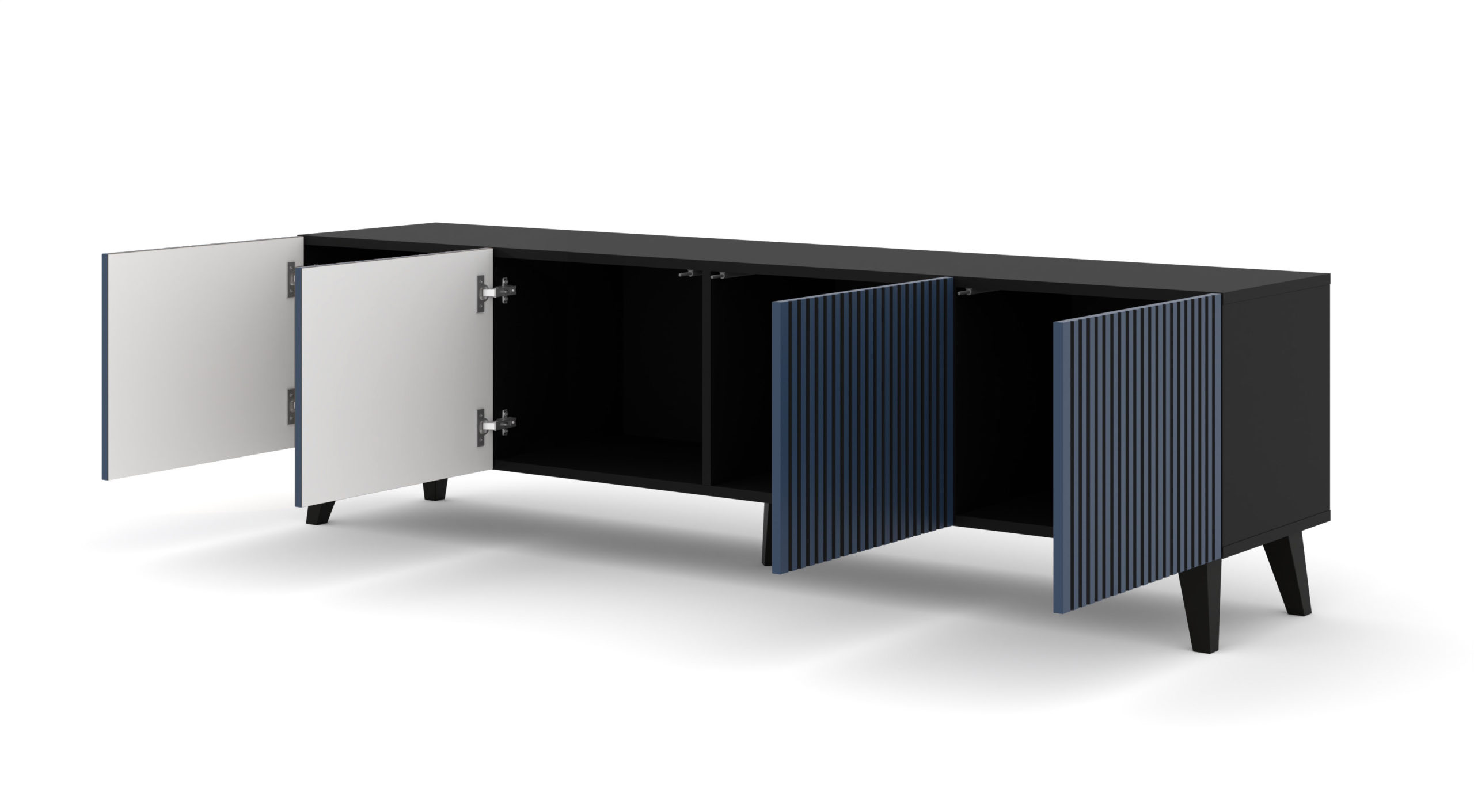 Szafka RTV RAVENNA F 200 cm 4D czarny mat / granatowy szpilki czarne plastikowe