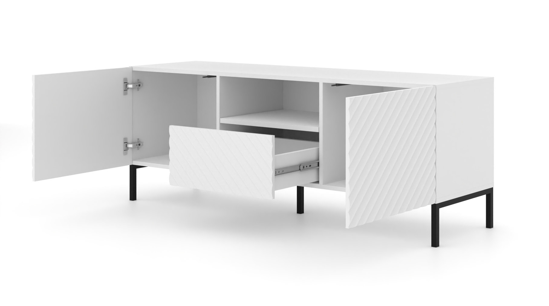 Szafka RTV z kolekcji SURF to luksusowa oprawa dla Twojego domowego centrum rozrywki. Jej biała, matowa bryła zachwyca unikalnymi, falistymi frezowaniami na frontach, które wnoszą do wnętrza dynamikę i nowoczesny szyk. Mebel oferuje inteligentny układ przechowywania: otwartą wnękę na sprzęt z dyskretnym otworem na kable, pojemną szufladę oraz dwie szafki. Brak tradycyjnych uchwytów i smukłe metalowe nóżki podkreślają minimalistyczny charakter projektu, tworząc przestrzeń wolną od wizualnego chaosu. Postaw na włoski design, który odmieni Twój odpoczynek przed ekranem.