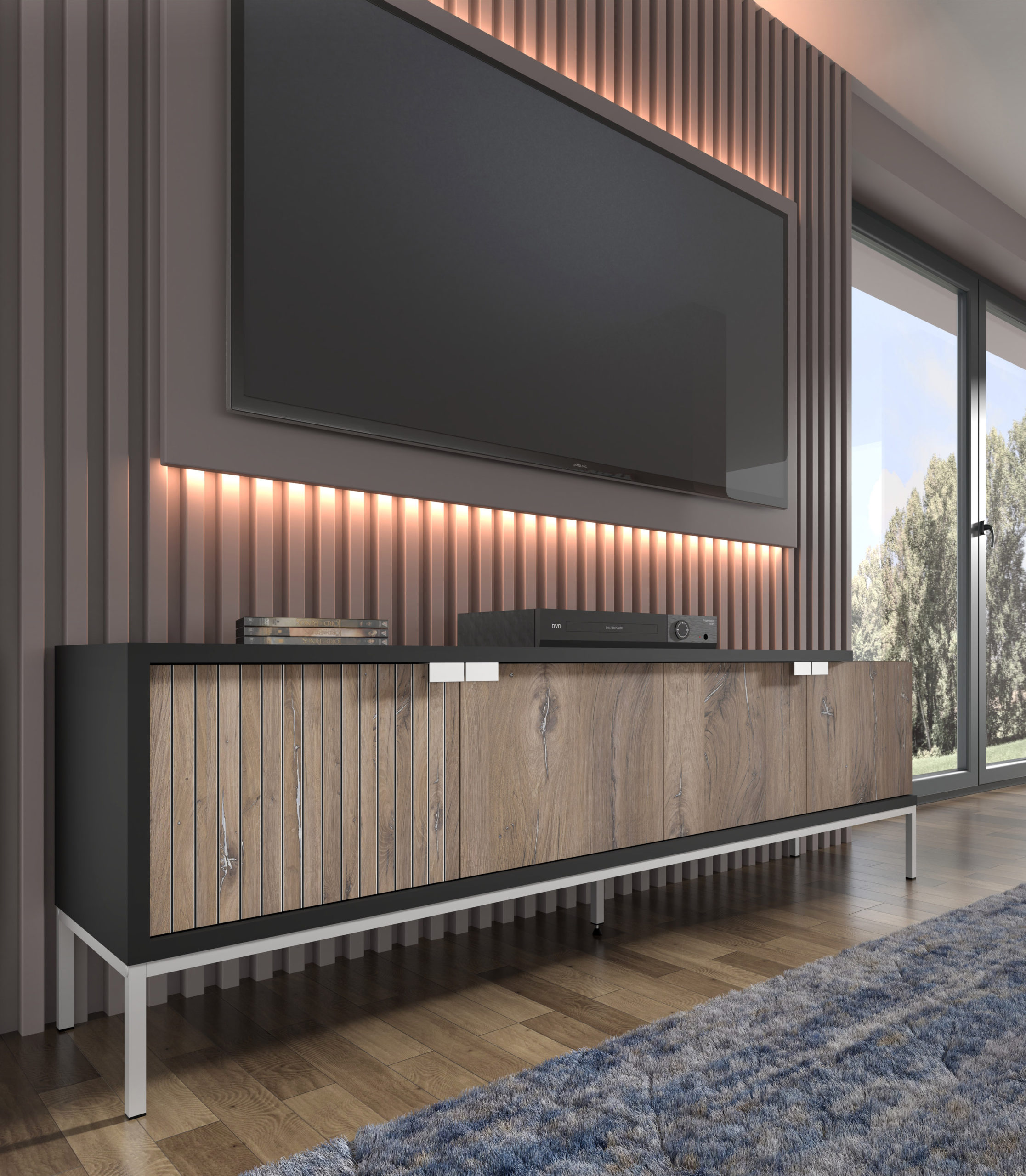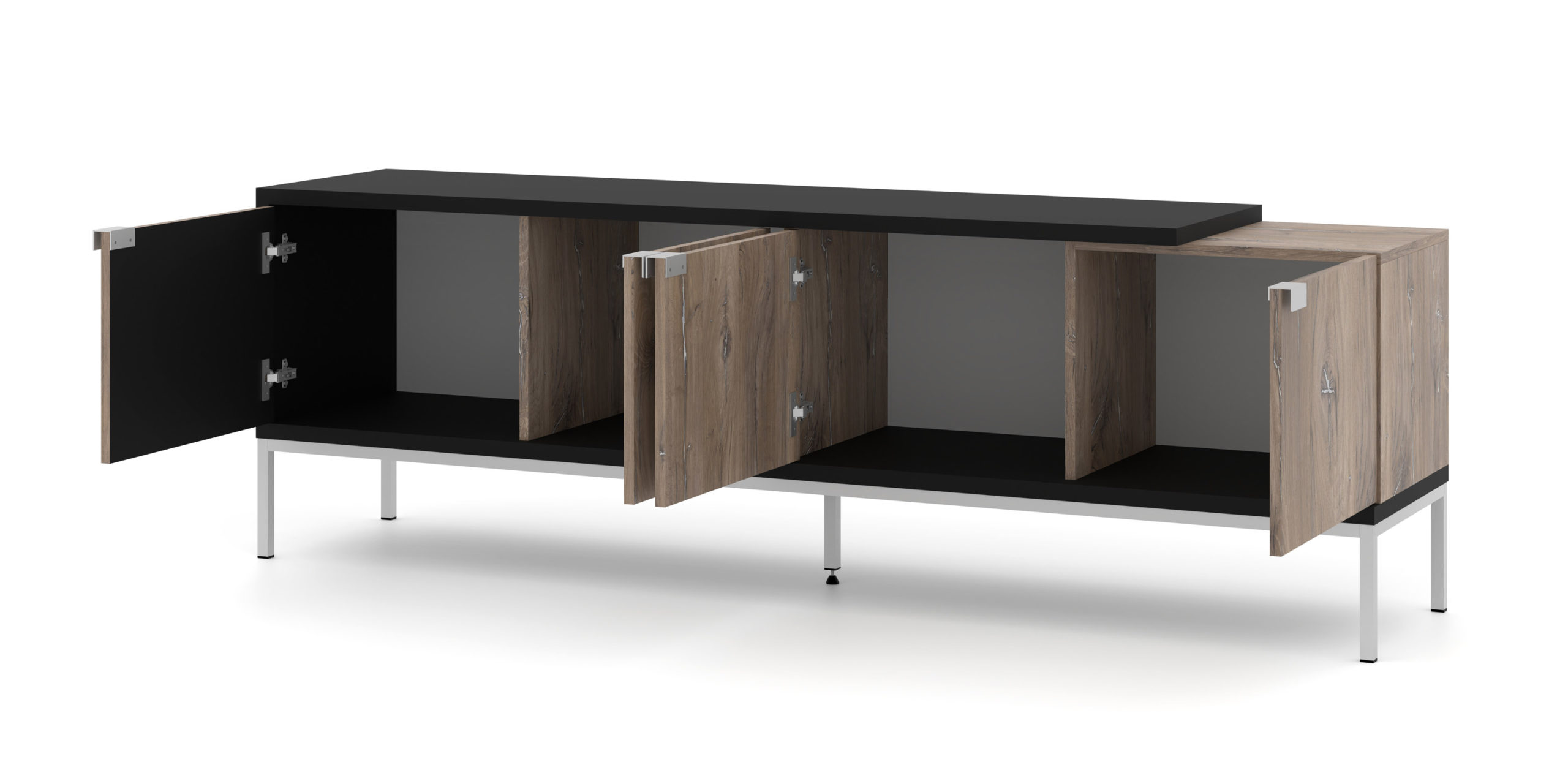 Funkcjonalność modelu Toledo o szerokości 190,7 cm została zaprojektowana z myślą o współczesnych salonach, gdzie liczba sprzętów i akcesoriów stale rośnie. Czterodrzwiowy system skrywa przestronne wnętrze, które z łatwością pomieści konsole, dekodery, nagłośnienie oraz bogatą kolekcję gier czy filmów. Wysoka na 20 cm metalowa rama nie tylko stabilizuje konstrukcję, ale również ułatwia sprzątanie – pod szafką bez trudu zmieści się większość robotów sprzątających. Szeroki, solidny blat to bezpieczna podstawa pod największe odbiorniki TV, a jego głębokość (42 cm) pozwala na swobodne ustawienie dodatkowych elementów audio.