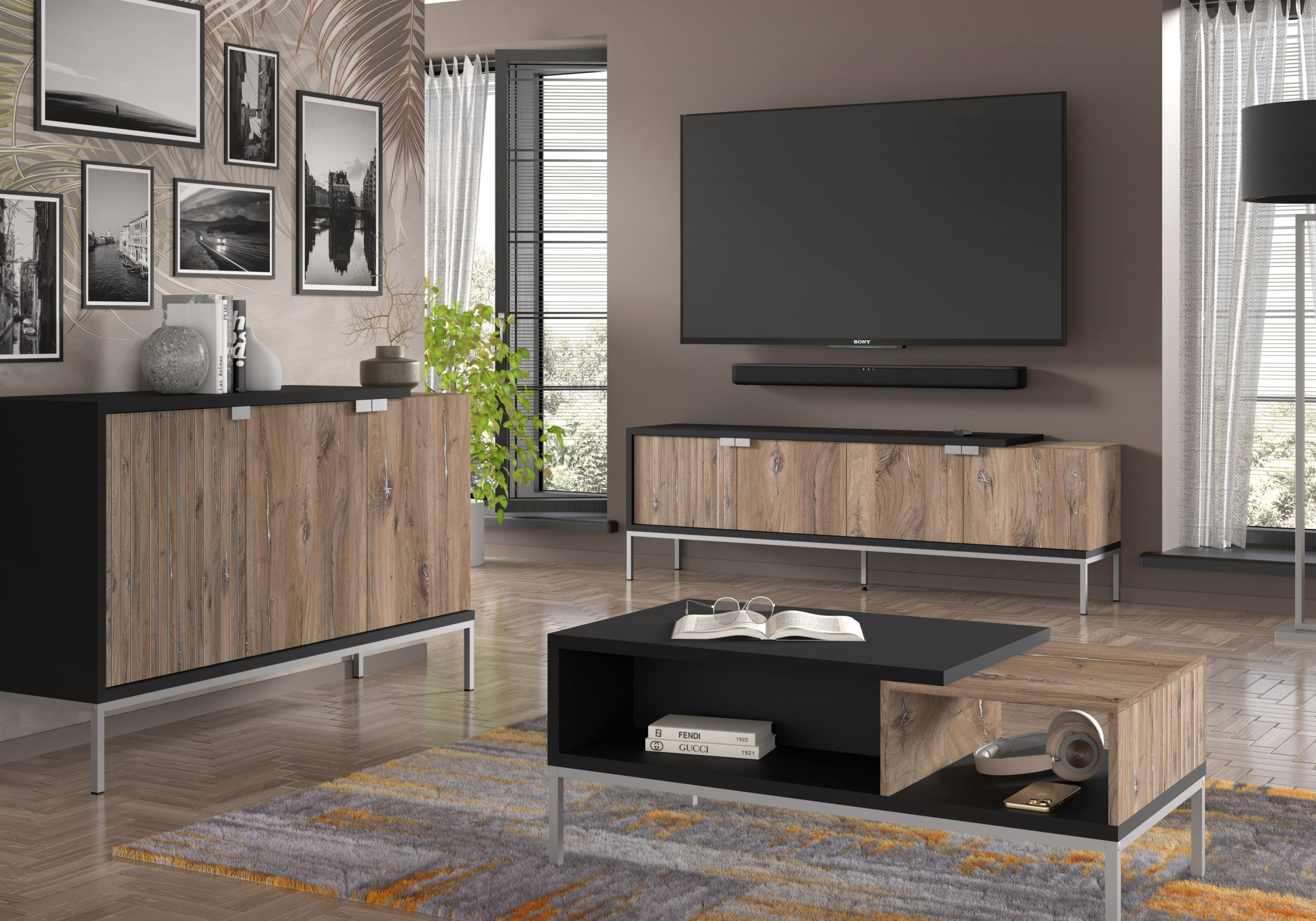 Dla miłośników designu, który opowiada historię, szafka pod telewizor Toledo jest propozycją jedyną w swoim rodzaju. Jej estetyka opiera się na fascynującym dialogu tradycji z nowoczesnością. Główną rolę gra tu dąb Flagstaff – dekor imitujący stare, odzyskane drewno, pełne naturalnych spękań i słojów. Ta rustykalna surowość została ujęta w ramy nowoczesnej, czarnej obudowy, co sprawia, że mebel prezentuje się niezwykle prestiżowo i odważnie. Srebrne, metalowe akcenty w postaci nóżek i uchwytów dodają bryle biżuteryjnego wykończenia, idealnie wpisując się w trendy industrialne oraz modern rustic.