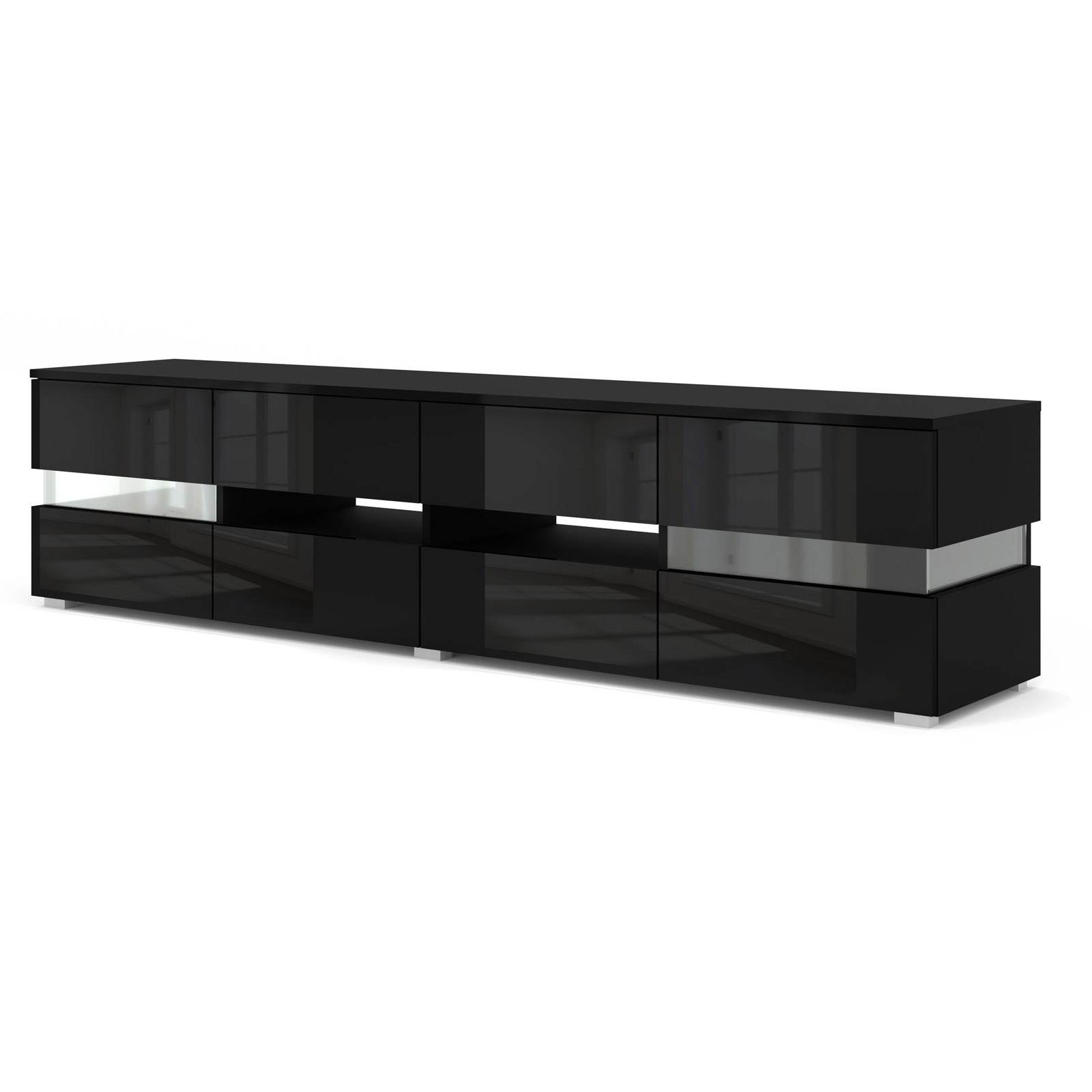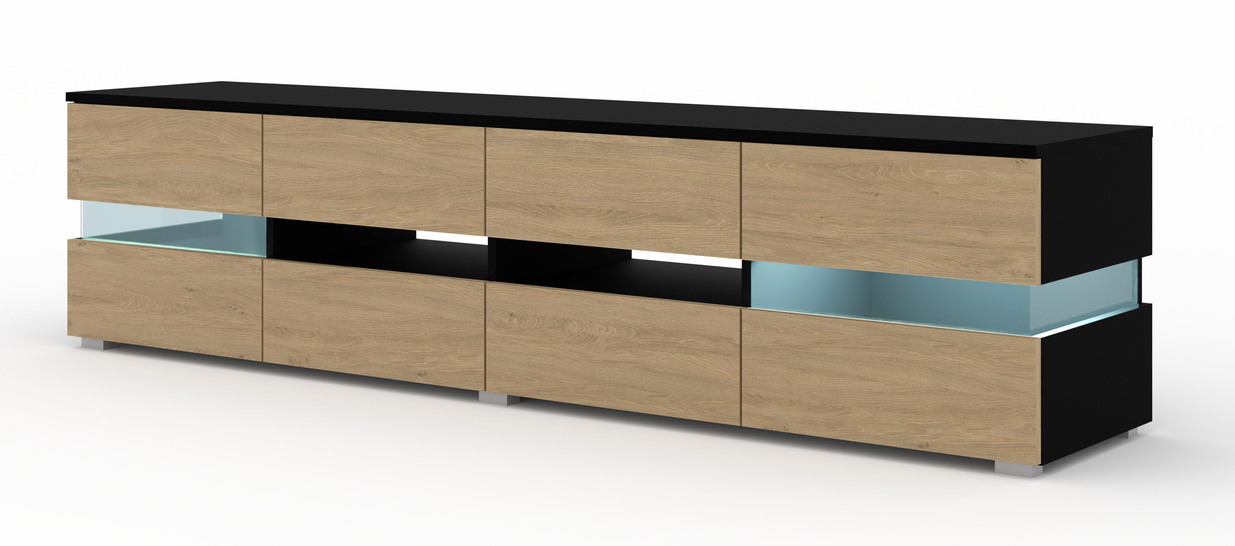 VIPER to jednak nie tylko estetyka, ale przede wszystkim genialnie zaplanowana przestrzeń. Model ten oferuje niespotykaną w tej kategorii liczbę sześciu osobnych, zamykanych szafek. Taka konstrukcja pozwala na mistrzowską organizację domowego centrum rozrywki – każdy przedmiot, od kabli i ładowarek, po gry i sprzęt audio, znajdzie tu swoje stałe miejsce. Dodatkowym atutem są przezroczyste szyby dzielące fronty oraz boki szafki. To rozwiązanie nadaje meblowi lekkości i pozwala na subtelne wyeksponowanie zawartości wnęk, co czyni szafkę dynamicznym elementem wystroju.