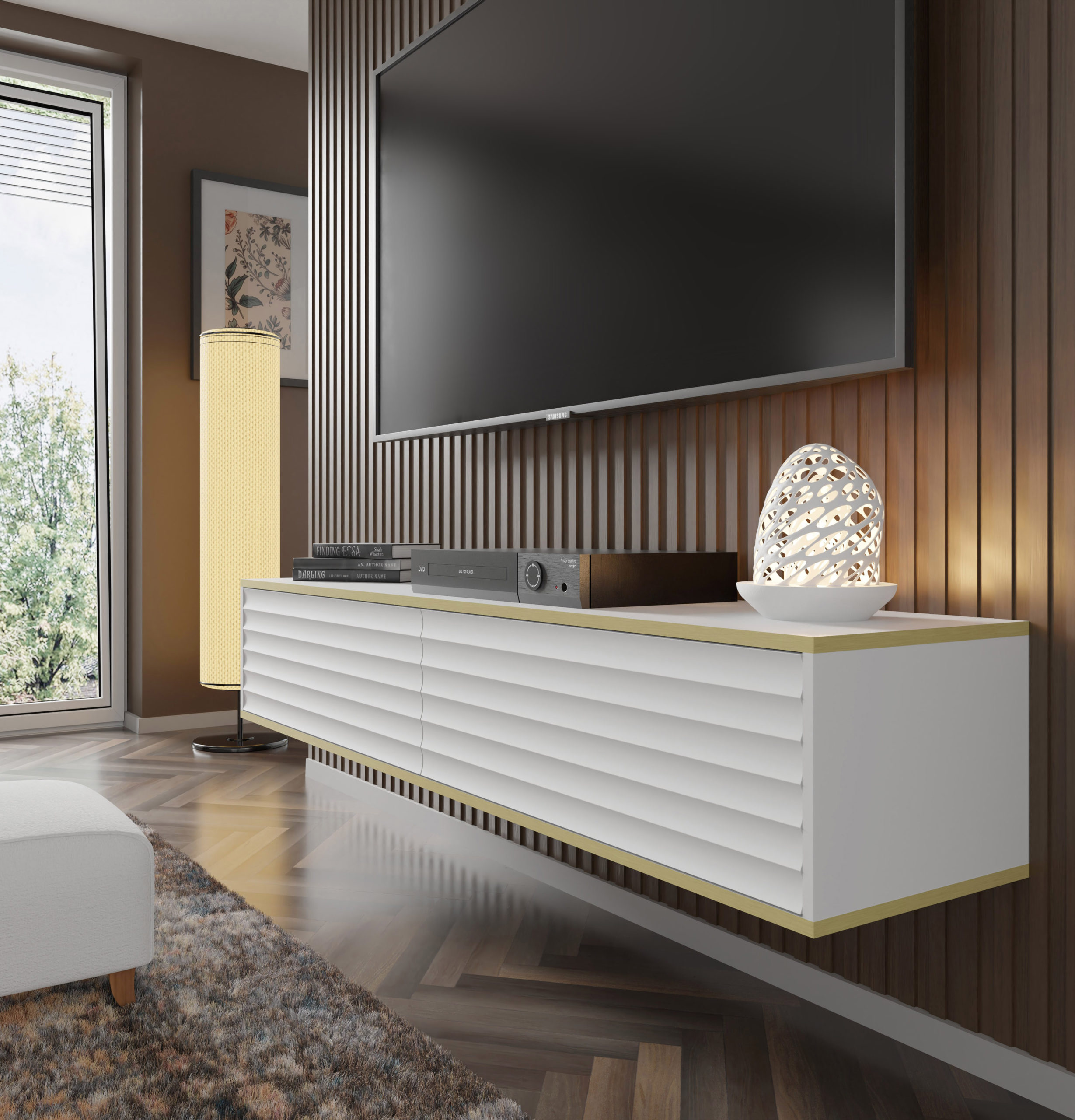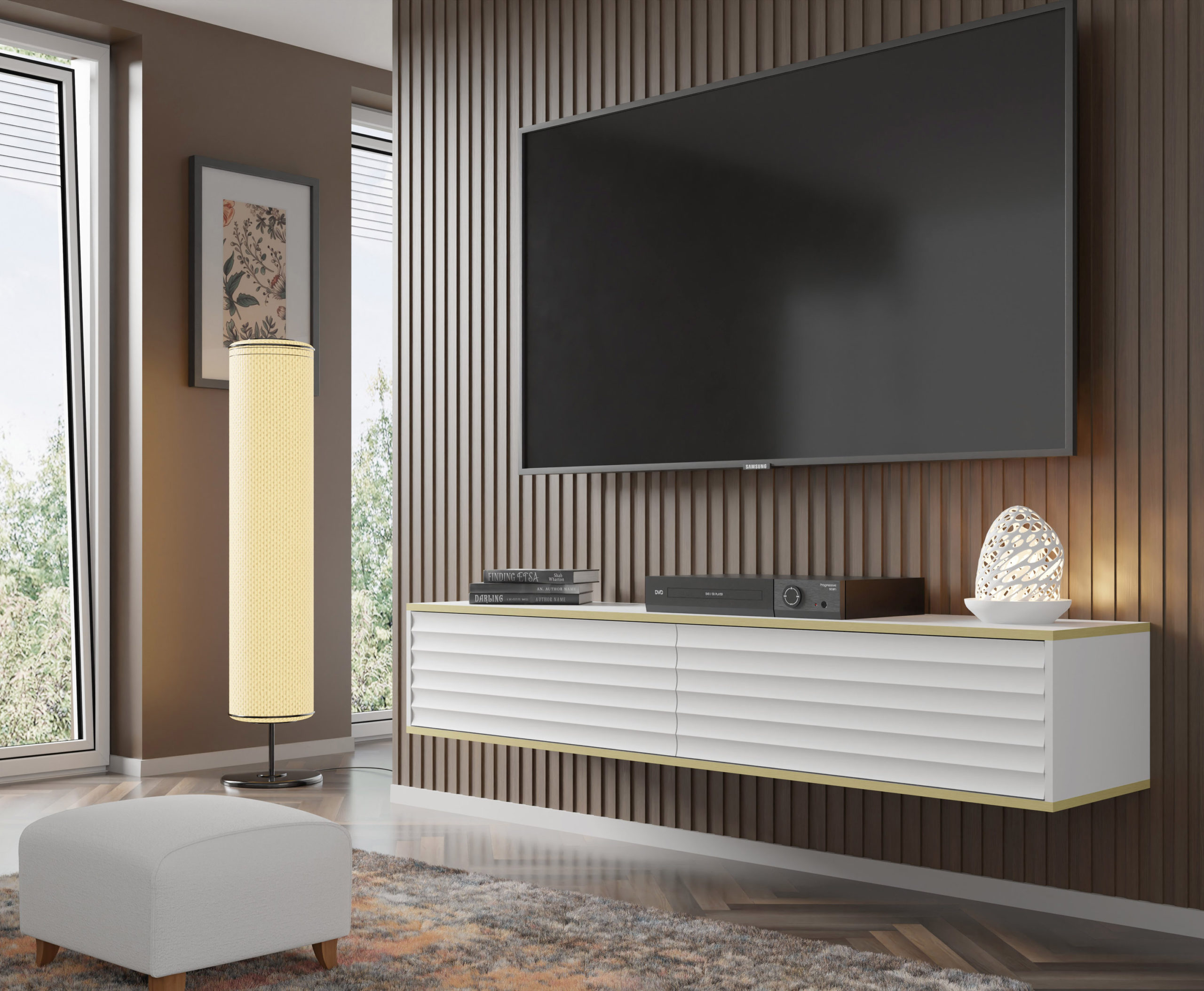Szafka RTV WABI to prawdziwe dzieło sztuki użytkowej, które redefiniuje pojęcie nowoczesnego salonu. Jej najbardziej charakterystycznym elementem są frezowane fronty z efektem 3D, które w połączeniu z subtelną złotą obwódką tworzą kompozycję pełną prestiżu i harmonii. Dzięki szerokości 180 cm i wiszącej konstrukcji, mebel ten staje się lekką, a zarazem pojemną bazą pod Twój telewizor. Wyposażona w bezuchwytowy system PUSH TO OPEN, szafka WABI oferuje czystość formy i najwyższy komfort użytkowania. Wybierz matową biel wzbogaconą o złoty blask i nadaj swojemu wnętrzu unikalny, trójwymiarowy charakter.