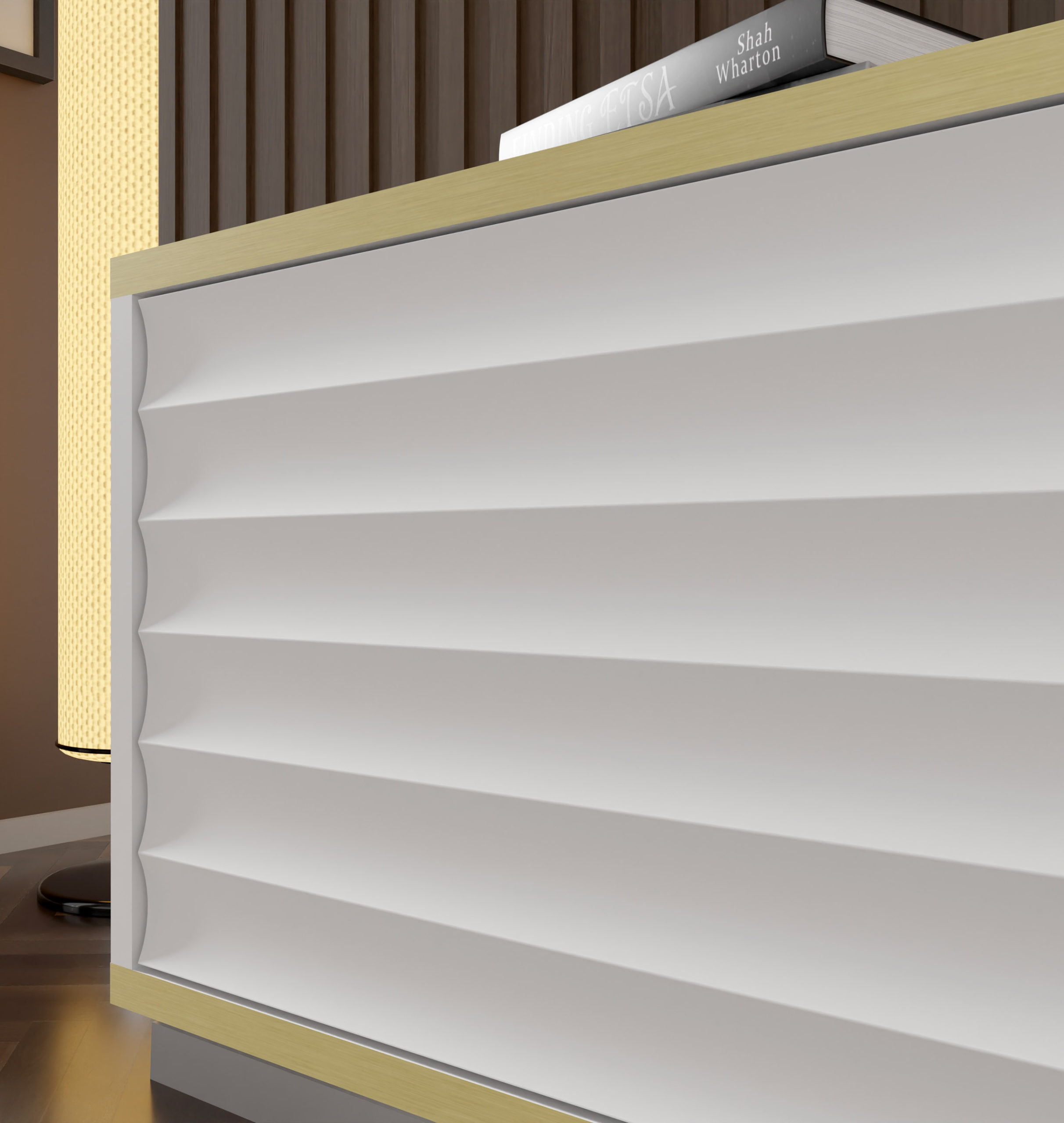 Jeśli szukasz mebla, który wykracza poza ramy zwykłego przechowywania, szafka RTV WABI z pewnością skradnie Twoją uwagę. To projekt, w którym nowoczesny minimalizm spotyka się z finezyjną dekoracyjnością. Matowa biel korpusu i frontów została tu potraktowana jako płótno dla geometrycznych frezowań, które pod wpływem światła tworzą fascynujący efekt 3D. Całość została oprawiona w delikatną, złotą obwódkę – ten subtelny, biżuteryjny akcent sprawia, że szafka prezentuje się niezwykle luksusowo, stając się centralną ozdobą ściany multimedialnej.