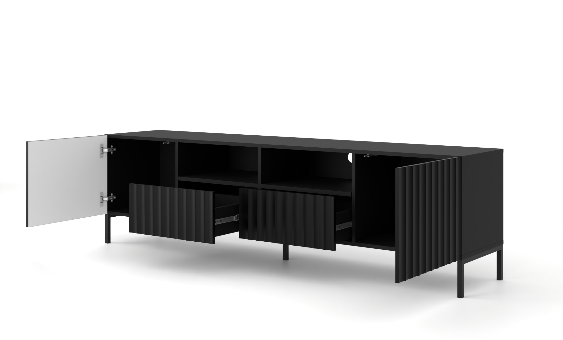 Szafka RTV Wave o szerokości 200 cm to manifest nowoczesnego luksusu, który zamieni Twój kącik telewizyjny w prestiżową strefę multimedialną. Głęboka, matowa czerń bryły została przełamana rzeźbiarskim wzorem obłych frezowań, nadających fasadzie niespotykaną dynamikę. Dzięki przemyślanej konstrukcji, łączącej zamykane szafki, szuflady oraz otwarte wnęki z otworem na kable, mebel perfekcyjnie organizuje technologię, ukrywając ją za minimalistycznymi frontami push to open. Osadzona na wysokich metalowych nóżkach, szafka Wave to fundament stylu, który harmonizuje z największymi ekranami, oferując design najwyższej próby.