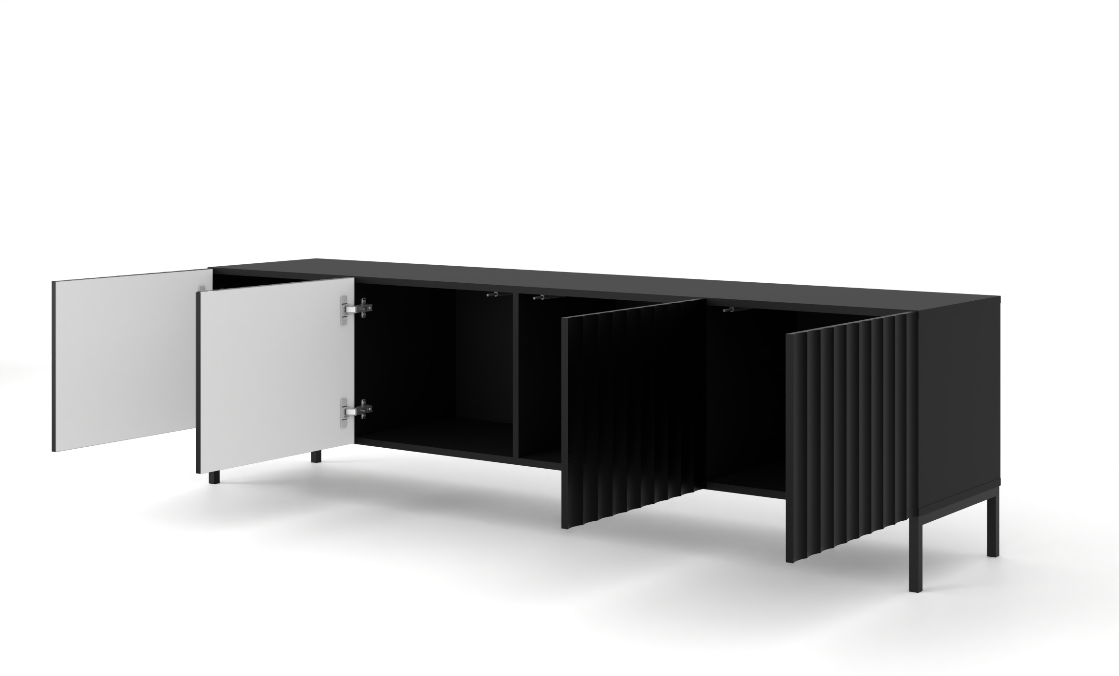 W tej odsłonie modelu Wave postawiono na absolutną dyscyplinę formy. Cztery pełne, zamykane szafki pozwalają na stworzenie strefy rozrywki wolnej od widoku kabli, konsol czy pilotów. Cała zawartość zostaje ukryta za rzeźbiarską fasadą, co sprzyja wyciszeniu i skupieniu uwagi na relaksie. Dzięki zastosowaniu mechanizmu push to open, szafka nie wymaga uchwytów – wystarczy lekkie dotknięcie frontu, by płynnie uzyskać dostęp do przestronnego wnętrza. To inteligentne połączenie estetyki z funkcjonalnością, które docenisz podczas każdego wieczornego seansu.