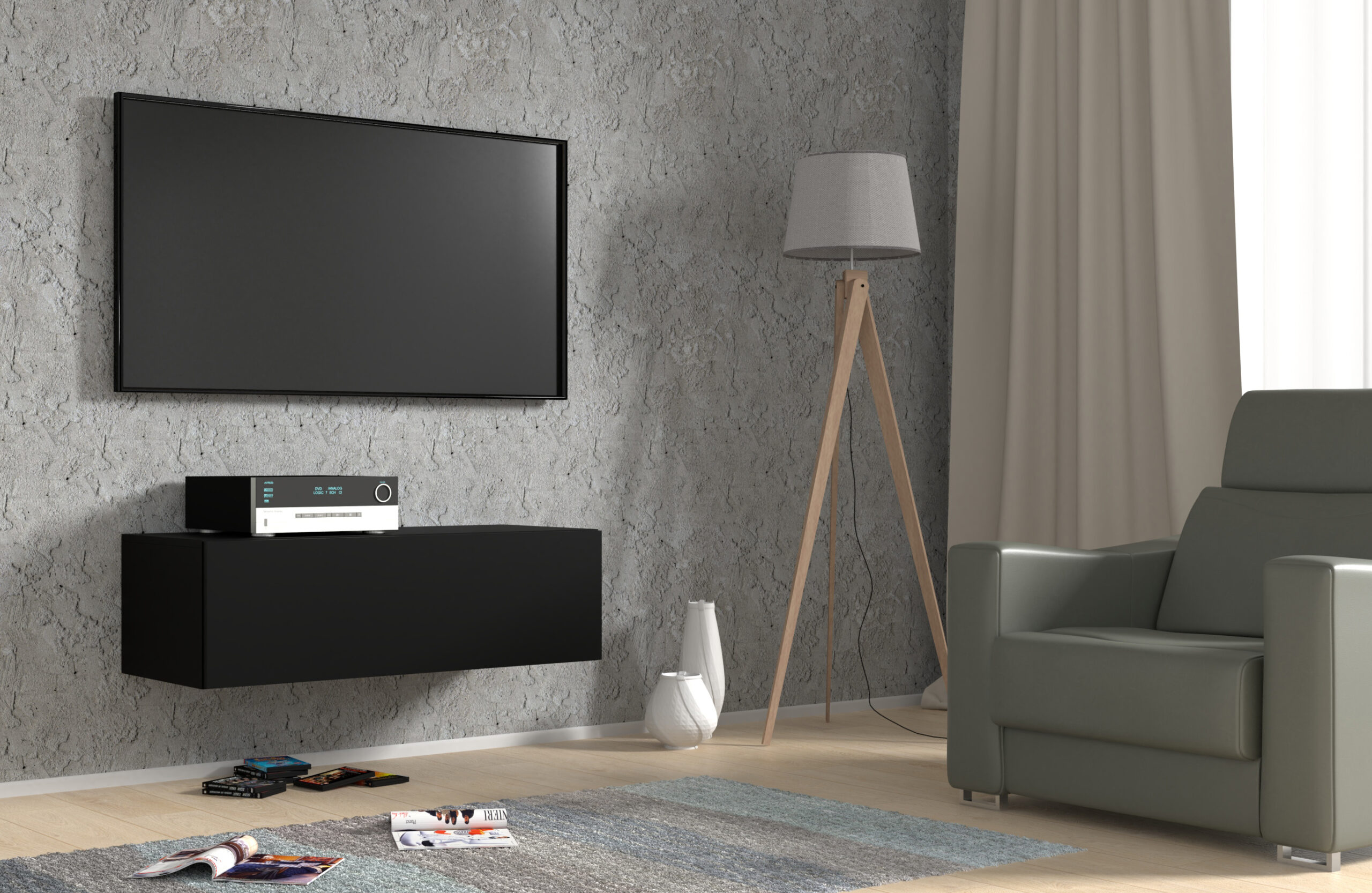 Wyobraź sobie salon, w którym panuje idealna harmonia, a strefa rozrywki staje się centralnym punktem estetycznym całego domu. Wisząca szafka RTV w kolorze czarnego matu to projekt stworzony z myślą o miłośnikach nowoczesnych, uporządkowanych wnętrz. Dzięki podwieszeniu mebla nad podłogą, zyskujesz nie tylko wizualną lekkość pomieszczenia, ale również ułatwiasz sobie codzienne dbanie o czystość. Głęboki, matowy odcień czerni dodaje aranżacji szlachetności, stanowiąc doskonałe tło dla Twojego sprzętu multimedialnego.