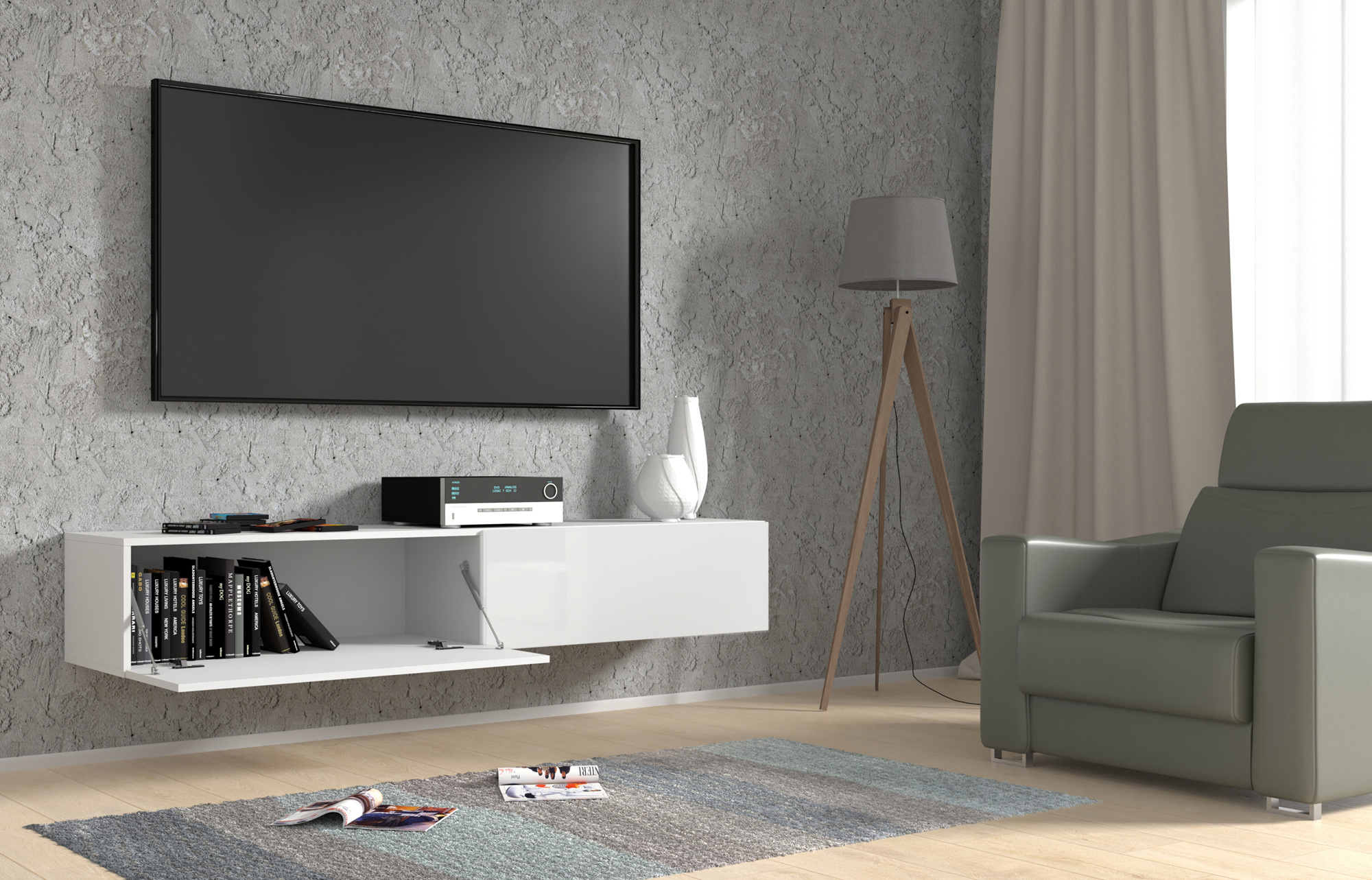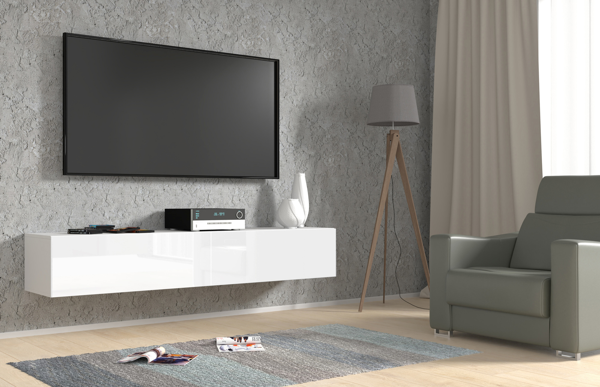 Rozświetl swój salon z szafką RTV BINGO, która łączy nieskazitelną biel z nowoczesną formą. Ten imponujący, 180-centymetrowy mebel wiszący wprowadza do wnętrza harmonię i optyczną lekkość, dzięki zestawieniu matowego korpusu z lśniącymi frontami w wysokim połysku. Praktyczna klapa otwierana do dołu skrywa dwie pojemne komory, idealne na Twój sprzęt multimedialny. To doskonały wybór dla miłośników stylu skandynawskiego i minimalistycznego, którzy szukają solidnej konstrukcji o eleganckim wykończeniu. Postaw na świeżość i zyskaj przestrzeń, która zachwyca blaskiem.