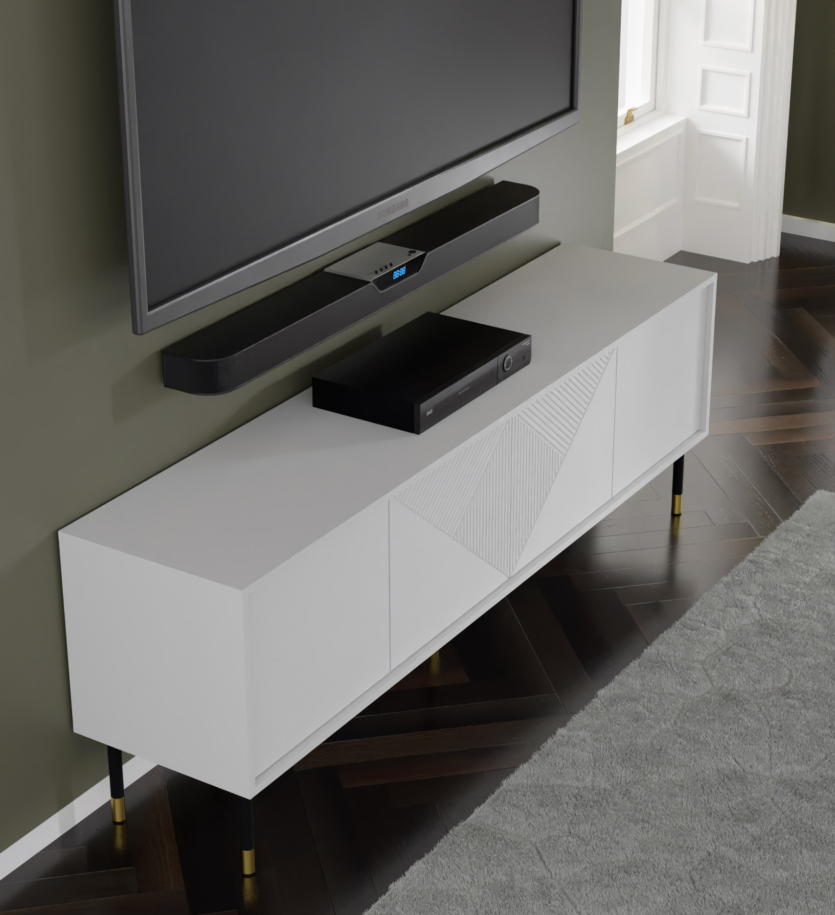Kolekcja Woody w wersji białej to propozycja dla osób, które pragną wprowadzić do swojego salonu harmonię, światło i najwyższej klasy wzornictwo. Prezentowana szafka RTV o szerokości 180 cm to mebel, który optycznie powiększa wnętrze, stając się jego subtelną, a zarazem niezwykle efektowną dominantą. Cały sekret jej uroku tkwi w precyzyjnym frezowaniu frontów – unikalny, geometryczny wzór trójkątów sprawia, że biała powierzchnia nieustannie gra ze światłem, tworząc fascynujące efekty wizualne i przełamując minimalistyczną formę bryły.