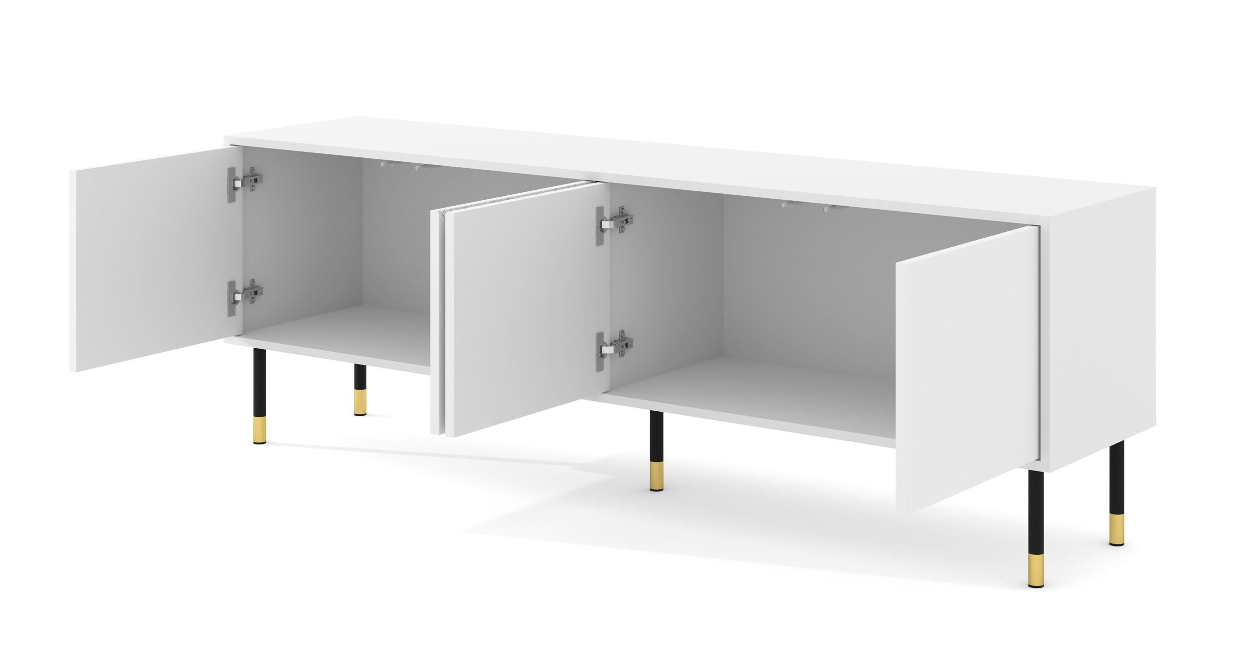 Biała szafka RTV Woody to kwintesencja nowoczesnej świeżości, która zamieni Twój kącik multimedialny w jasną, luksusową przestrzeń. Ta imponująca, 180-centymetrowa konstrukcja wyróżnia się artystycznie frezowanymi frontami MDF w geometryczny motyw trójkątów, które nadają matowej bieli trójwymiarowego charakteru. Całość osadzono na wysokich, czarnych nóżkach ze złotymi akcentami, co nadaje meblowi wizualnej zwiewności i prestiżowego sznytu. Wyposażona w bezuchwytowy system push to open, szafka Woody łączy nienaganną estetykę z potężną pojemnością, oferując idealne miejsce na sprzęt RTV w otoczeniu czystego, nowoczesnego designu.