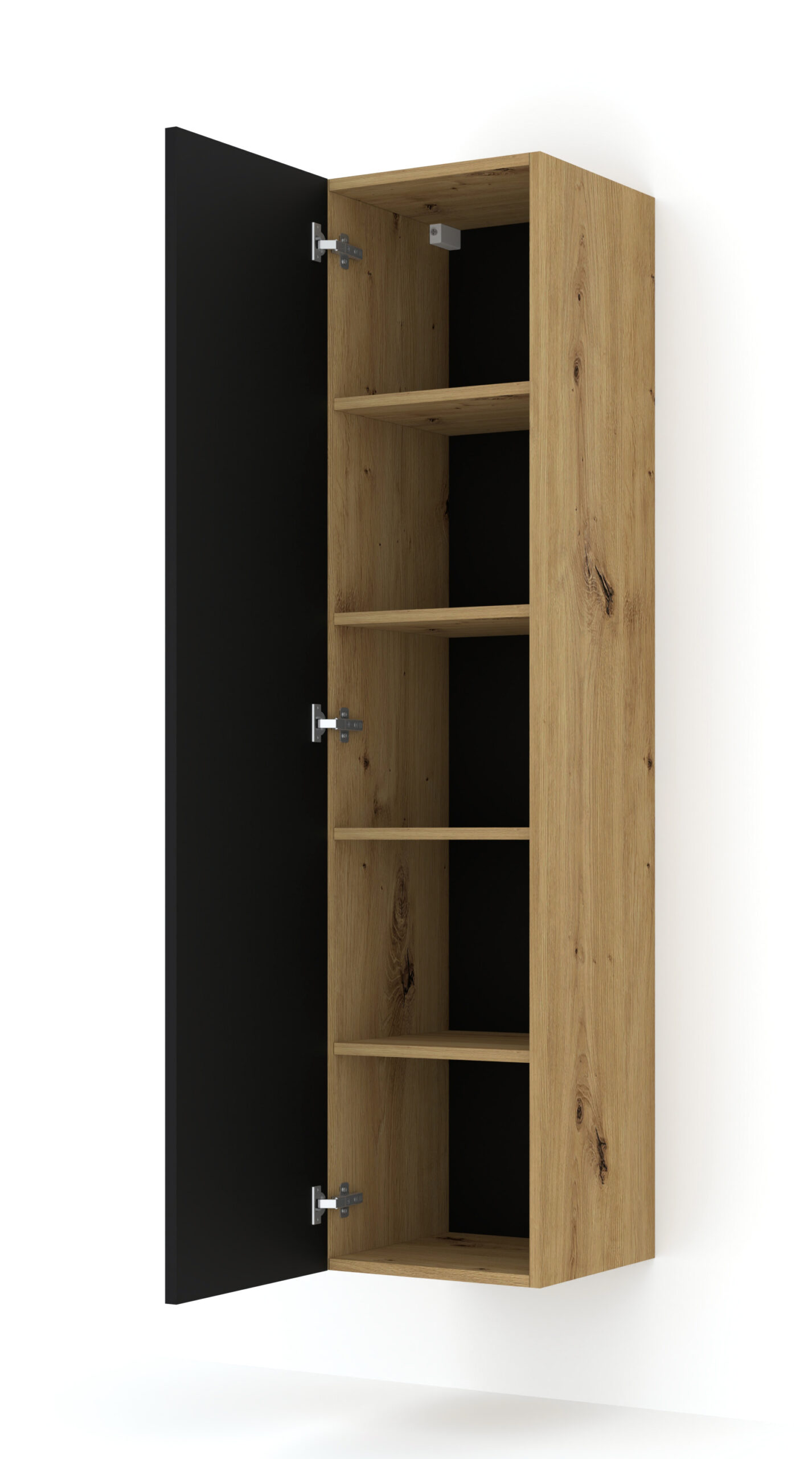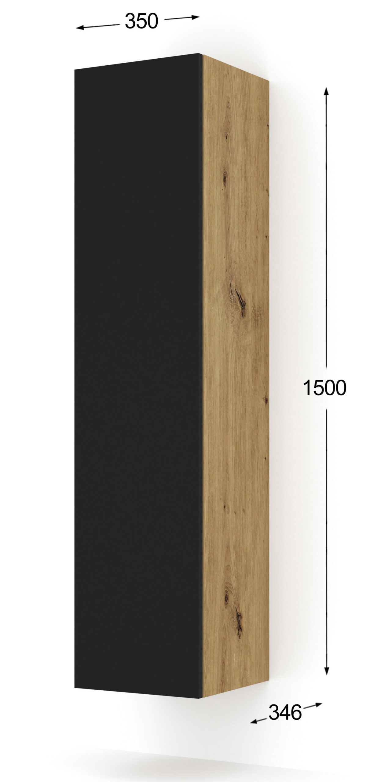 Szafka wisząca Duo o wysokości 150 cm to smukły i elegancki sposób na zorganizowanie domowej przestrzeni bez zajmowania miejsca na podłodze. Jej nowoczesna konstrukcja opiera się na stylowym kontraście ciepłego dębu artisan z matową, głęboką czernią frontu. Mebel został zaprojektowany z myślą o maksymalnej pojemności – wewnątrz kryją się cztery półki, które ułatwiają segregację przedmiotów w salonie, sypialni czy biurze. Wykonana z rzetelnej płyty laminowanej o grubości 16 mm i zabezpieczona obrzeżem ABS, szafka Duo stanowi trwały i wyrazisty akcent, który nadaje wnętrzu lekkości oraz loftowego charakteru.