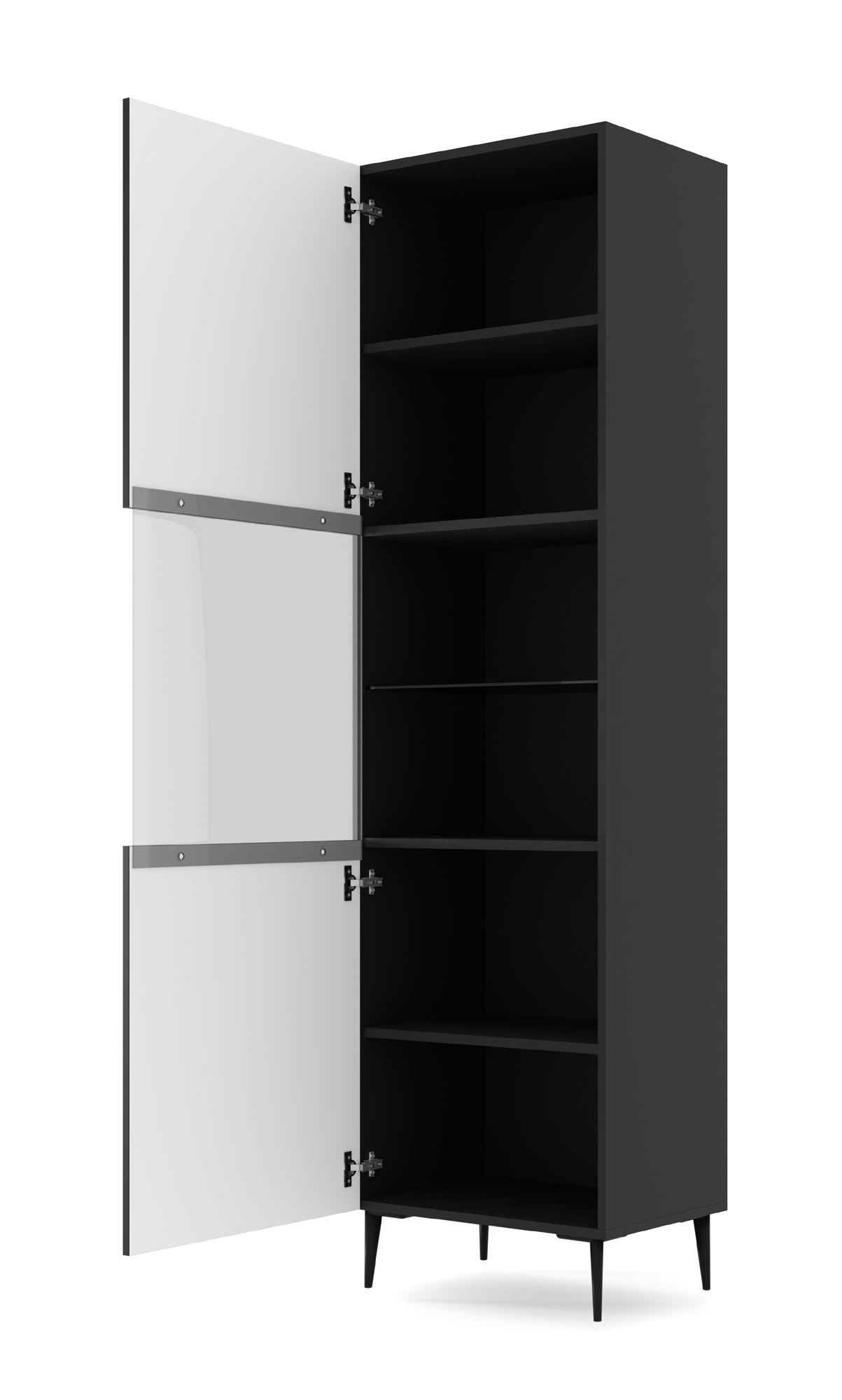 Wnętrze witryny to przemyślany system pięciu półek, zaprojektowany tak, by maksymalnie wykorzystać dostępną przestrzeń. Centralnym punktem jest szklana półka, która w duecie z przeszklonym frontem tworzy idealne warunki do prezentacji dekoracji, oświetlonych naturalnym światłem wpadającym do pokoju. Funkcjonalność idzie tu w parze z ergonomią – mebel jest uniwersalny, co oznacza, że podczas montażu to Ty decydujesz, czy front ma być lewo-, czy prawostronny. Zastosowanie nowoczesnego systemu „push to open” sprawia, że wystarczy lekki nacisk dłonią, by uzyskać dostęp do wnętrza, co pozwoliło na całkowite zrezygnowanie z wystających uchwytów.