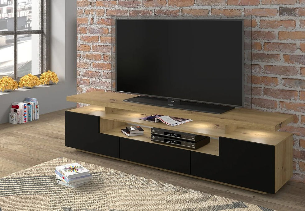 Skup się na trzech kryteriach: rozmiar (dopasuj szerokość do przekątnej ekranu), przechowywanie (ilość szuflad i półek - jeśli masz sprzęt audio, wybierz większą szafkę) oraz wentylacja (urządzenia elektroniczne potrzebują przepływu powietrza). Jeśli zależy Ci na klimacie wnętrza, wybierz modele z oświetleniem LED lub kontrastującymi wykończeniami (czarny połysk, biały mat, dąb).
